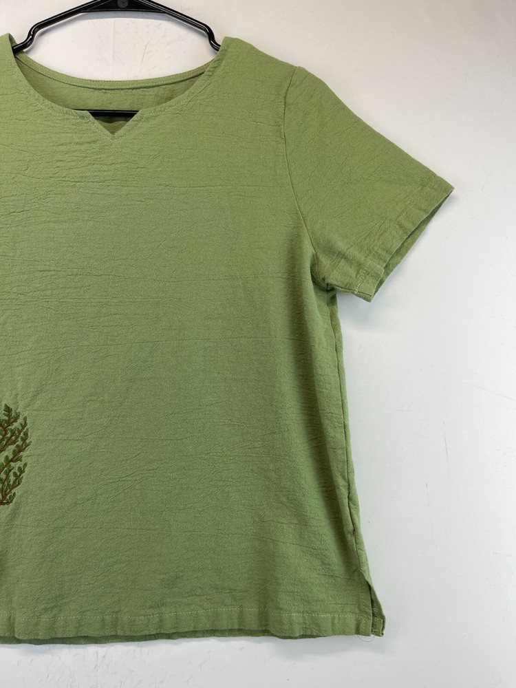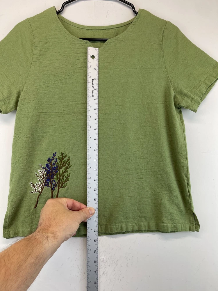 This olive green polyester shirt for women features beautiful embroidered flowers and a relaxed fit, making it perfect for any casual occasion. The short-sleeved blouse has a V-neckline and a pullover closure, making it easy to wear. It comes in a size M and is machine washable for easy care. The shirt is ideal for summer and spring seasons and is suitable for travel, party/cocktail, and outdoor activities. The bohemian and nature-inspired theme of the shirt makes it a perfect addition to any wardrobe. Made in China, this shirt is a must-have for any fashion-conscious woman. Very good preowned condition with no issues. Please see all photos. For clothing specifically, see photos for all measurements and/or any issues if applicable. Pay close attention to the measurements as the size of the garment may quite possibly be different than the actual measurement(s) due to washing, shrinkage, or stretching as these are used clothes. The size in the title is the size on the tag of the garment. See photos for measurements of actual measurements as they may differ. ALWAYS CHECK THE MEASUREMENTS IN THE PHOTOS. This will remove any questions on measurements as well as always cover the possibility of human error in the listing(s) in the case of a typo or oversight. All clothing has been washed and comes from a smoke free environment. I am available for questions. I accept or negotiate reasonable offers. Have an amazing day. Thank you.