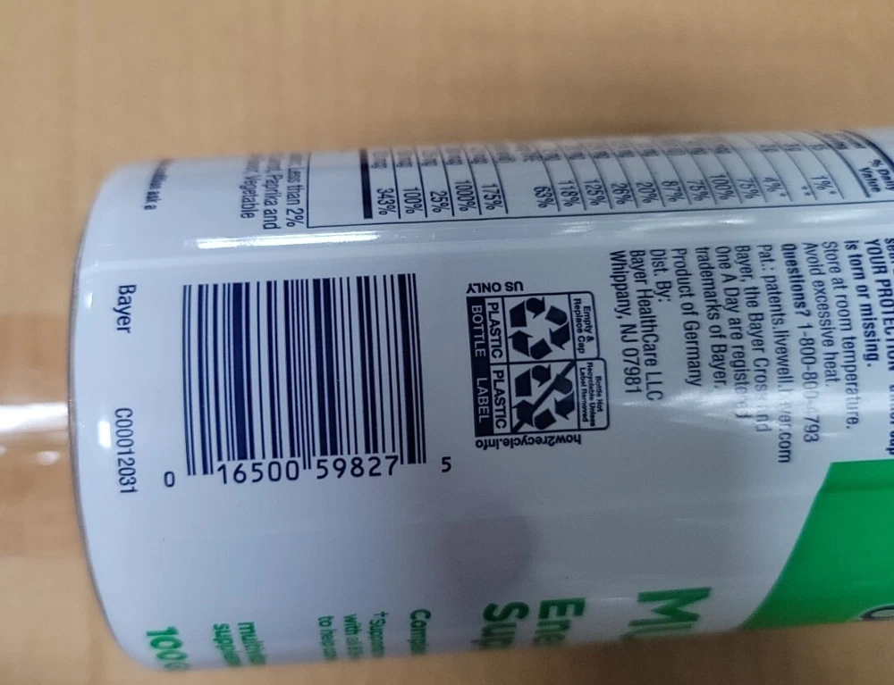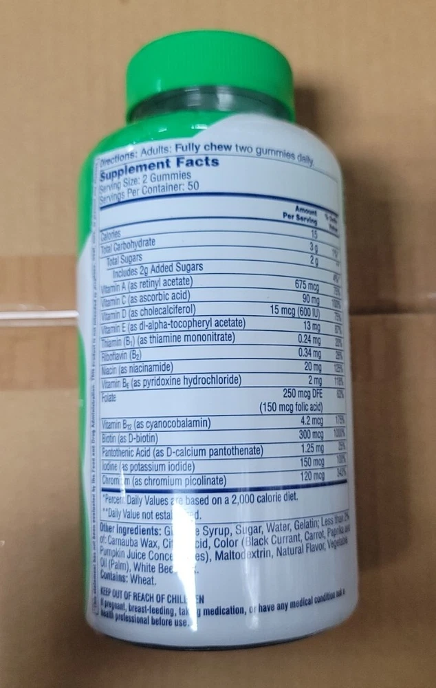 Number of Pills:100Formulation:GummyDepartment:UnisexExpiration Date:12/2024Country/Region of Manufacture:GermanyNutrition Facts Label:YesMain Purpose:Energy Support, Rejuvenate and Support Energy & Overall DigestiveType:MultivitaminIngredients:Multivitamingtin13:016500598275Active Ingredients:VitaminsBrand:One A DayUPC:016500598275When to Take:AnytimeFeatures:No Artificial Colors, No Artificial Flavors, No Artificial Sweeteners, No High Fructose Corn Syrup, Contains Wheat