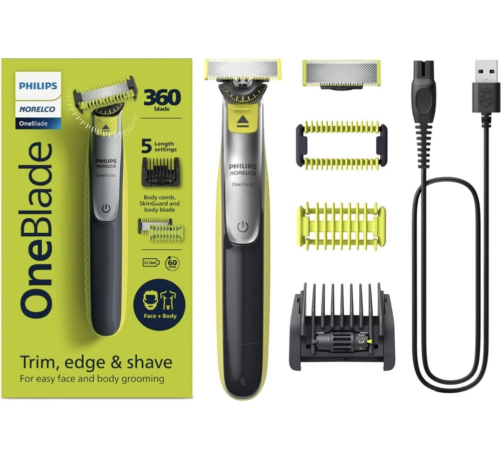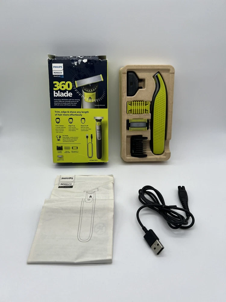 One Blade. philips Norelco 360blade 5length settings Q3(21) Used, tested still in good condition. Rechargeable OneBlade 360 Face plus Body can trim, edge, and shave any length of hair. Shave is not too close so your skin stays comfortable. The innovative 360 Blade can flex in all directions to adjust to the curves of your face. The design enables constant skin contact and control. Includes 2 blades, 1 360 blade for your face and 1 blade for your body. Use wet or dry, with or without foam. Click-on skin guard for extra protection on sensitive areas, even below the belt. Includes a 5-in-1 stubble comb plus 1 body comb for an even trim on face or body USB-A charging cable included (wall power adapter not included). Subscribe and Save on Philips Norelco OneBlade 360 replacement blades and save up to 15 percent . Includes: 1 handle, 1 360 blade for face, 1 blade for body, 1 5-in-1 comb for face, 1 skin guard for body, 1 body comb, 1 USB-A charging cord (wall power adapter not included), 1 protective cap. 2023 Men’s Health Award winner for “Best Electric Razor”