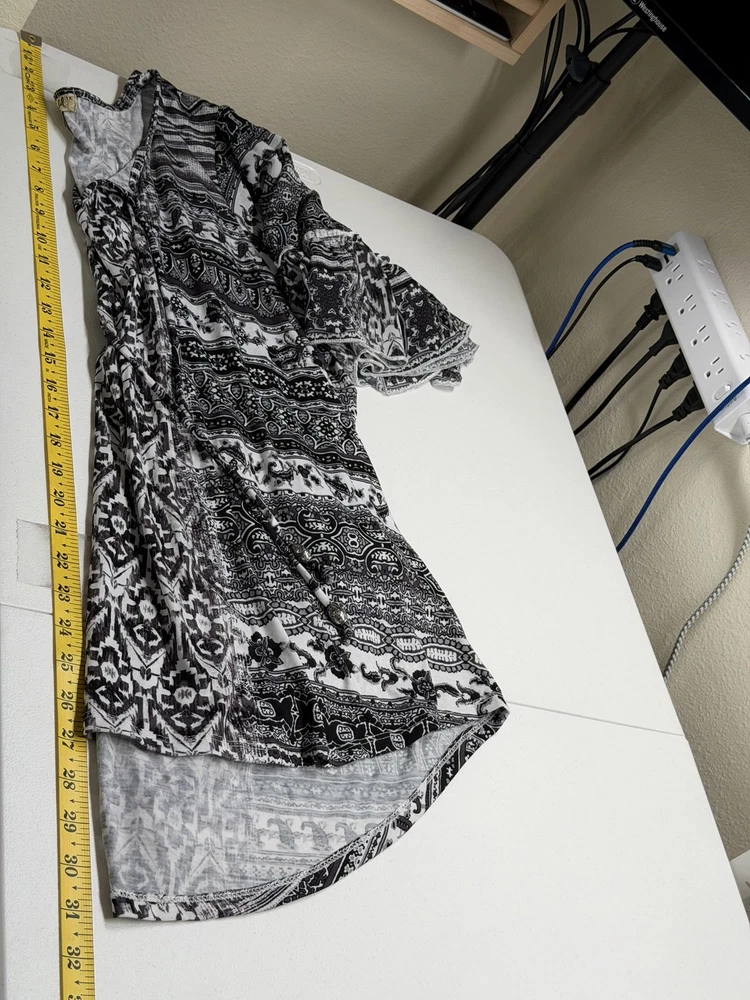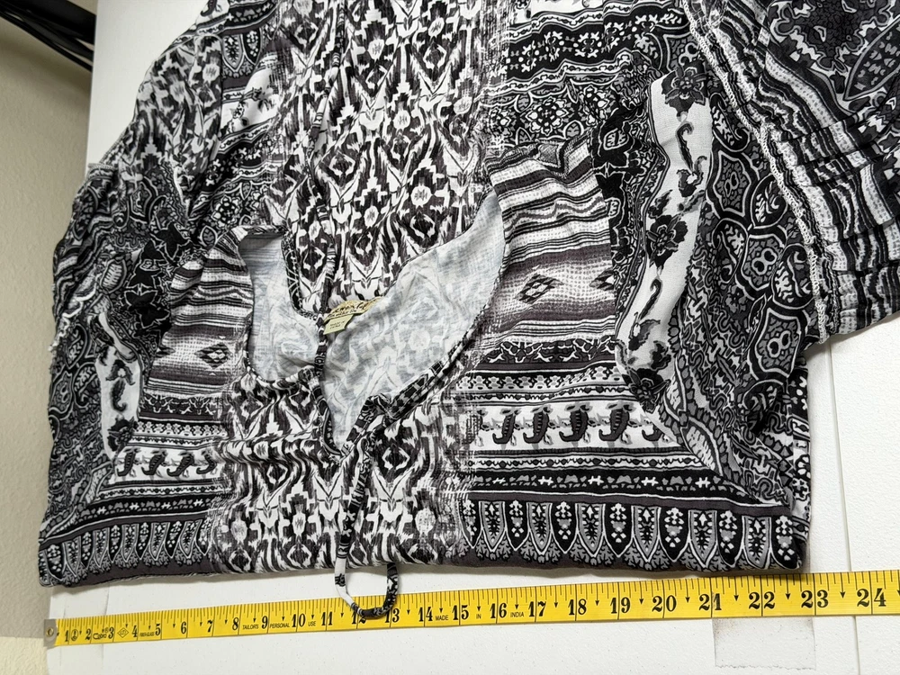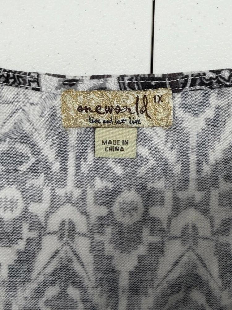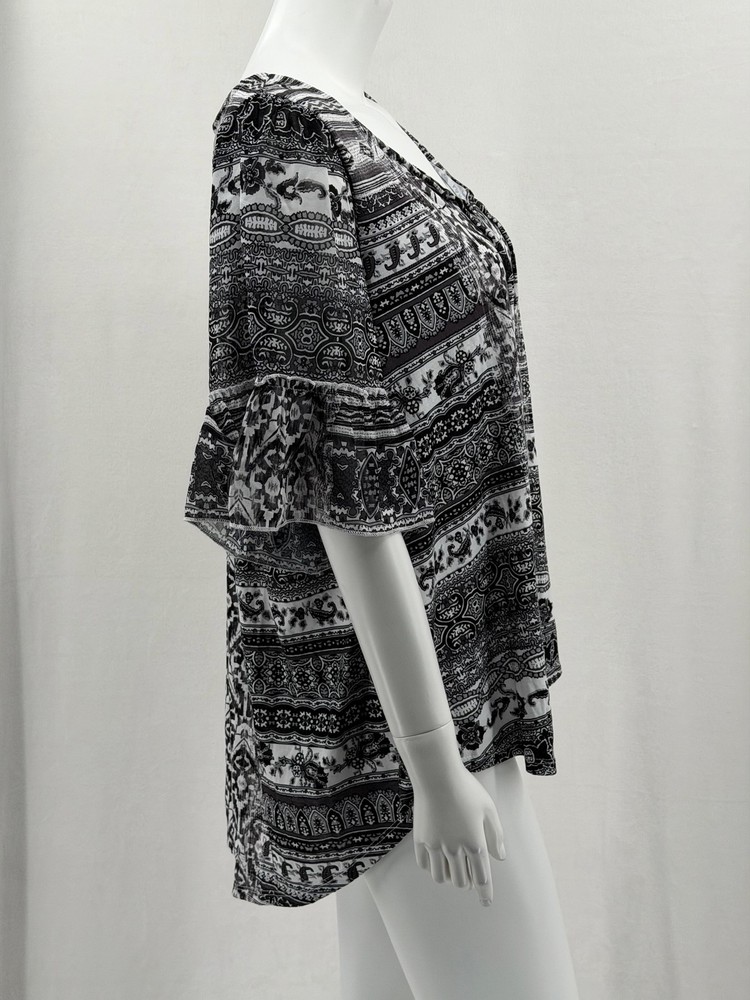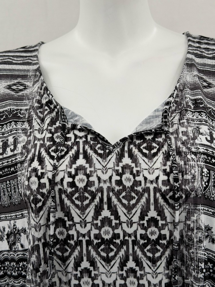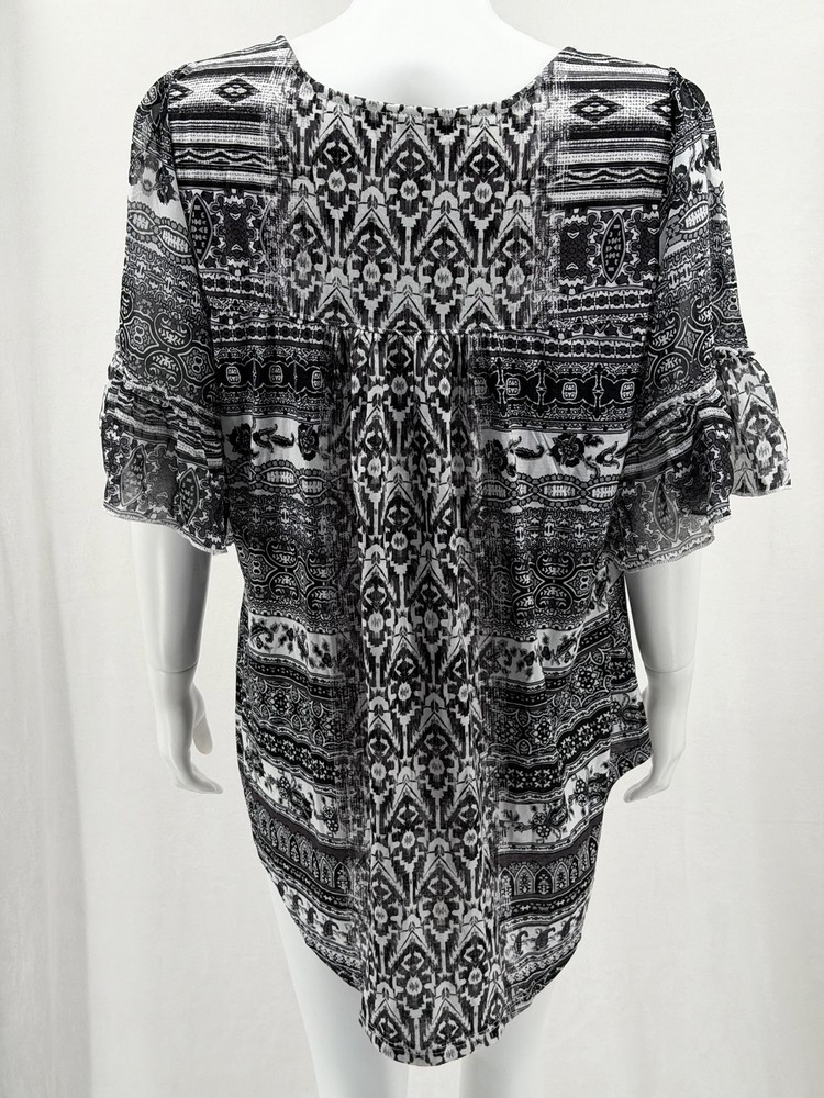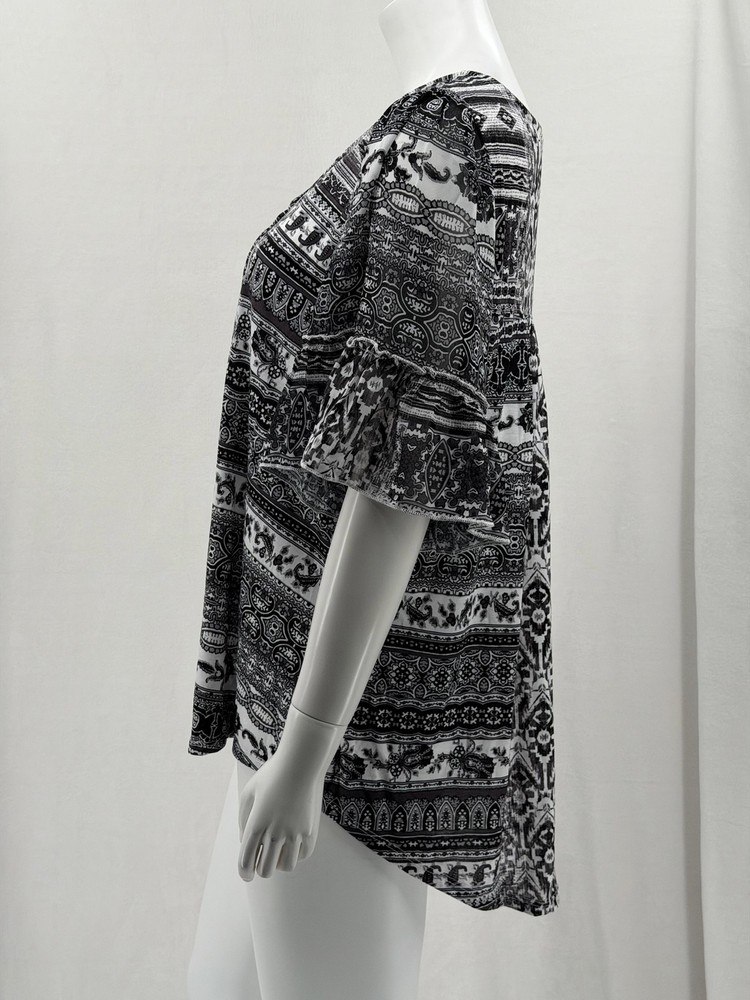 One World Top Womens 1X Black White Boho Half Bell Sleeve Stretch Peasant Hi Lo Excellent preowned condition (see photos for more details and measurements) Bohemian Flowy Comfortable Travel Vacation Lightweight