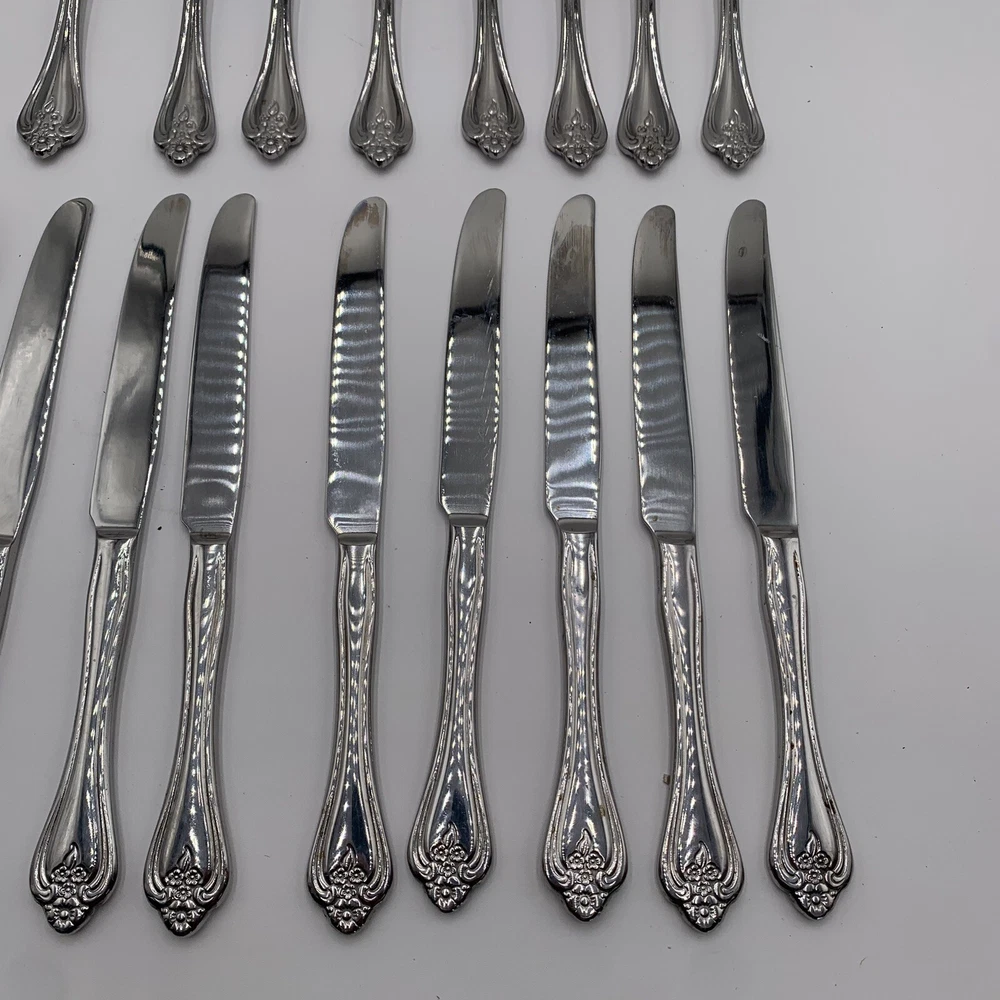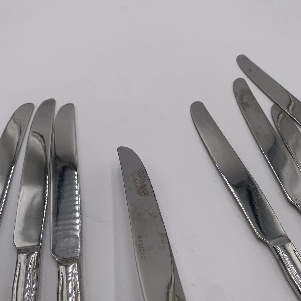 Oneida BOUTONNIERE Glossy Stainless Dinner Knives Forks Spoons Flatware Set!! ****See pictures for imperfections some dark marks. Might be able to be polished Dinnerware, flatware, set, silverware