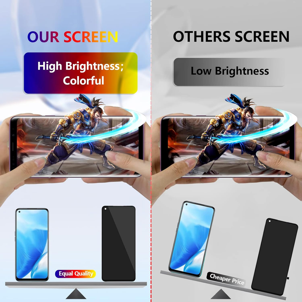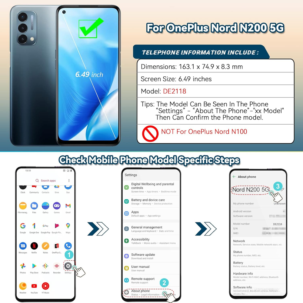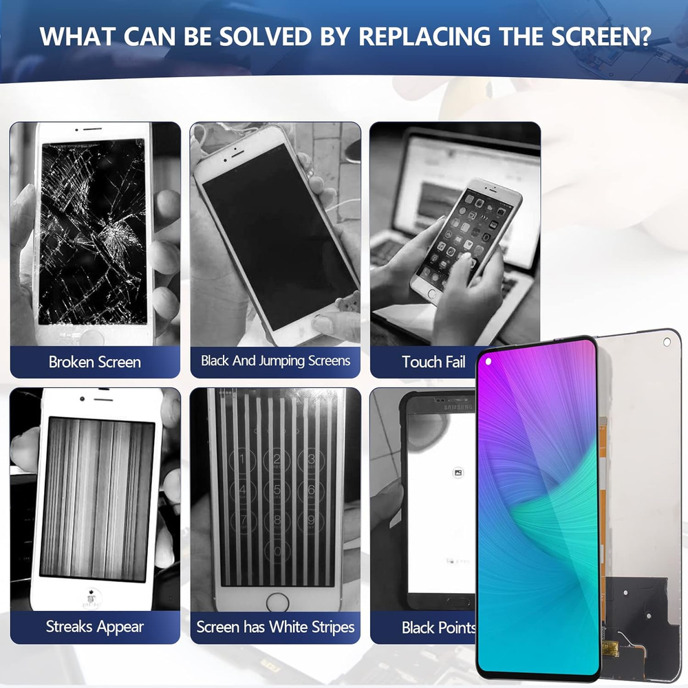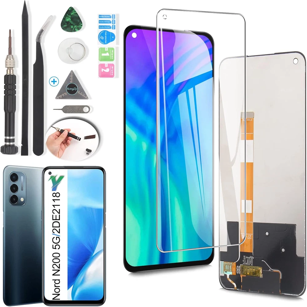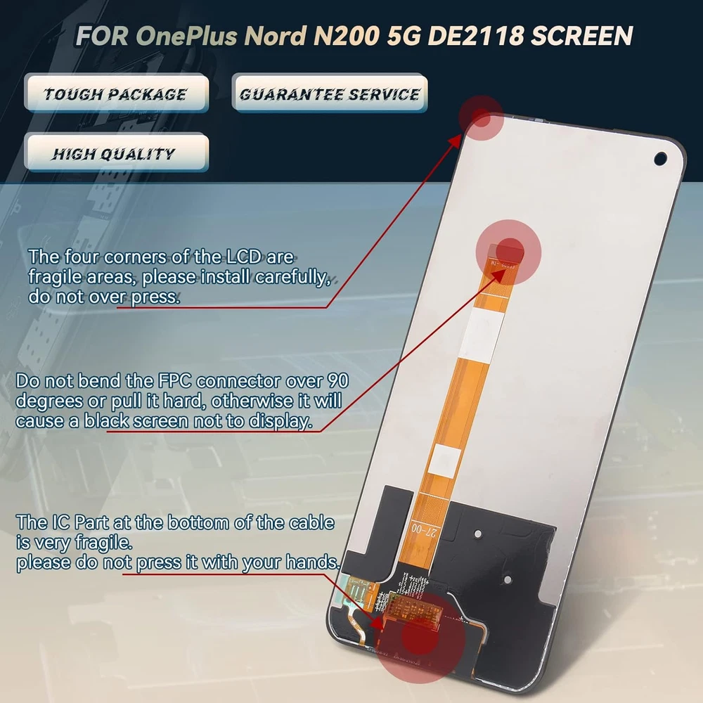 Compatibility :For OnePlus Nord N200 5G DE2118 LCD Display.Please make sure your phone model before purchase. Application : Use for fix a faulty screen,and cure-replace cracked, broken, dead pixels, touch is not working, touch response issues, display problems,wrong color issues ,non-functional screen.etc. Quality Guarantee :All products have passed strictly QC double tested and 100% in good condition before shipment.To Make sure no scratch/no dead area/ no dot pixel or line in the screen. Repair Tools :High quality for OnePlus Nord N200 5G DE2118 LCD screen replacement and repair tools,help to install more convenient and easily. Our screens are packed in strong boxes,avoid damage during shipping. Installation Suggestions :Please test the screen before installation, make sure the screen is normal to use.Not recommend Installation without any experiences.If you need help and link of installation guide video,please leave a message. Product Description Screen Replacement For OnePlus Nord N200 5G Help to replace the new screen to make the phone look like new one. 1 Damage Scene: 2 Cracked or Broken 3 Touch Not Sensitive 4 Not Show Normal 5 Black Screen 1 Confirm the Model 2 Product Advantages 3 Good Quality Control 4 Advanced Tools 5 Service Guaranteed Test Before Installation Pay attention to electrostatic problems during the test, otherwise you will feel that the touch is not sensitive. Striped/Black Screen/Non Touch The LCD screen connector may not be tight. Try to reinstall the connector cable. Don't Touch IC Please do not touch the IC position. This is precision component, otherwise it will cause the screen not to display. Last Step of the installation Because the screen need to stick completely to frame, please use the elastic or fix tools to fix the screen for 3 to 4 hours. How about the screen quality? We provide professional LCD screens. All products have passed a strict quality inspection before shipment. Does it comes with installation guide? If you need the link of the installation video guide, we will send you an installation link that we suggest. Or you can scan the code from our package. After installation, the phone will be turned off when on the calling. Please check whether your induction holes are blocked by foreign bodies, just clean up. After the installation, the stripes appear, and I re -connected the FPC cable, but the line still not disappear. In this case, please check whether in addition to the stripes, there are irregular black spots. If so, it means that the screen is damaged during the installation process and it is no longer available.