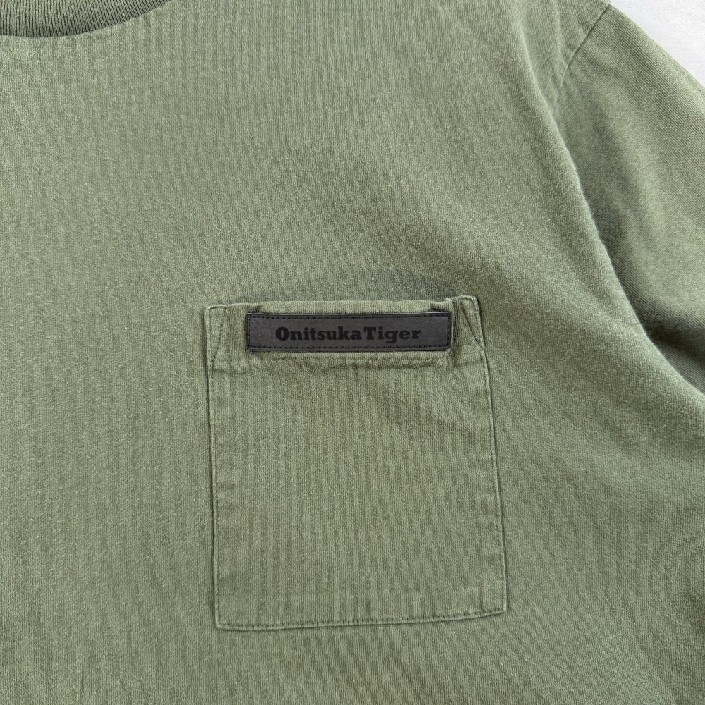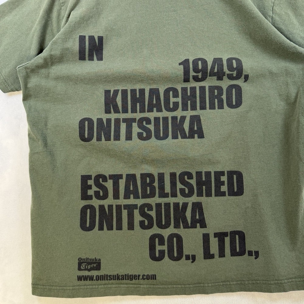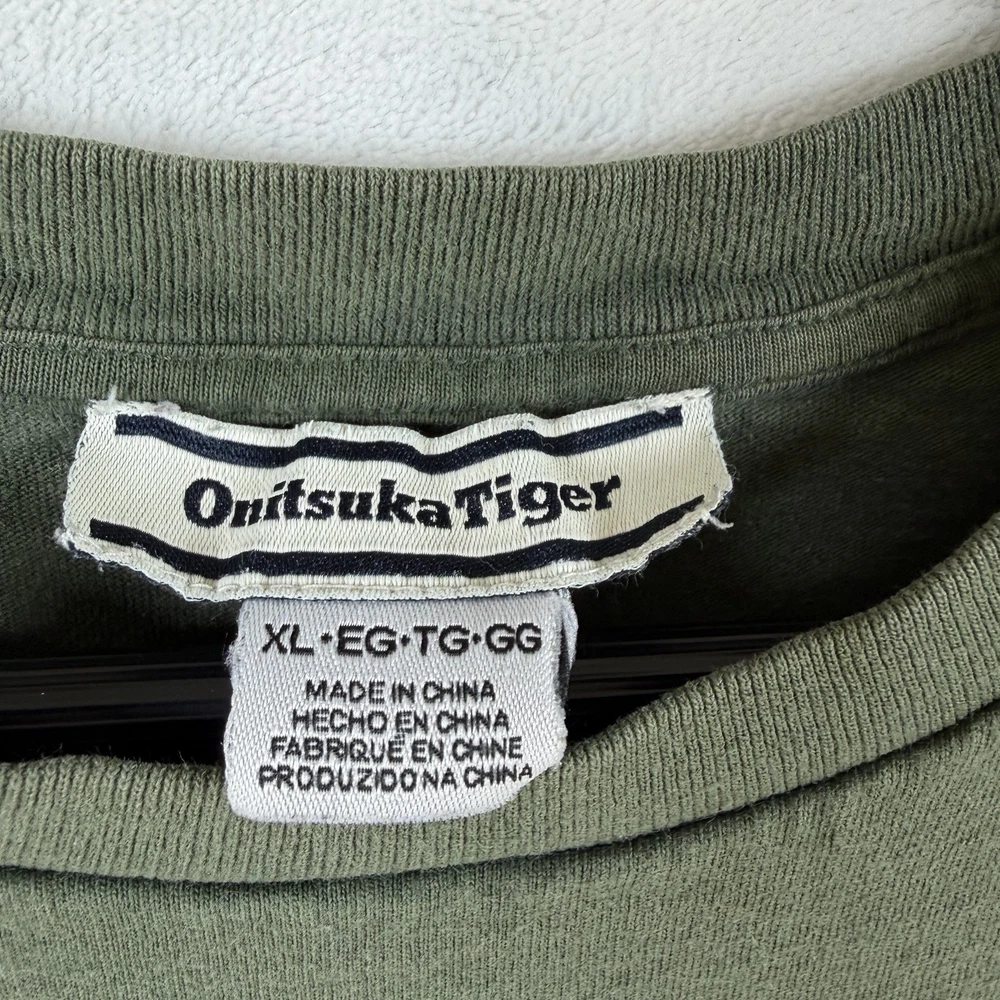 The Onitsuka Tiger Relaxed Fit Cotton Graphic Olive Green Men’s Size XL T-Shirt is a stylish and comfortable shirt perfect for spring and summer. Made from 100% cotton, this short sleeve tee features a crew neckline and a regular fit. The graphic print design with the Onitsuka Tiger logo adds a touch of accent to the overall look. This 2020-2029 manufactured shirt is a great addition to any man's wardrobe, offering both style and quality.