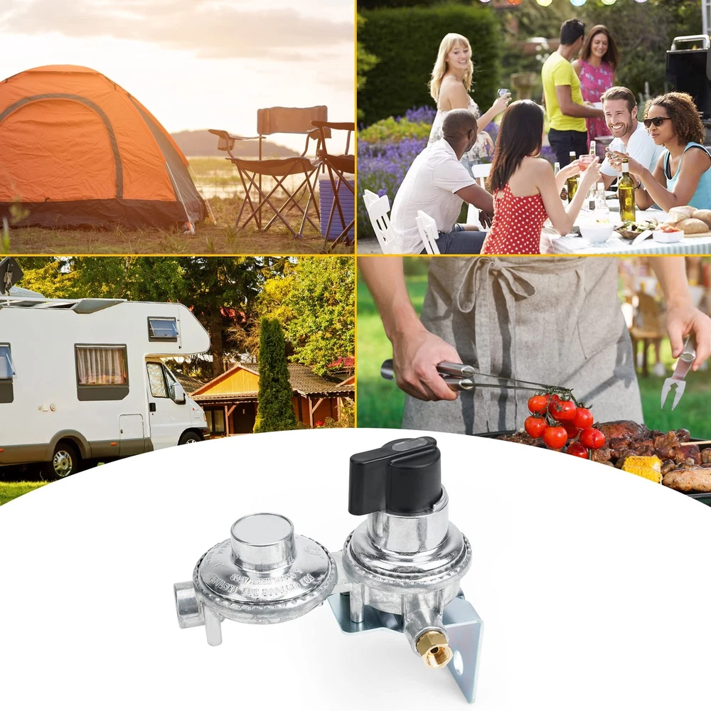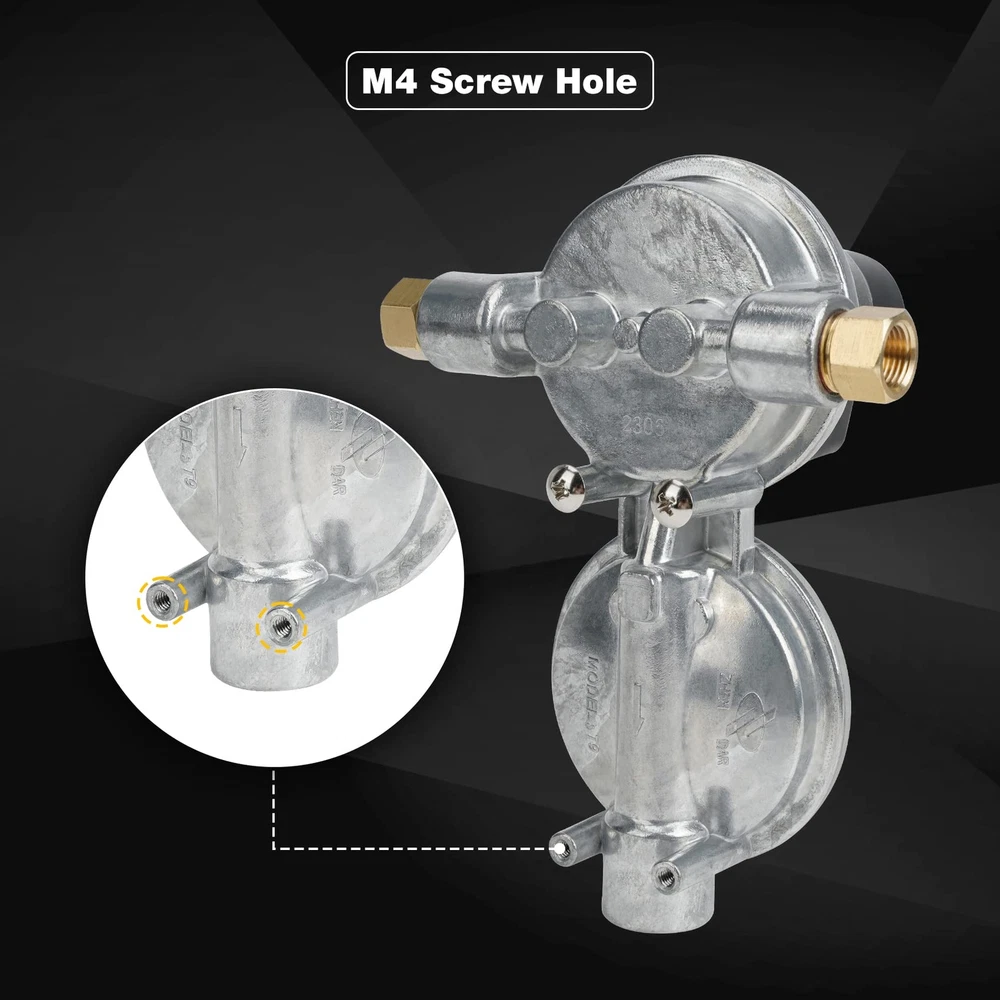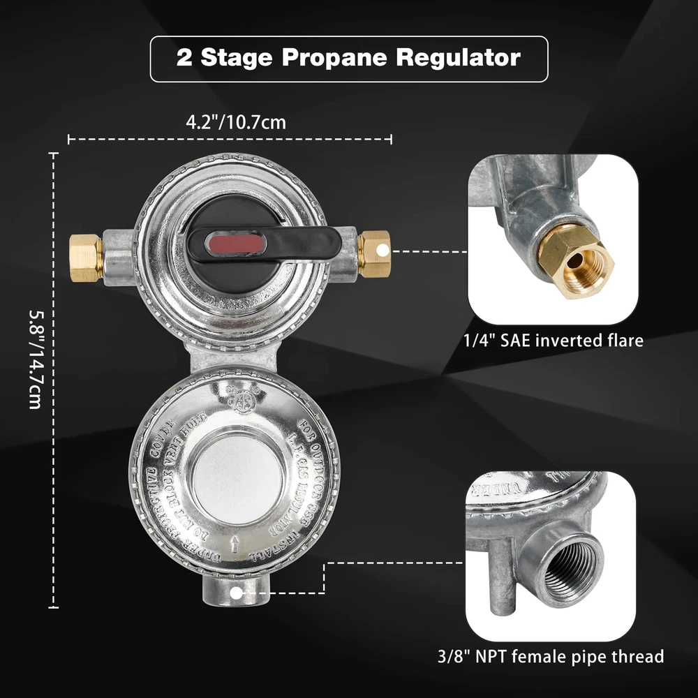 The indicator will read either green or red under normal conditions. The green just indicates that the primary tank still has propane. When the main tank is empty, the propane automatic switching regulator knob will turn red, reminding you to turn the knob to point to the backup tank, making it the main tank, and causing the indicator to switch back to green. The dual-stage design can maintain constant air pressure under changing needs and conditions. Allows empty tanks to be removed for refilling without interrupting the propane supply. In colder temperatures, you may see the indicator gauge read some red and some green. This is because the cold outdoor temps cause the pressure inside the cylinder to decrease. 【Uninterrupted Propane Supply】-Allow you to connect 2 propane tanks at the same time. When the main tank is empty, the propane automatic switching regulator knob will turn red to let you know when a tank has been depleted and needs to be refilled. Reminding you to turn the knob to point to the backup tank, making it the main tank, and causing the indicator to switch back to green. 【Regulator Mounting Bracket Design】-The LP gas regulator is already drilled with mounting holes (M4 thread) , and the propane regulator comes with L-Mount Regulator Mounting Bracket and Screws for added convenience. 【High quality Regulator】- LP gas regulators and joints are made of premium die-cast aluminum and solid brass, with good anti corrosion and heat-resistance performance to ensure safety and no leaks. 【Regulator Specifications】-The propane auto-changeover regulator has a 1/4" SAE inverted flare inlet and a 3/8" female NPT outlet. Rated flow: 190, 000 BTU/hr 【Automatic Switch】-The 2-stage RV propane regulator is suitable for RV, trailer, truck, backyard dual propane regulator tanks with a dual propane tank connection system and enables a smooth changeover from empty to full tanks.