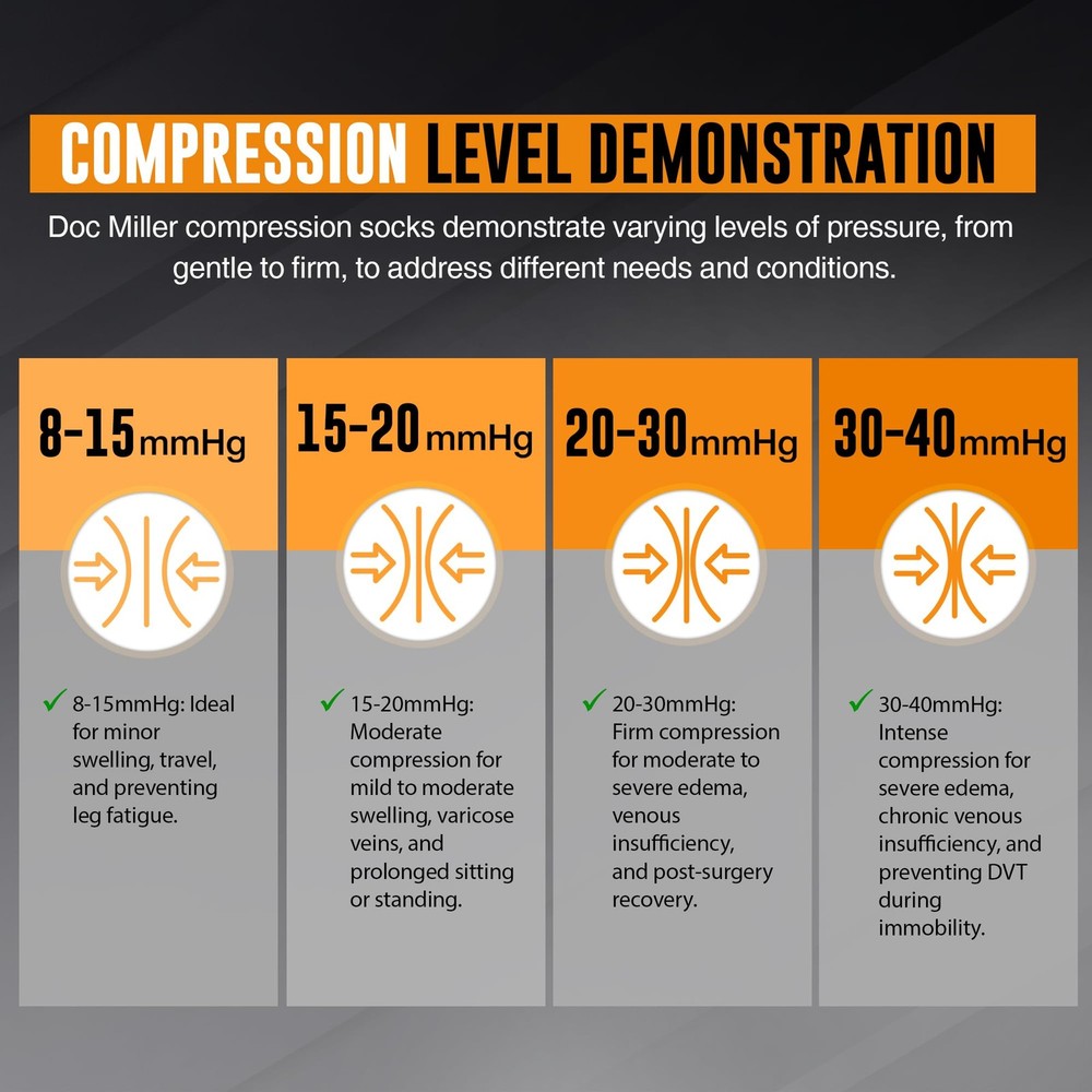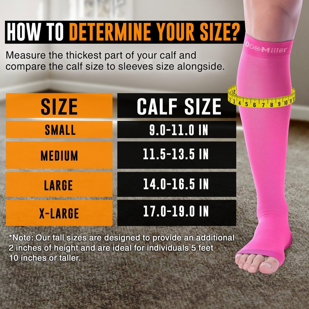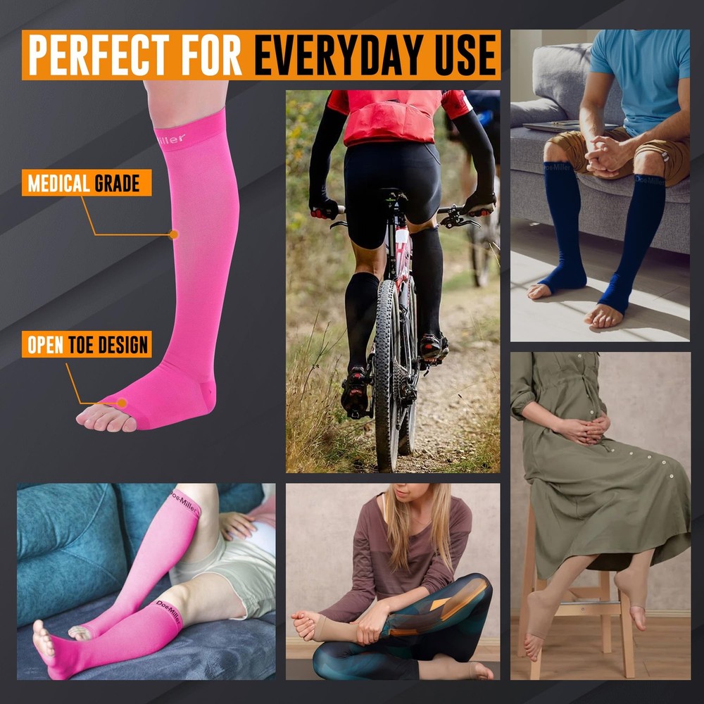 Discover unparalleled comfort and therapeutic benefits with Toeless Compression Stockings for Women and Men. Engineered with washable Nylon material, our medical-grade compression socks offer superior support and relief for various conditions, including calf and shin splints, spider and varicose veins, plantar fasciitis, and edema. Whether you're a dedicated athlete seeking enhanced muscle recovery or a hardworking professional in need of all-day comfort, our open-toe compression socks are your ultimate solution. Designed to promote circulation and alleviate discomfort, these compression stockings are perfect for pregnant women seeking relief from swelling and discomfort. Crafted with precision and care, they provide a snug yet comfortable fit, allowing for unrestricted movement throughout the day. Ideal for use with sportswear for added protection and strength, these socks are also a go-to choice for individuals with jobs that demand long hours on their feet. Choose from a wide array of colors and compression strengths to match your style and preferences. Whether you're looking for subtle neutrals or vibrant hues, our selection has something for everyone. With compression strengths ranging from 20-30mmHg, you can select the perfect level of support to meet your needs. At , we're committed to providing you with products that deliver exceptional results and unparalleled comfort. Our comprehensive collection includes not only open-toe compression socks but also full-length compression socks, thigh-high stockings, toeless compression sleeves, elbow braces, ankle sleeves, and calf sleeves. Available in various sizes, colors, and patterns, our products cater to diverse needs and preferences. Experience the difference with 's open-toe 20-30mmHg compression stockings and discover the ultimate relief and support you deserve. Invest in your well-being today and elevate your comfort and performance with our compression solutions. COMFORT-ENHANCED MEDICAL GRADE COMPRESSION SOCKS: Experience unparalleled comfort and support with our meticulously crafted open toe compression socks. Made from high-quality nylon and spandex fabric, they offer breathable relief for conditions like calf and shin splints, varicose veins, and muscle soreness. With a diverse range of sizes and colors, find the perfect fit for lasting comfort throughout the day. ENERGIZING TOELESS COMPRESSION SOCKS: Recharge your legs with our toeless compression socks, designed to boost circulation and reduce fatigue. Whether recovering from a workout or seeking relief from edema and plantar fasciitis, these socks provide medical-grade compression for unmatched support, ensuring vitality and comfort. SNUG FIT FOR INSTANT COMFORT: Find instant relief with our snug-fitting open toe compression socks, engineered for maximum comfort and support. Ideal for pregnant women, nurses, and athletes, these socks provide relief from swelling, discomfort, and fatigue, ensuring all-day comfort and support. EVERYDAY SUPPORT AND COMFORT: Offering 20-30mmHg of graduated compression, our socks are perfect for all-day wear and various activities. Whether standing at work or hitting the gym, they promote circulation and help reduce fatigue, ensuring you stay energized throughout the day. RECOMMENDED COMPRESSION SOCKS:Trust in the expertise of medical professionals with our open toe compression socks. Used for various conditions including post-surgery recovery, edema, and varicose veins, they provide graduated compression and exceptional comfort, delivering the benefits of medical-grade compression.
