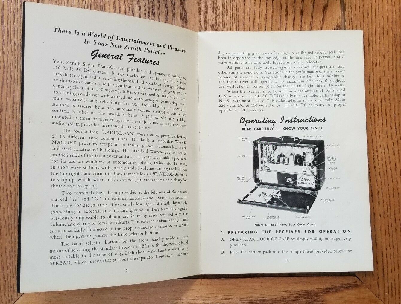 An original operating guide booklet for Zenith Super Trans-Oceanic Portable Model H500 radios. Excellent condition, station log is unmarked, no blemishes or stains, all pages are clean and without markings except the first page has pencil marking in upper left. Staple bindings are intact. A rare booklet indeed.... USA RESIDENTS ONLY. Must have feedback score of 5 or greater to bid on auction. If less than 5, contact me first to secure your intent to follow through with purchase. I will ship within two business days of receiving confirmed paypal payment. Please be prepared to submit payment within 48 hours of auction close. No returns unless item is damaged during shipment or does not function as described. Return item must be in original packaging with all documents that were included with original sale. Thanks for looking.
