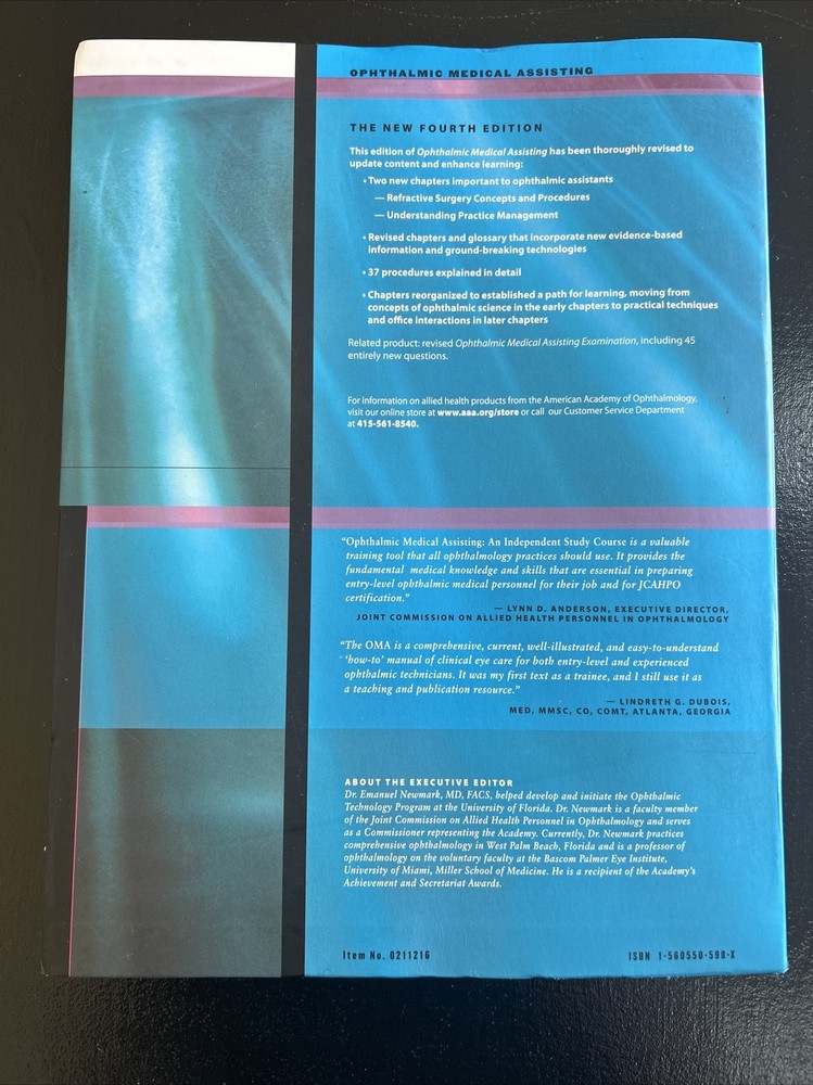 Subject Area:OphthalmologyFormat:PaperbackType:TextbookPublisher:American Academy of OphthalmologyPublication Year:2006Author:Emanuel NewmarkLanguage:EnglishNumber of Pages:320 PagesPublish Year:2006Publication Name:Ophthalmic Medical Assisting : an Independent Study CourseUpdated ISBN2:9781615258581Updated ISBN1:1615258582Subject:MedicineEdition:4th