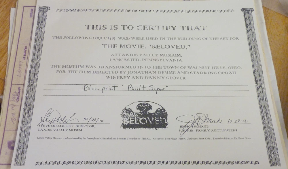 Offered for your consideration in this listing is a group of 4 original blueprints used in the making of signs for the movie "Beloved" which was filmed at the Landis Valley Museum in Lancaster, PA. They all (4 blue prints) have with them a CAO from the auction house that sold everything from the set after the movie was a wrap, where I bought them. You'll find them to be in new condition. There are only two in the photo but there are 4 different ones for sale here. We encourage email questions as I am easy to talk with and usually close by. Since January 1998 we have been showing eBay buyers quality merchandise with fast and secure shipping and 'top of the line' customer service. My selling this with a money back guarantee for your satisfaction, allows you to bid with confidence in a pleasant transaction. My current auction list includes many other interesting items, many gold charms & charm bracelets for a variety of interests, a wide selection of gold & diamond jewelry for both ladies and gents while there are over 300 items in my eBay store so please look when you can. Please believe...... dealing with me is quite different from talking to others. I will give you my individual attention to answer all your questions to work for a smooth transaction. I aim to sell as reasonably as possible and I believe that you'll find your purchase to be even BETTER than you are expecting.