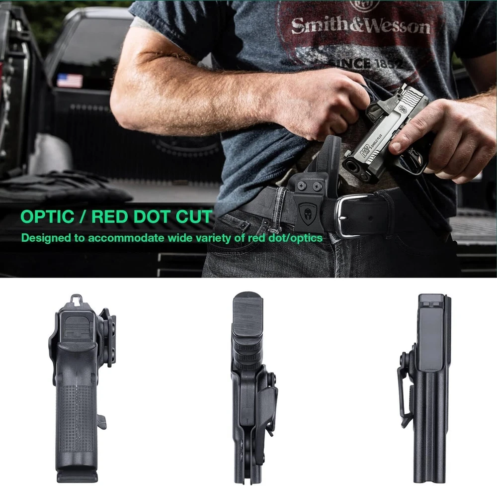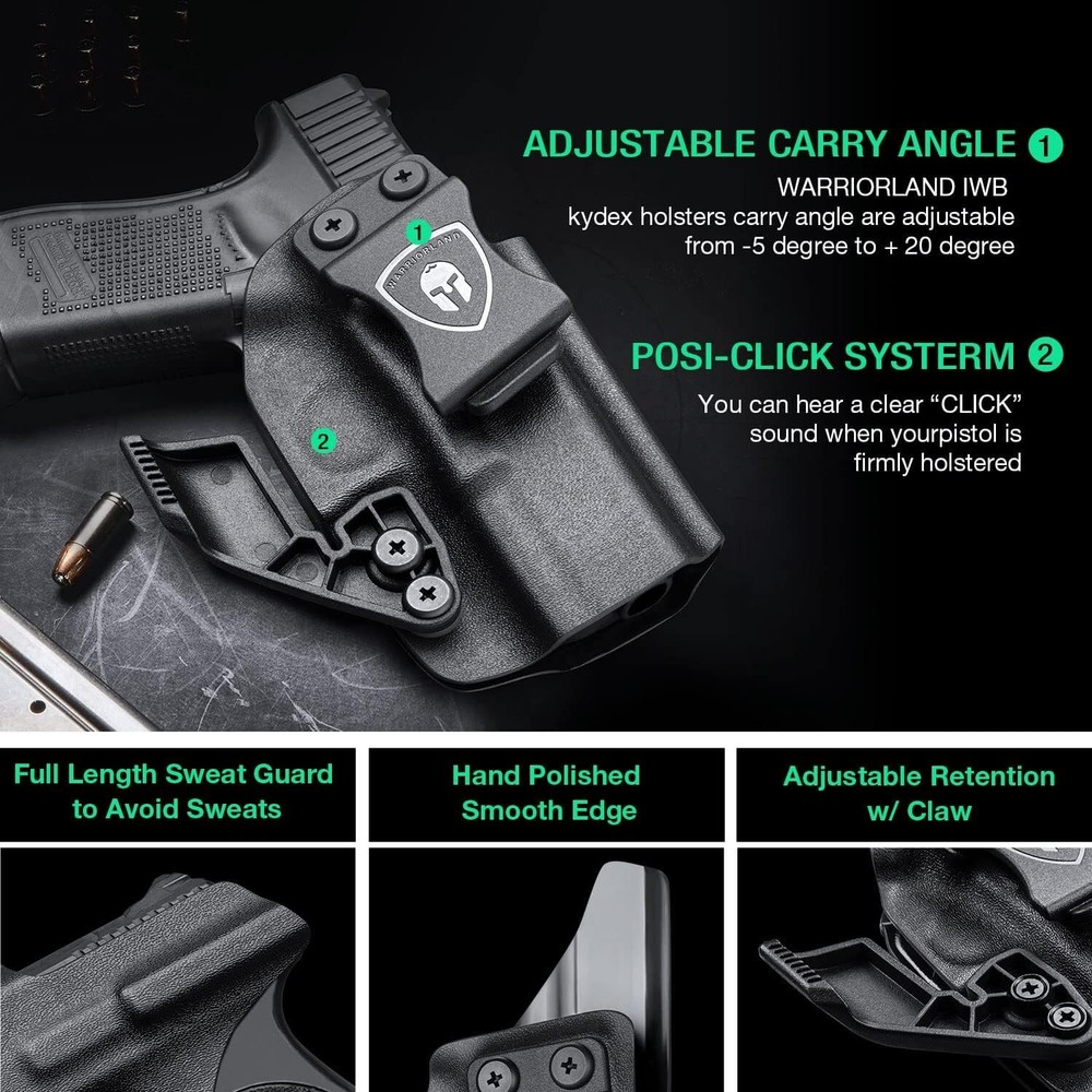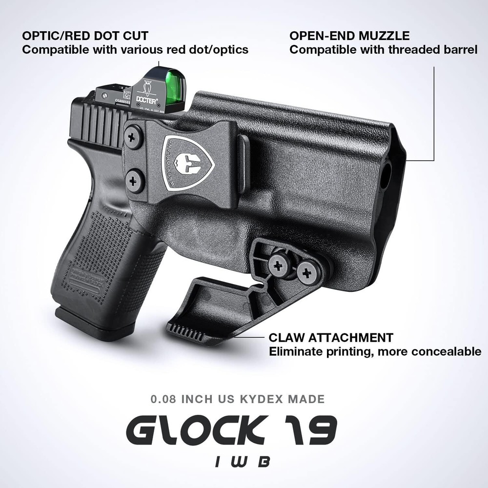 IWB Kydex Holster Optic Cut & Claw Compatible with Glock 17/19, G43/43XNo MOS, G2C/G3C, GX4, G3, P320, P365, LC9, Security 9, S&W M&P 9/.40, Shield 9/40, Shield EZ, SD9VE, Hellcat, Right COMPATIBILITY - Compatible with Glock17/19/19X/44/45 Gen(1-5) & Glock 23/32 Gen(3-4) - Glock 17 barrel end would come out from holster inch - Incompatible with Glock 23 Gen 5 & Glock 32 Gen 5 or any Laser/Light OPTIC CUT & CLAW - This Glock 19 holster are designed to accommodate wide variety of optics - Claw can eliminate printing made holster more concealable when carrying(equipped with extra screws for no claw style carry) COMPENSATOR & OPEN MUZZLE CUT - Glock 19 holster can accommodate with various compensators - Over-Cut open muzzle accommodate with threaded barrel FULL LENGTH SWEAT GUARD & POSI-CLICK AUDIBLE SYSTERM - Full length sweat guard can prevent sweat towards your pistol - You can hear a clear "CLICK" sound when firearm was firmly seated INCH US KYDEX MADE - The glock 19 IWB holster is made of .08" (2mm) US Kydex material, which possess rugged, durable, waterproof, washable and lightweight characters - Super suitable for daily concealed carry HAND POLISHED EDGE & SMOOTH INNER STRACTURE - All Kydex holsters edge are polished by hand - Smooth inside structure ensure no scratch nor wear ADJUSTABLE CANT & RETENTION - Adjustable carry angle from -5 to +20 Degrees - Adjustable retention for suitable tightness satisfaction - ALL holsters possess satisfaction, if for any reason you are unsatisfied, please feel free to contact our 24/7 Customer Services for or a resolution of your purchase price, we stand behind the quality of our work!