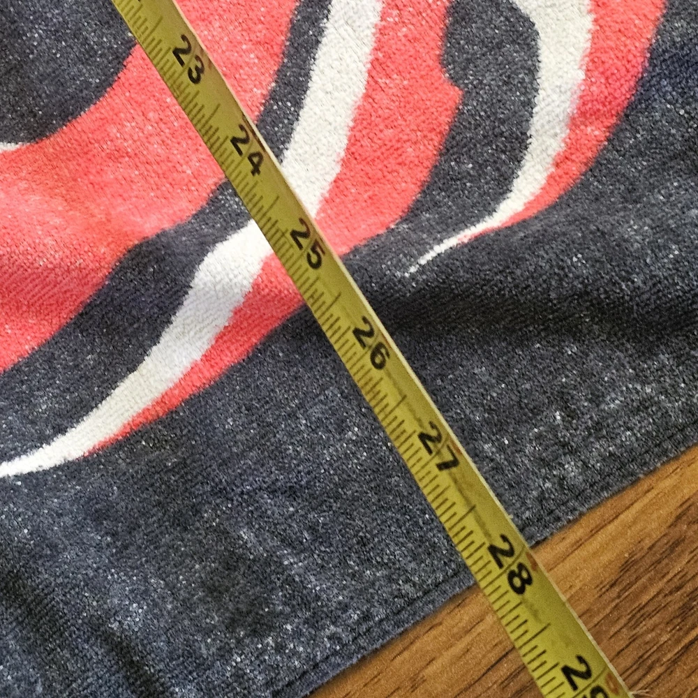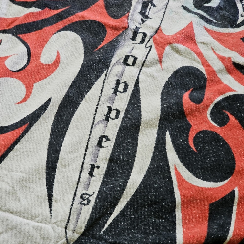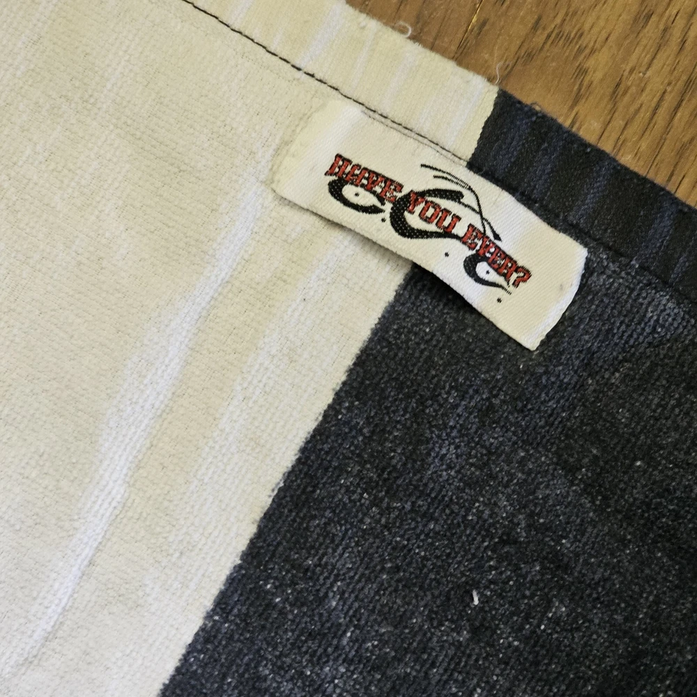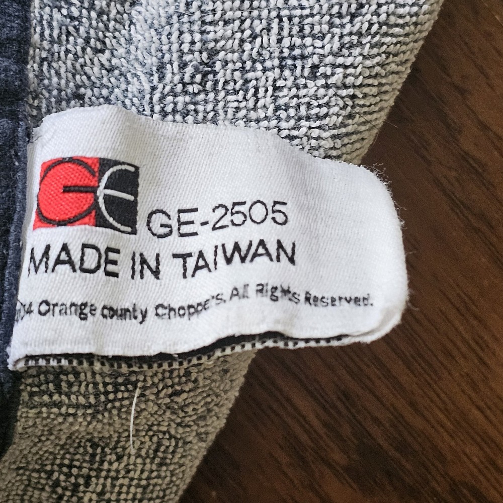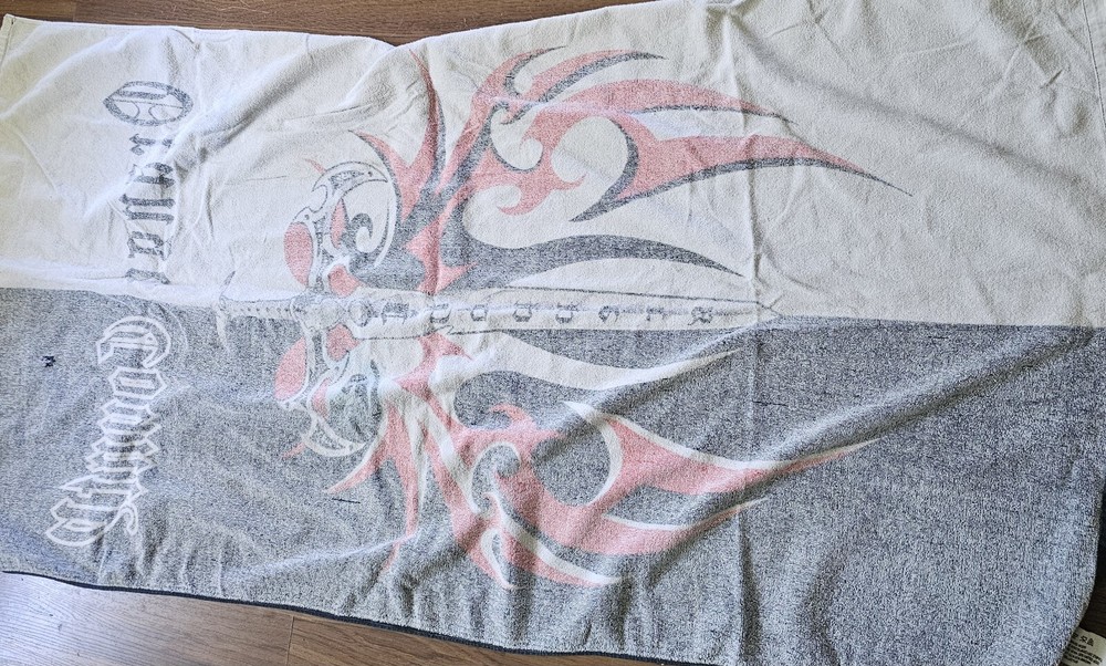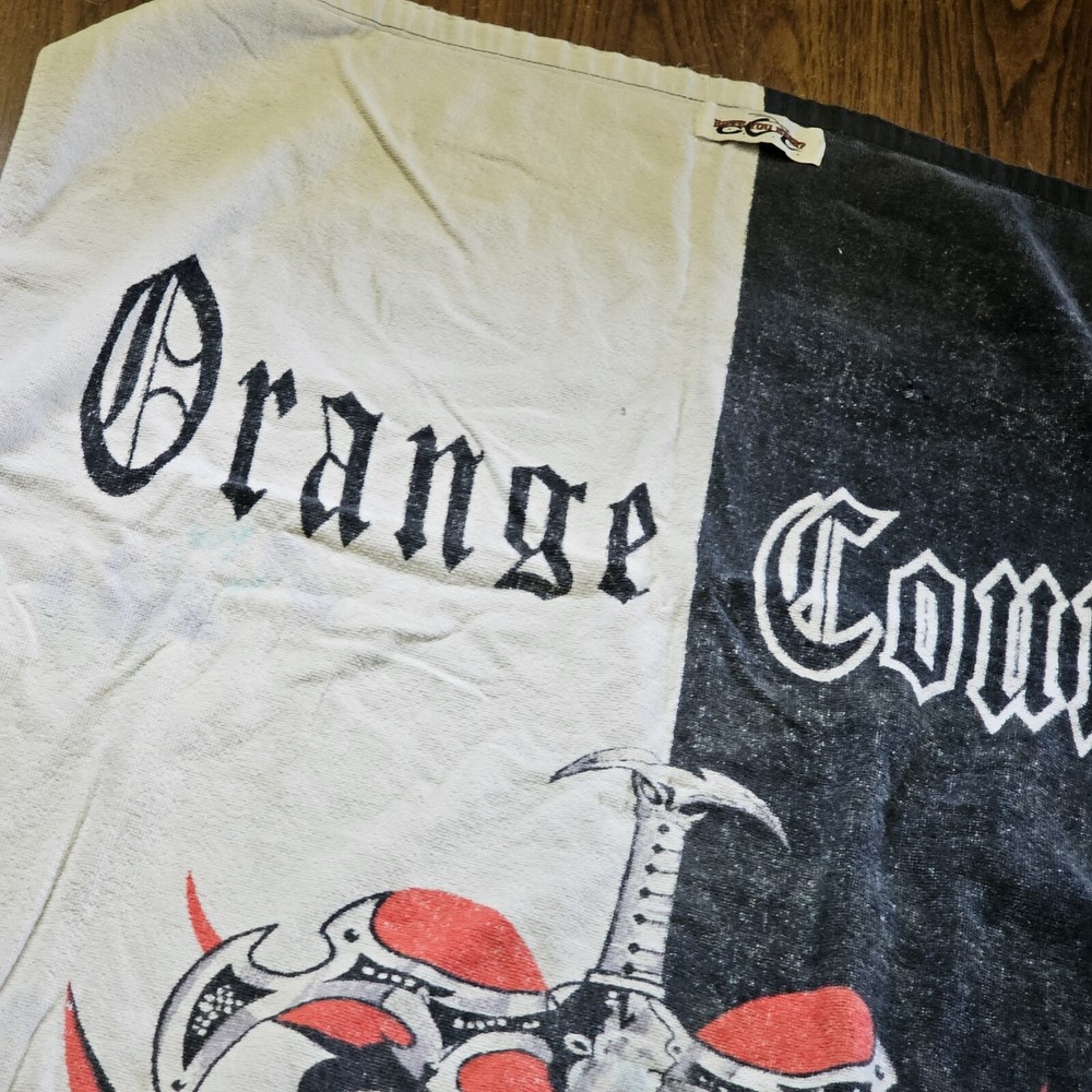 This vintage Orange County Choppers beach bath towel from 2004 is the perfect addition to your summer collection. Measuring 54x28 inches, it's made of 100% cotton and features a vibrant orange color with a beach theme. The towel is designed for adults and comes with a set that includes a bath towel. It's made in Taiwan and is ideal for use in the bathroom. See photos for wear. See photos for staining discoloration