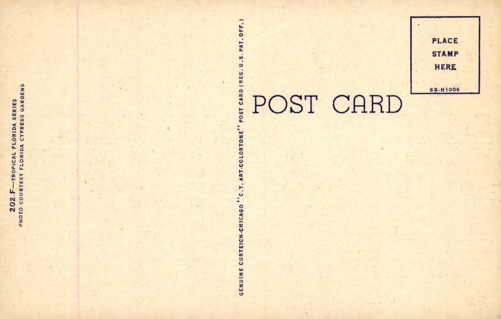 Experience the vibrant tradition of orange picking in Florida with this postcard featuring a photo from Florida Cypress Gardens. The Genuine Curteich-Chicago 'C.T. Art-Colortone' postcard captures the essence of the sunny state.