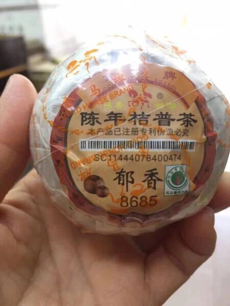 Orange PuErh Tea Yuxiang 8685 Chinese Loose Leaf Ripe Pu-erh Tea Slimming Tea Net weight: About 15g-25g/pc Ingredients:Orange and Puer Ripe Loose Tea Origin:Guangdong,China Manufacturer:Guangdong Heshan City Fruit Tea Science Research Institute.GOLD HORSE BRAND 8685 is labeled as scent of rich flavour. The tangerine wrapped Pu-erh tea was made of large tea leaves harvested in Yunnan, and tangerine produced in Xin Hui, Guangdong, and it had underwent proper aging. Also known as Ju Pu, the pu-erh leaves stuffed into a whole Xin Hui Tangerine Peel. The leaves are packed into the fruit wet, and then dried under the sunlight. After that, the packed tangerine teas are then stored in a cool dry location, allowing the tea to ferment and dry within the tangerine peel. While drying the pu-erh tea absorb the flavor of tangerine. The Gold Horse brand tangerine wrapped Pu-erh tea by Hoshan Tea Institute of Science and Research is famous in China. This tea should be brewed with broken pieces of the tangerine peel included for its taste and medical value, it brews a clear soup, rich in flavor, with smell and taste of citrus. When you brew it is the absence of the heavy musty flavor characteristic of traditional pu-erh. Certainly this character is still there but it is layered beneath sweet notes of tangerine, the result of being packed in the tangerine peel before fermentation. As the tea ages it absorbs the flavor of the peel, the peel and leaf both turn a deep brown.While most pu-erh teas are characterized by musty, earthy tones, tangerine peel packed pu-erh is highlighted by exceptionally light notes of citrus. The infusion is similarly clear tending golden yellow, in marked contrast to the darker infusion of traditional pu-erh.