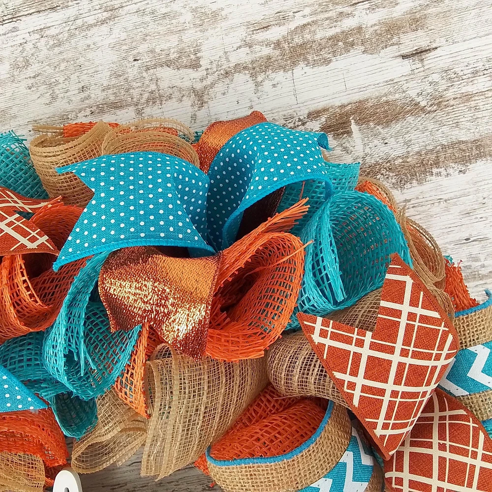 This inviting wreath will make a wonderful addition to your indoor or outdoor home décor. Use it for your own decor, or a gift for someone special. Thank you so much for visiting my shop and for considering pieces that allow my passion to make your home even more beautiful. Please message me with any questions before purchasing. This wreath measures approximately 24 inches round and approximately 5" deep. This ready to ship wreath is made with orange, turquoise and white mesh and accented with several different colors of ribbons to showcase the orange welcome sign in the center. Want something more custom or have questions? Send me a message...the backbone of my business is custom creations! Purchase with confidence in a seller with excellent reviews and over 15,000 sales between all selling venues. Indoor and outdoor pieces but my wreaths do appreciate a little shelter from the elements to stay in pristine condition.