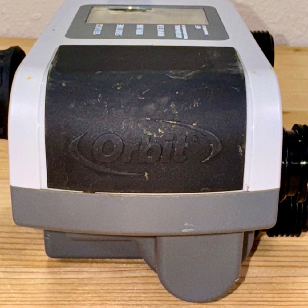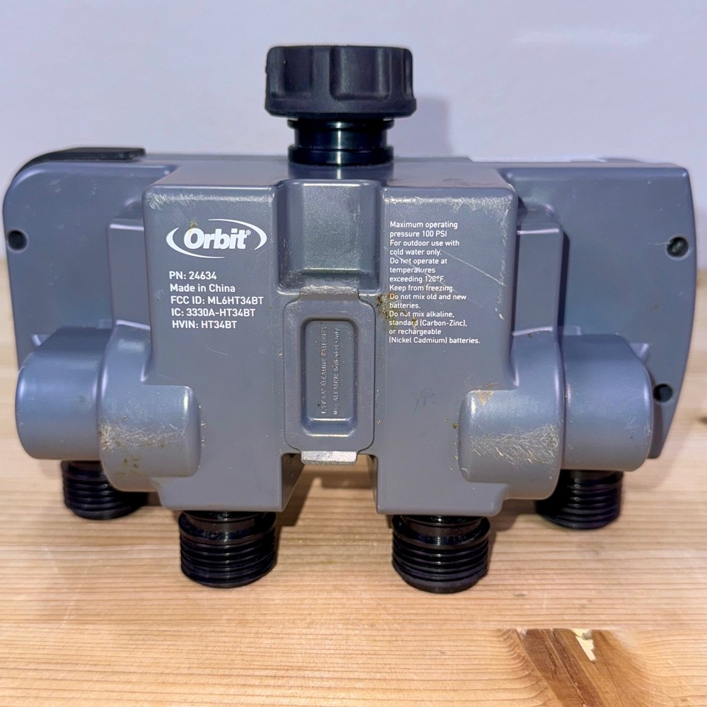 Take control of your outdoor watering with this Orbit B-hyve 4-Outlet Smart Hose Faucet Timer. Manage up to four watering zones from your phone using Bluetooth, or manually from the easy-to-read LCD display. Perfect for lawns, gardens, and drip irrigation systems. Model: 24634 (HT34BT) Features: 4 independent zones, auto/manual modes, rain delay, smart watering Works with B-hyve app (Bluetooth control) Condition: Pre-owned, tested and fully functional, minor cosmetic wear Batteries not included Keywords (for SEO/tags): orbit bhyve timer, 4 outlet hose timer, smart water controller, garden irrigation, bluetooth sprinkler timer, orbit faucet timer