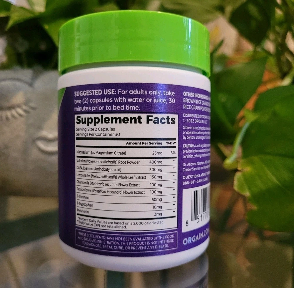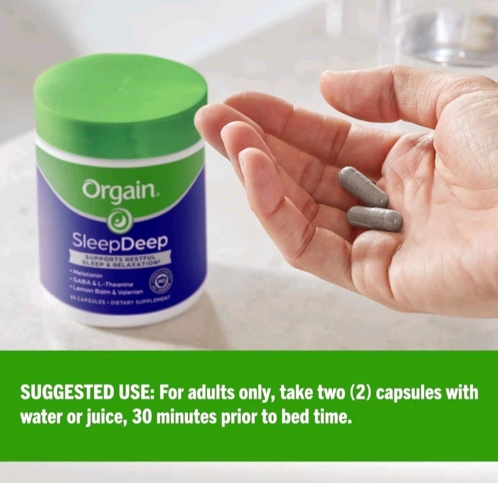 Orgain SleepDeep, Melatonin Sleep Aid Support Supplement with Magnesium, GABA, L-Theanine, L-Tryptophan, Chamomile, Lemon Balm & Valerian Root, Gluten Free, Doctor Formulated - 60 Count, 30 Day Supply About this item SUPPORTS RESTFUL SLEEP & RELAXATION^: Includes 3mg of melatonin, GABA, valerian root, L-theanine, L-Tryptophan & nighttime herbs like lemon balm, chamomile, passionflower, and magnesium. COUNT SHEEP, NOT THE HOURS: Snooze buttons, beware. Orgain’s SleepDeep includes Melatonin – a hormone created in our pineal gland that helps you fall asleep and supports restful, long-lasting, and restorative sleep^ QUALITY ASSURED: Drug Free and Non-Habit forming, Gluten free, No soy ingredients, doctor formulated*, No Artificial Flavors or Colors, Comprehensively tested for Quality, Made in NSF GMP registered facility DR. FORMULATED*: Thoughtfully formulated easy to swallow capsules by Orgain’s own Dr. Andrew Abraham* – an Integrative Medicine physician to support restful sleep & relaxation. SUGGESTED USE: For best results take 2 capsules with water or juice, 30 minutes prior to bedtime. Try with Orgain Stressless Supplement for additional benefits. WHAT TO EXPECT: Includes 1 (one) 60 capsule supply of Orgain SleepDeep supplements, equivalent to a 30-day supply