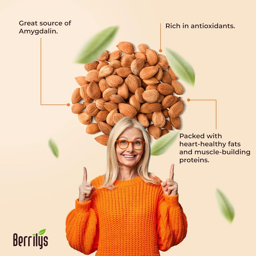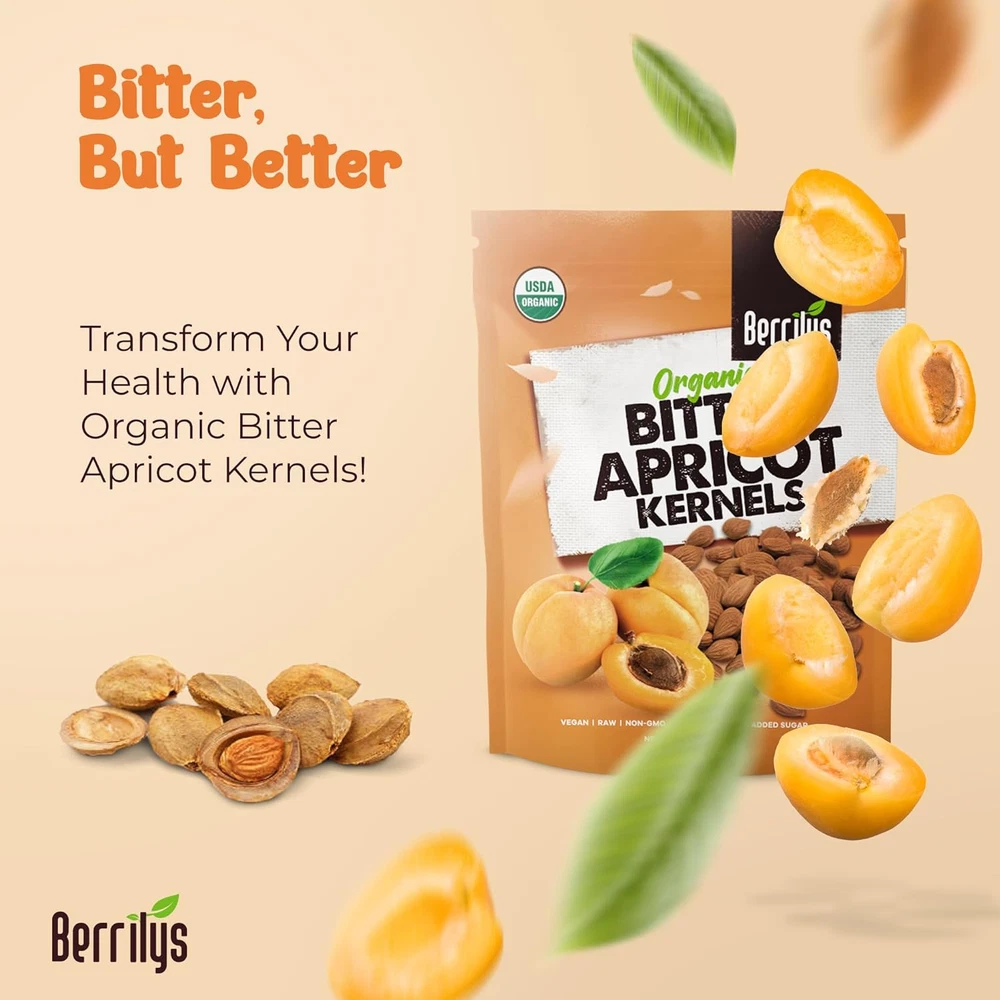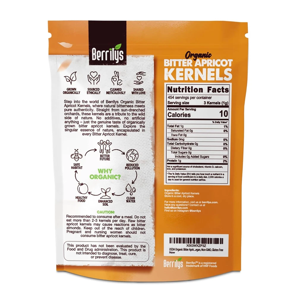 ORGANIC : Recognized as USDA Organic certified, our organic bitter apricot kernels are cultivated without chemicals or GMOs. These premium organic apricot seeds deliver authentic bitter taste with full nutritional value, making them a standout natural healthy ingredient in recipes. FREE FROM ADDITIVES: Our bitter apricot seeds are organic, free from additives, sulfur, or preservatives, retaining their natural flavor and nutrients. Enjoy the unaltered goodness of these apricots kernels, perfect for healthy recipes. SOURCED FROM FARMERS: Sourced directly from farmers, these bitter apricot kernels support practices and ensure fresh, high-quality seeds. Each bitter raw apricot seeds organic is packed with flavor and nutritional value, offering a choice for your pantry. NUTRIENT-DENSE WITH POTENTIAL BENEFITS: Packed with essential nutrients, these organic bitter apricot seeds may support overall wellness. Their unique flavor and bitter taste make them a versatile addition to healthy recipes, adding a nutritional boost to every bite. DO NOT EAT MORE THAN 3 KERNELS PER DAY: Recommended to consume after a meal. Raw bitter apricot kernels may cause reactions as bitter almonds. Keep out of the reach of children. Pregnant and nursing women should not consume bitter apricot kernels. Product Description Follow the Journey: Traceable Origins of Our Berrilys Organic Bitter Apricot Kernels - Delve into the transparent journey of our apricot kernels, meticulously traced from orchard to packaging. With a commitment to traceability, we ensure the purity and quality of our product for your peace of mind. Indulge in Excellence: Discover Our Premium Berrilys Organic Bitter Apricot Kernels - Elevate your snacking experience with our premium apricot kernels. Handpicked from the finest orchards and carefully processed, each kernel embodies superior quality and flavor. Treat yourself to the luxury of our premium product and savor the richness of nature's bounty. Straight from Nature to You: Our Directly Sourced Berrilys Organic Bitter Apricot Kernels - By forging direct relationships with growers, we bring you the freshest apricot kernels without the added costs of intermediaries. Enjoy the authenticity and freshness as you experience the pure essence of nature in every bite. Quality Within Reach: Affordable Berrilys Organic Bitter Apricot Kernels for Everyone - Experience the goodness of our organic apricot kernels without straining your budget. We believe that premium quality should be accessible to all, which is why we offer our Berrilys kernels at prices that won't break the bank. Enjoy wholesome goodness without compromise, making healthy snacking affordable for everyone.