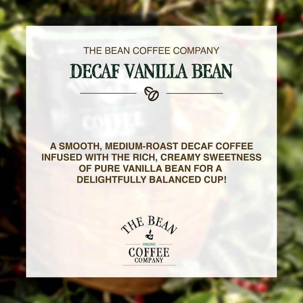 Like all coffees from , this 100% Arabica coffee was hand roasted in small batches and packaged at the peak of its cycle to preserve its natural flavors and fresh-roasted quality. has a combined more than 25 years of Roasting experience with an innovative commitment to great taste, quality and health. It's all about the bean. CERTIFIED ORGANIC: The Bean Organic Coffee Company uses 100% organic coffee beans, certified by both the USDA and CCOF (California Certified Organic Farmers). Plus, our natural flavorings are also certified organic, guaranteeing a pure and eco-friendly coffee experience SMALL BATCH ROASTED IN THE USA: Our organic decaf Vanilla Bean Whole Bean coffee is hand roasted in small batches in the USA and packaged at the peak of its cycle to preserve its natural flavors and fresh-roasted quality ECO-CONSCIOUS FARMING: We uphold farming practices that enhance soil and water quality, reduce synthetic materials, protect biodiversity, and avoid genetic engineering. Your cup of coffee supports a greener planet while you enjoy low acid decaf organic coffee WATER PROCESSED DECAF: Savor the robust coffee flavor without caffeine's effects. Our mountain and swiss water decaffeination processed coffee is entirely chemical-free, preserving coffee's natural goodness. It's a healthier choice for those seeking a caffeine-free, full-bodied coffee experience FAMILY-OWNED AND USA GROWN: From our humble beginnings at a Southern California farmer's market in 2007, we've expanded our family-owned business to bring premium organic coffee straight to customers across the United States