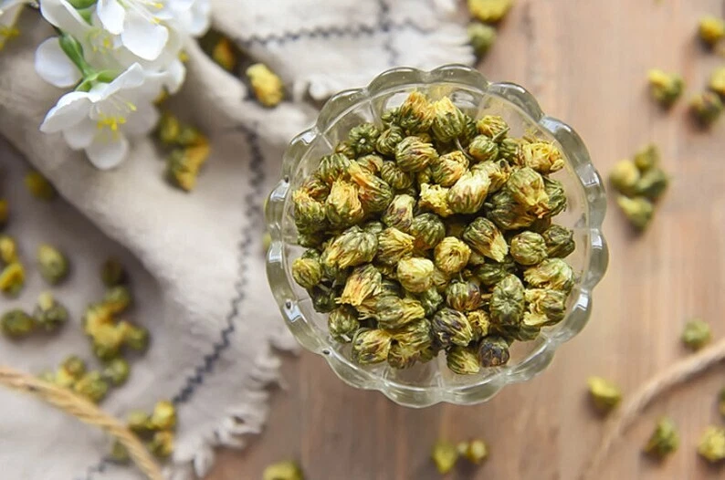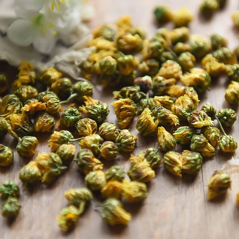 Origin: China Package include: 100g / 250g / 500g The chrysanthemum buds also called as tai ju, come from young Hangzhou white chrysanthemum flowers, one of China’s four famous chrysanthemum types. These chrysanthemum buds herbal tea are selected from the first batch of the flower buds at the early of November in Tongxiang, Zhejiang Province. It is a first grade. Chrysanthemum buds tea have no caffeine and can be consumed any time of day without disrupting your sleep. The flower tea buds are stonger and richer in flavor than the fully-bloomed flowers themselves. Brewing Instruction: Porcelain gaiwan or glass tea cup is suggested for brewing the chrysanthemum buds herbal tea, 3-5g tea with wate about 200-300ml and the water temperature should be around 100℃, do not be too low. Stay for about 1-2 minutes, you can begin to drink the tea. Storage: Stored in a dry place and no direct sunshine.