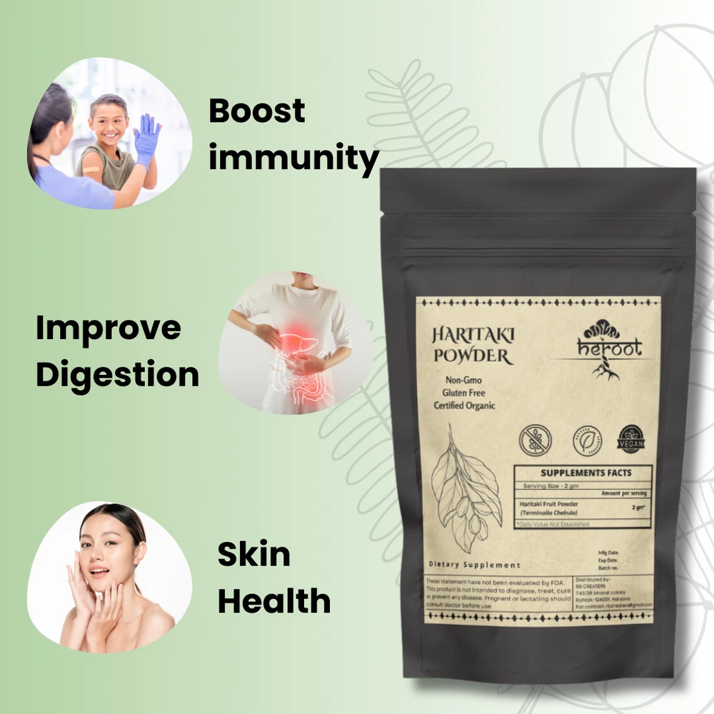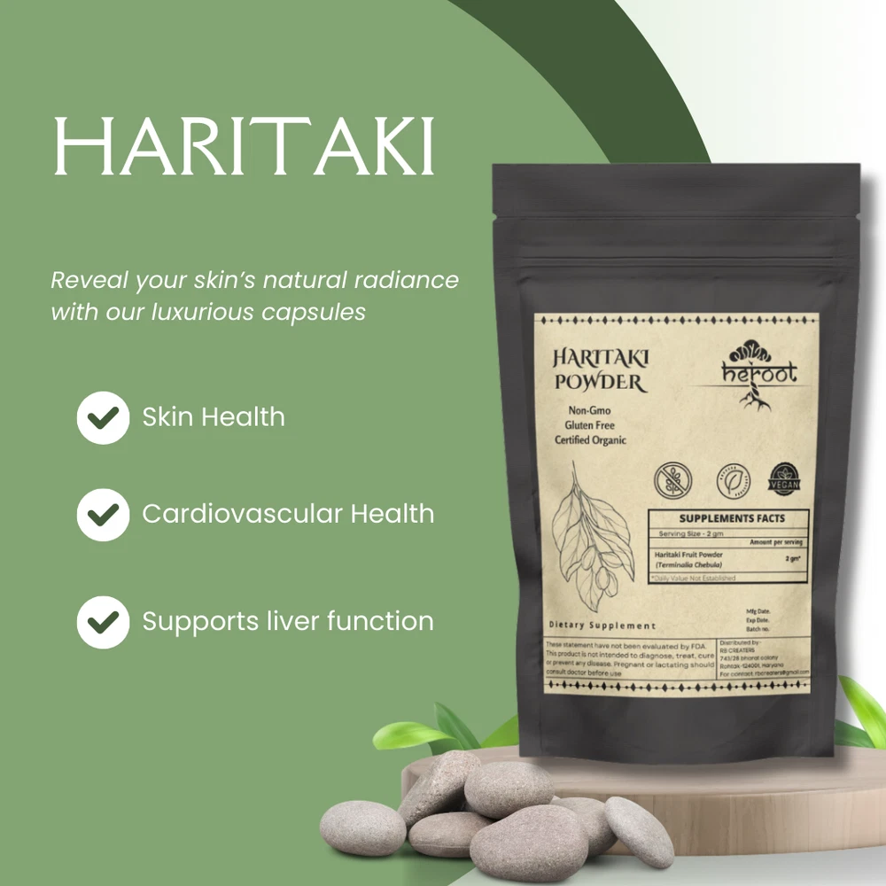Heroot Organic Haritaki Powder Haritaki churna capsules is made from haritaki which is a clinically proven, time-tested remedy for all digestion-related problems. It aids digestion by increasing digestive enzymes, suppresses hyper acidity, improves absorption of nutrients, prevents constipation and piles. It also detoxifies your system from toxins. Haritaki has been taken from time immemorial for its holistic healing properties. Key Ingredients: Organic Haritaki Key Benefits: Provides relief from indigestion-related problems Exhibits antioxidant activity and improves liver function Helpful in constipation management Helps to treat bleeding and non-bleeding piles Relieves from stomach bloating and intestinal disorders Useful in spleen enlargement Directions For Use: Consume 1/4 tsp (3-5 gm) with lukewarm water after a meal Or as directed by your healthcare provider How To Consume: Can be mixed with warm milk & honey Can be taken with juices & smoothies Can be taken directly with honey Can be filled in capsule and consumed with water Safety Information: Store in a cool dry place Keep out of reach of children If you are pregnant or lactating or prone to any food allergy or under any medical condition consult your healthcare practitioner before use Disclaimer The above description is for information and knowledge purpose, not a healthcare professional advice. Please consult your doctor and/or pharmacist before you take this vitamin. Pregnant or lactating women, diabetics, hypoglycemics, and people with known medical conditions and/or taking drugs, should consult with a licensed physician and/or pharmacist prior to starting any supplementation program. The above statements have not been evaluated by the Food & Drug Administration. Shipping and Handling Shipping time will be 1 business day after the cleared payment We will ship by Indian Post service Shipment will take 15-30 days. Few more days for your local customs delay and formalities. For Express service additional charges will be applied. For any reason you wish to leave Negative or neutral feedback, Please contact us first and let us mutually resolve it. We care for your satisfaction and will make sure that you are happy with the transaction to post us 5**** ratings in all areas. ***Customs Information*** Heroot will not be liable for packages refused or held by customs for delivery. We request that you contact customs office and ask about import regulations and restrictions before placing your order. It is importsnt for you to become familiar with customs policies for your specific country before ordering. Customs regulations differ by country and not knowing their regulations can result in your order incurring high import duties, the delivery being delayed or even returned. Please check with your customs office to see if your country permits the shipment of the products you are planning to order from us and if any additional licenses or permits are needed. Please note: if your order is returned to us due to banned/ restricted products policy, a wrong address, refusal to pay customs fees, refusal to accept the order or because no one was there to accept the delivery of your order, we will refund your order as follow: you will be refunded the total amount of the order, minus the original shipping charge