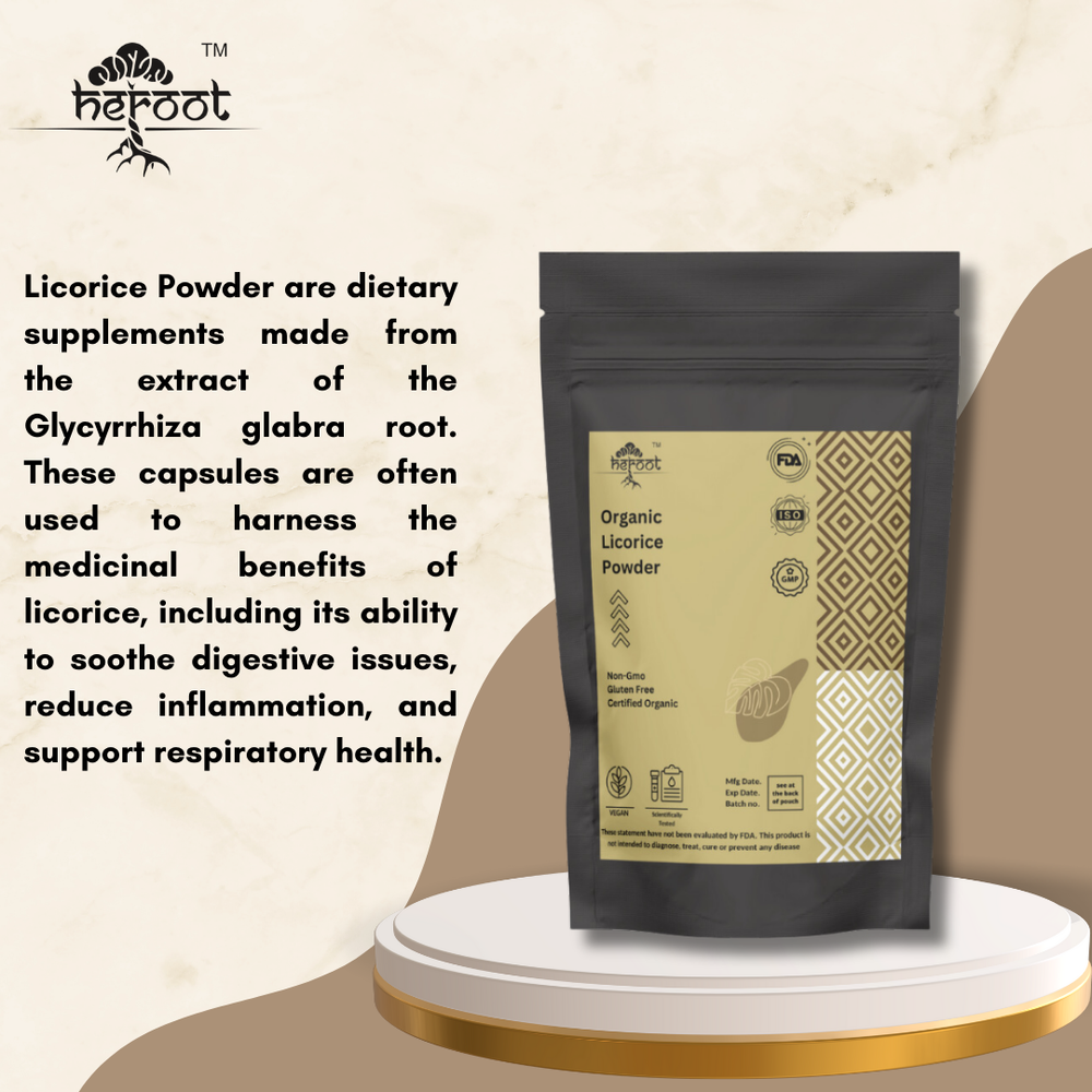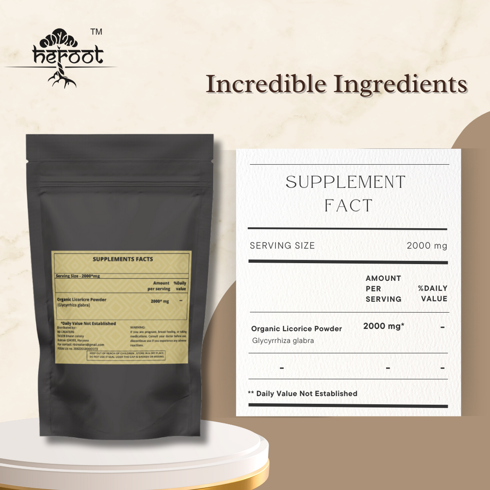 Heroot Organic Licorice Powder Licorice Powder is an ayurvedic medicine that supports in the respiratory and digestive wellness. It is found to be effective against functional dyspepsia, which includes not only heartburn but also a natural remedy for nausea, indigestion and stomach pain. It has anti inflammatory properties and is soothing herb that is used as natural remedy for ulcers and can be a beneficial leaky gut supplement. Key Ingredients: Organic Licorice Powder Key Benefits: Supports in respiratory & digestive wellness Useful as anti-oxidants and immunity booster Anti-inflammatory properties provide relief to a irritated sore throat Useful in Acidity & as Mild Laxative Known helpful for menstrual and fertility related concerns Soothes the pain related to eczema and other dermal related concerns Directions For Use: Consume 2gm with lukewarm water after a meal Or as directed by your healthcare provider How To Consume: Can be mixed with warm milk & honey Can be taken with juices & smoothies Can be taken directly with honey Can be filled in capsule and consumed with water Safety Information: Store in a cool dry place Keep out of reach of children If you are pregnant or lactating or prone to any food allergy or under any medical condition consult your healthcare practitioner before use Disclaimer The above description is for information and knowledge purpose, not a healthcare professional advice. Please consult your doctor and/or pharmacist before you take this vitamin. Pregnant or lactating women, diabetics, hypoglycemics, and people with known medical conditions and/or taking drugs, should consult with a licensed physician and/or pharmacist prior to starting any supplementation program. The above statements have not been evaluated by the Food & Drug Administration. Shipping and Handling Shipping time will be 1 business day after the cleared payment We will ship by Indian Post service Shipment will take 15-30 days. Few more days for your local customs delay and formalities. For Express service additional charges will be applied. For any reason you wish to leave Negative or neutral feedback, Please contact us first and let us mutually resolve it. We care for your satisfaction and will make sure that you are happy with the transaction to post us 5**** ratings in all areas. ***Customs Information*** Heroot will not be liable for packages refused or held by customs for delivery. We request that you contact customs office and ask about import regulations and restrictions before placing your order. It is importsnt for you to become familiar with customs policies for your specific country before ordering. Customs regulations differ by country and not knowing their regulations can result in your order incurring high import duties, the delivery being delayed or even returned. Please check with your customs office to see if your country permits the shipment of the products you are planning to order from us and if any additional licenses or permits are needed. Please note: if your order is returned to us due to banned/ restricted products policy, a wrong address, refusal to pay customs fees, refusal to accept the order or because no one was there to accept the delivery of your order, we will refund your order as follow: you will be refunded the total amount of the order, minus the original shipping charge.