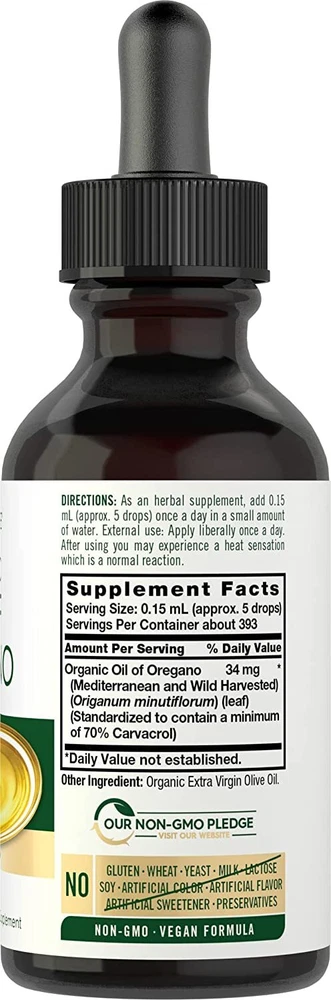 What is Oil of Oregano? Oregano spice has been used in culinary and wellness traditions around the world for centuries. This traditional Mediterranean herb provides a lot of flavor, along with many other benefits. Oil of Oregano provides an abundance of naturally occurring antioxidants, and comes in many forms such as capsules, softgels, tablets, and now convenient liquid drop tinctures. Carlyle Oil of Oregano: Discover the power of nature with Carlyle Organic Oil of Oregano! Our vegan supplement delivers 34 mg of Organic Oil of Oregano per serving in convenient liquid drops for premium support. We test our herbs to maintain our exceptional standards of quality, because you deserve nothing but the best for your routine! Carlyle Oil of Oregano: Our expertise in sourcing the purest ingredients combined with advanced technologies makes us proud to deliver premium, honest supplements at the best value. Carlyle Organic Oil of Oregano is a testament to our commitment to excellence, made with powerful ingredients rooted in wellness. Thanks for choosing us in your pursuit of living healthy. WARNING: SHAKE WELL. KEEP OUT OF REACH OF CHILDREN. DO NOT USE IF PREGNANT OR NURSING. If you are taking any medications or have any medical condition, consult your doctor before use. Do not apply to broken or irritated skin or areas affected by rashes. If any adverse reactions occur, immediately stop using this product and consult your doctor. If outer seal is damaged or missing, do not use. Store in a cool, dry place.