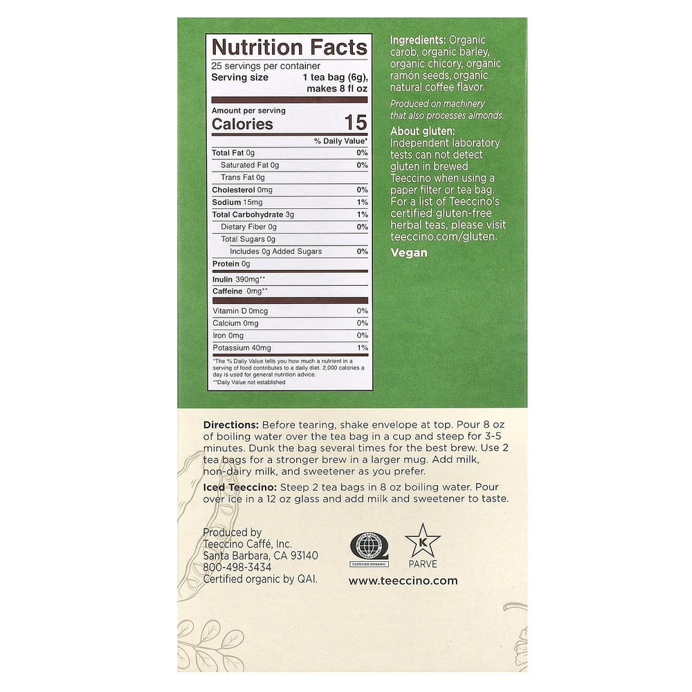 Maya Blend 3X More Herbs Prebiotic Acid Free USDA Organic Certified Organic by QAI Kosher Parve Vegan The Rich and Roasted Herbal Tea® Whether you're a tea or coffee drinker, you'll love Teeccino's satisfying, robust flavor that fans describe as smoother, richer, and creamier than coffee. The secret? French chicory, the roasted root often added to coffee, blended with barley, Italy's favorite caffeine-free roasted brew, and Spanish carob, famed for its chocolaty flavor. Enriched with ramón seeds, a traditional Mayan roasted beverage, Teeccino makes a delicious cup of tea.. Our eBay Store About Us Contact Us Add to Favorite Sellers Nutrition Facts Serving Size: 1 tea bag (6 g), makes 8 fl oz Servings Per Container: 25 Amount Per Serving % Daily Value* Calories 15 Total Fat 0 g 0% Saturated Fat 0 g 0% Trans Fat 0 g Cholesterol 0 mg 0% Sodium 15 mg 1% Total Carbohydrate 3 g 1% Dietary Fiber 0 g 0% Total Sugars 0 g Includes 0 g Added Sugars 0% Protein 0 g Inulin 390 mg ** Caffeine 0 mg ** Vitamin D 0 mcg 0% Calcium 0 mg 0% Iron 0 mg 0% Potassium 40 mg 1% *The % Daily Value tells you how much a nutrient in a serving of food contributes to a daily diet. 2,000 calories a day is used for general nutrition. **Daily Value not established Expiration Date: Disclaimer: Our receiving department does its best to verify and then enter the correct expiration dates for all incoming products. However, discrepancies do occur from time to time. This being said, the exceptionally high turnover at iHerb ensures that our inventory is among the freshest in the industry. Teeccino, Organic Roasted Herbal Tea, French Roast, Caffeine Free, 25 Tea Bags, 5.3 oz (150 g) DESCRIPTION: Maya Blend 3X More Herbs Prebiotic Acid Free USDA Organic Certified Organic by QAI Kosher Parve Vegan The Rich and Roasted Herbal Tea® Whether you're a tea or coffee drinker, you'll love Teeccino's satisfying, robust flavor that fans describe as smoother, richer, and creamier than coffee. The secret? French chicory, the roasted root often added to coffee, blended with barley, Italy's favorite caffeine-free roasted brew, and Spanish carob, famed for its chocolaty flavor. Enriched with ramón seeds, a traditional Mayan roasted beverage, Teeccino makes a delicious cup of tea...or is it coffee? We'll let you decide! 100% naturally caffeine free Natural energy boost - from nutrients, not stimulants Acid free - helps restore alkaline balance Heart - healthy potassium - for optimal performance Prebiotic - Inulin, a soluble fiber in chicory root, supports gut health to improve digestion, elimination and the immune system More Health Benefits in Every Cup Intense deep coffee notes from roasted ramón seeds and chicory roots create a robust, focused body without any sweeteners. 6 g tea bag = 3X more herbs = Bold flavor and more health benefits! SUGGESTED USE: Enjoy Teeccino Many Ways Hot Low calorie dessert Energizing smoothie base Iced Before tearing, shake envelope at top. Pour 8 oz of boiling water over the tea bag in a cup and steep for 3-5 minutes. Dunk the bag several times for the best brew. Use 2 tea bags for a stronger brew in a larger mug. Add milk, non-dairy milk, and sweetener as you prefer. Iced Teeccino: Steep 2 tea bags in 8 oz boiling water. Pour over ice in a 12 oz glass and add milk and sweetener to taste. INGREDIENTS: Organic carob, organic barley, organic chicory, organic ramón seeds, organic natural coffee flavor. Processed on machinery that also process almonds. About gluten: Independent laboratory tests can not detect gluten in brewed Teeccino when using a paper filter on tea bag. WARNINGS: