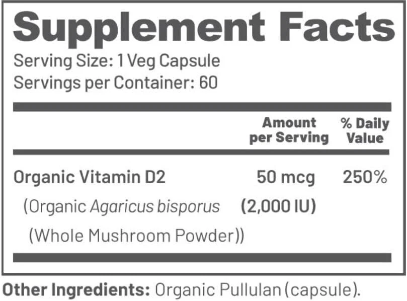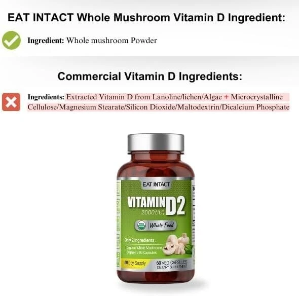 EATINTACT Organic Vegan Whole Food Vitamin D2, 2000 IU (50 mcg), Two Ingredients(Organic Whole Mushroom and Organic Vegan Capsule), Non-GMO, Third Party Tested, Support Strong Bone and Immune Health, 60 Day Supply Experience the unparalleled distinction of our product, the only organic, vegan, and truly whole food vitamin D. Our whole food vitamin D stands true to its name, produced organically from a single ingredient, whole mushrooms 🍄, rich in naturally boosted levels of Vitamin D. With our transparent and minimal process, we guarantee only the best for you. Our organically and sustainably grown whole mushrooms 🍄are exposed to UV light ☀️, mirroring the natural Vitamin D production in our bodies. Post-drying, these mushrooms are pulverized into fine powder and carefully encapsulated into organic capsules. Just two ingredients in our product - organic whole mushroom 🍄and veg organic capsule 💊 - exemplify our belief in simplicity and maximum efficacy. Assured quality is our motto, with every batch third-party tested ✔️for potency, heavy metals, and gluten, reinforcing our commitment to your well-being. Unlike other brands, we are happy to share our test results with you. If you're health-conscious, holistic enthusiast, vegan 🌿,and vegetarian, this is the best informed choice for you. Our Vitamin D ticks all the boxes, offering whole food, organic, non-GMO, components free from extraction, purification, solvents, binders, carriers, natural and artificial flavors, sweeteners, and colors. Proudly made in the USA, our whole mushroom Vitamin D is organically and sustainably grown, minimally processed, and encapsulated right here in the United States, ensuring the highest standards of quality and care. Satisfaction guaranteed 💯: We’re proud of our products. If you aren’t satisfied, we’ll refund you for any reason within 30 days of purchase.