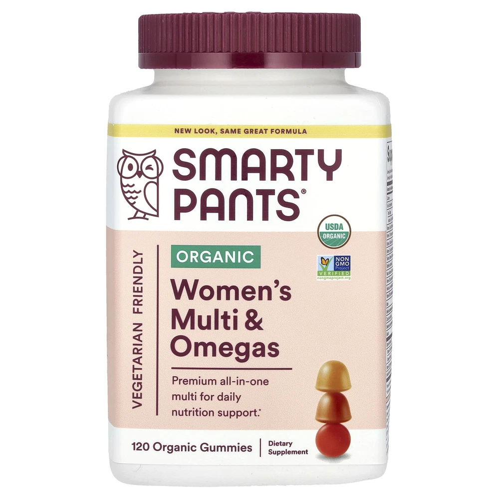 USDA Organic Non GMO Project Verified Vegetarian Friendly Premium All-in-One Multi for Daily Nutrition Support Dietary Supplement Certified Organic by QAI Clean Label Project® Purity Award Certified Vegetarian - American Vegetarian Association Every Batch is 3rd Party Tested 171 mg Omega-3 Essential Fatty Acids Vitamin C & Zinc for Immune Support Vitamin B12 Supports Energy Metabolism Vitamin D for Bone Health With Other Natural Flavors Better for you with premium ingredient sources. 4 gummies for a nutrient-dense serving with great taste. Each serving has approx. the same amount of sugar as 1/2 of a banana Our eBay Store About Us Contact Us Add to Favorite Sellers Supplement Facts Serving Size : 4 Gummies Serving Per Container : 30 Amount Per 4 Gummy Serving % Daily Value Calories 45 Total Carbohydrate 10 g 4%† Total Sugars 7 g ** Includes 7 g Added Sugars 14%† Vitamin A (as 50% beta-carotene, retinyl palmitate) 270 mcg 30% Vitamin C (as organic acerola cherry extract) 45 mg 50% Vitamin D (D-3 as cholecalciferol) 50 mcg (2000 IU) 250% Vitamin E (as d-alpha-tocopherol from sunflower oil) 12 mg 80% Thiamin (Vitamin B-1 as thiamine mononitrate) 0.11 mg 9% Riboflavin (Vitamin B2) 0.26 mg 20% Niacin (Vitamin B-3 as inositol niacinate) 3.2 mg 20% Vitamin B6 (as pyridoxal 5-phosphate) 1.5 mg 88% Folate (as L-methylfolate, calcium salt) 400 mcg DFE 100% Vitamin B12 (as methylcobalamin) 3 mcg 125% Biotin 30 mcg 100% Iodine (as potassium iodide) 150 mcg 100% Zinc (as zinc citrate) 3.3 mg 30% Selenium (as sodium selenite) 14 mcg 25% Sodium 20 mg <1% Organic Flax Seed Oil 341 mg ** Omega-3 (a-Linoleic Acid) 171 mg ** Omega-9 (Oleic Acid) 55 mg ** Vitamin K-2 (menaquinone-7) 18 mcg ** Inositol (from inositol niacinate) 1 mg ** † Percent Daily Values are based on a 2,000 calorie diet. ** Daily Value not established. Expiration Date: 01/23/2026 Disclaimer: Our receiving department does its best to verify and then enter the correct expiration dates for all incoming products. However, discrepancies do occur from time to time. This being said, the exceptionally high turnover at iHerb ensures that our inventory is among the freshest in the industry. SmartyPants, Organic Women's Multi & Omegas, Raspberries, Lemon Lime and Grape, 120 Organic Gummies DESCRIPTION: USDA Organic Non GMO Project Verified Vegetarian Friendly Premium All-in-One Multi for Daily Nutrition Support Dietary Supplement Certified Organic by QAI Clean Label Project® Purity Award Certified Vegetarian - American Vegetarian Association Every Batch is 3rd Party Tested 171 mg Omega-3 Essential Fatty Acids Vitamin C & Zinc for Immune Support Vitamin B12 Supports Energy Metabolism Vitamin D for Bone Health With Other Natural Flavors Better for you with premium ingredient sources. 4 gummies for a nutrient-dense serving with great taste. Each serving has approx. the same amount of sugar as 1/2 of a banana.‡ SmartyPants Organic Women's multivitamins are USDA Certified Organic and Non-GMO Project Verified with over 13 premium nutrients and omega-3 from organic flaxseed oil to support whole body health, all in one delicious serving. ‡Based on USDA Food Data Central. Not a substitute for a healthy & balanced diet rich in whole fruits and vegetables. SUGGESTED USE: Adult women take four (4) gummies daily. May be taken with or without food. INGREDIENTS: Organic tapioca syrup, organic cane sugar, pectin, organic lemon juice concentrate, organic natural flavors, sodium citrate, colors added (organic maqui berry juice concentrate, organic turmeric, organic black carrot juice concentrate), organic sunflower oil, organic carnauba wax. Free of synthetic colors, gluten, wheat, milk, eggs, peanuts, sesame, soy, tree nut allergens, fish, and shellfish. Manufactured in California from domestic and imported ingredients. WARNINGS: Keep out of reach of children. Consult your health care provider before use if you have a medical condition, are on any medications, are planning a medical procedure, or are pregnant or nursing. Do not use if inner seal is broken. Do not exceed recommended daily serving. Store in a cool dry place. Do not freeze. Product may darken over time.