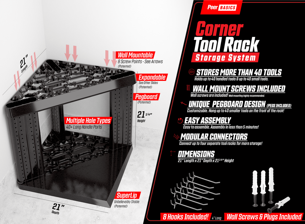 The Corner Tool Rack makes it easy to transform your garage. Unique features like the super lip provide exceptional stability, while other tool racks can easily tip over. The pegboard storage rack doubles the tool storage space compared to other tool racks, and the interlocking system allows you to expand the storage system by adding more tool racks to meet your needs. The Corner Tool Rack's friction-fit connection makes assembly easy, and the entire system can be completed in less than 5 minutes. This tool rack not only frees up more space in your home or garage for more activities, On Jul 29, 2025 at 20:27:18 PDT, seller added the following information: