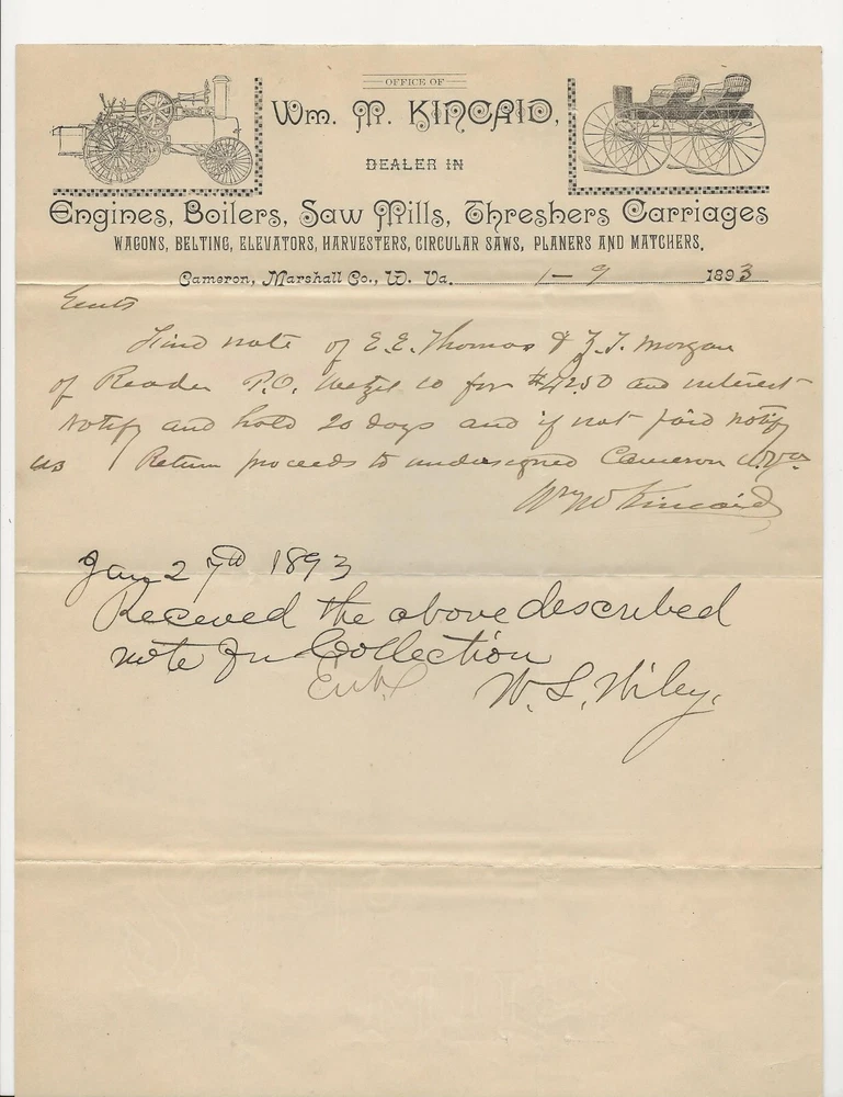 Original 1893 Graphic Illustrated Advertising Letterhead - WM. M. KINCAID. Moundsville, West Virginia. Dealer in Engines, Boilers. Saw Mills, Threshers. Carriages, etc. App.8 x 101/2 ins. DONT LIKE MY BUY IT NOW PRICES, LET'S PLAY AUCTION. Please view scans for condition and E-mail any questions.