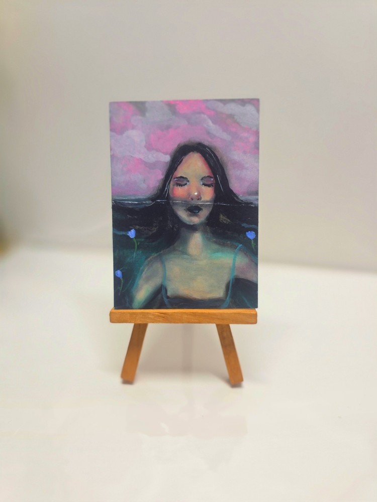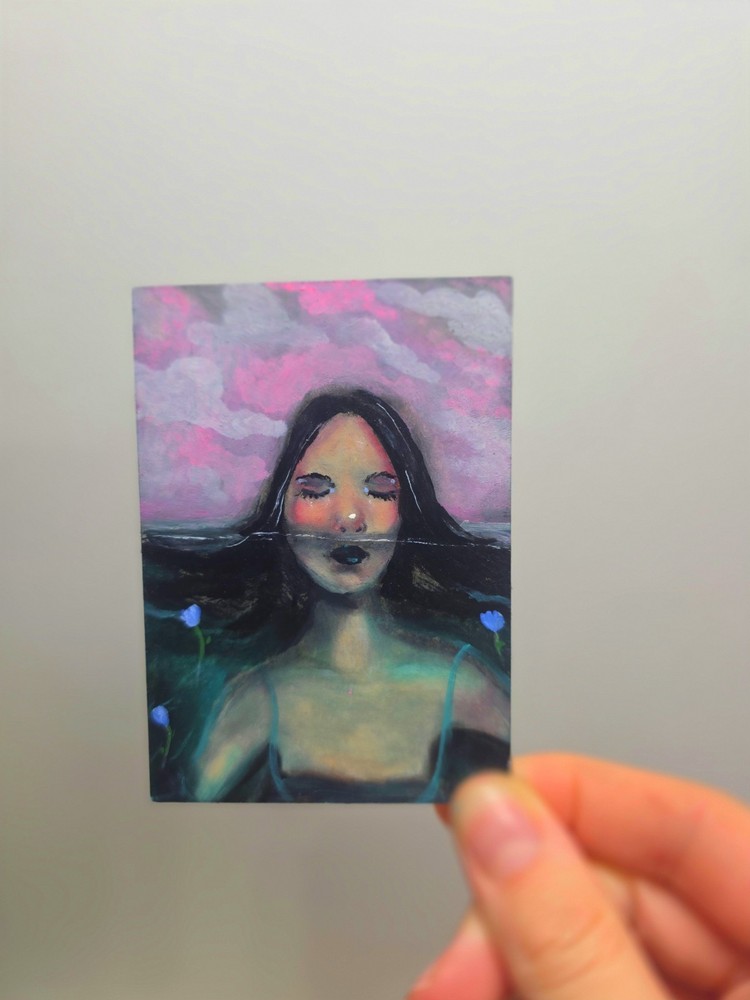 Original ACEO Surreal Portrait Painting Ocean Dreamy Girl Floating Art OOAK