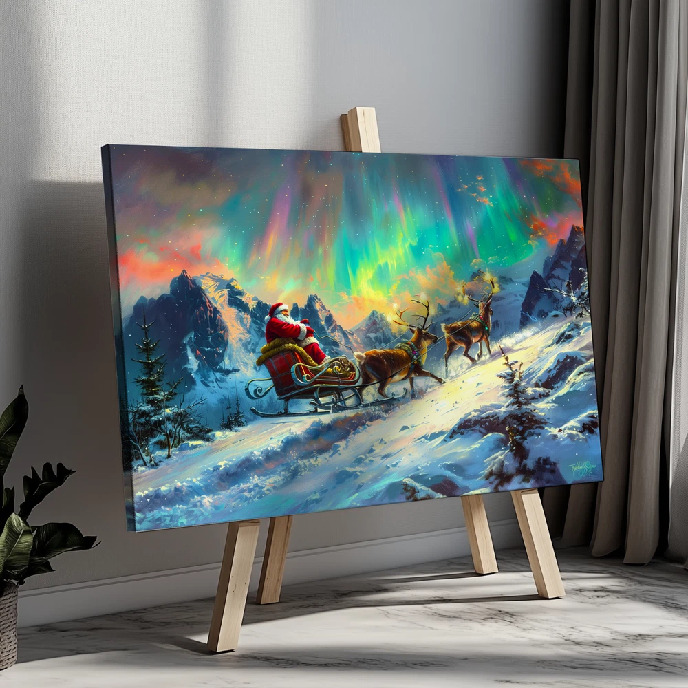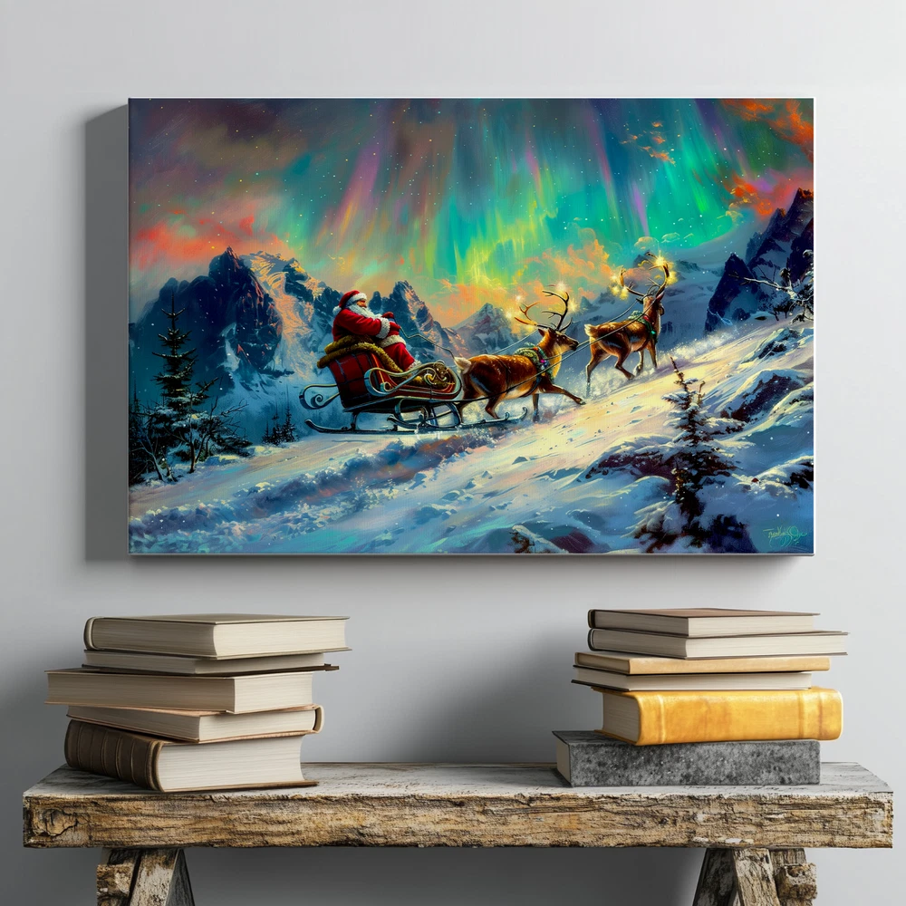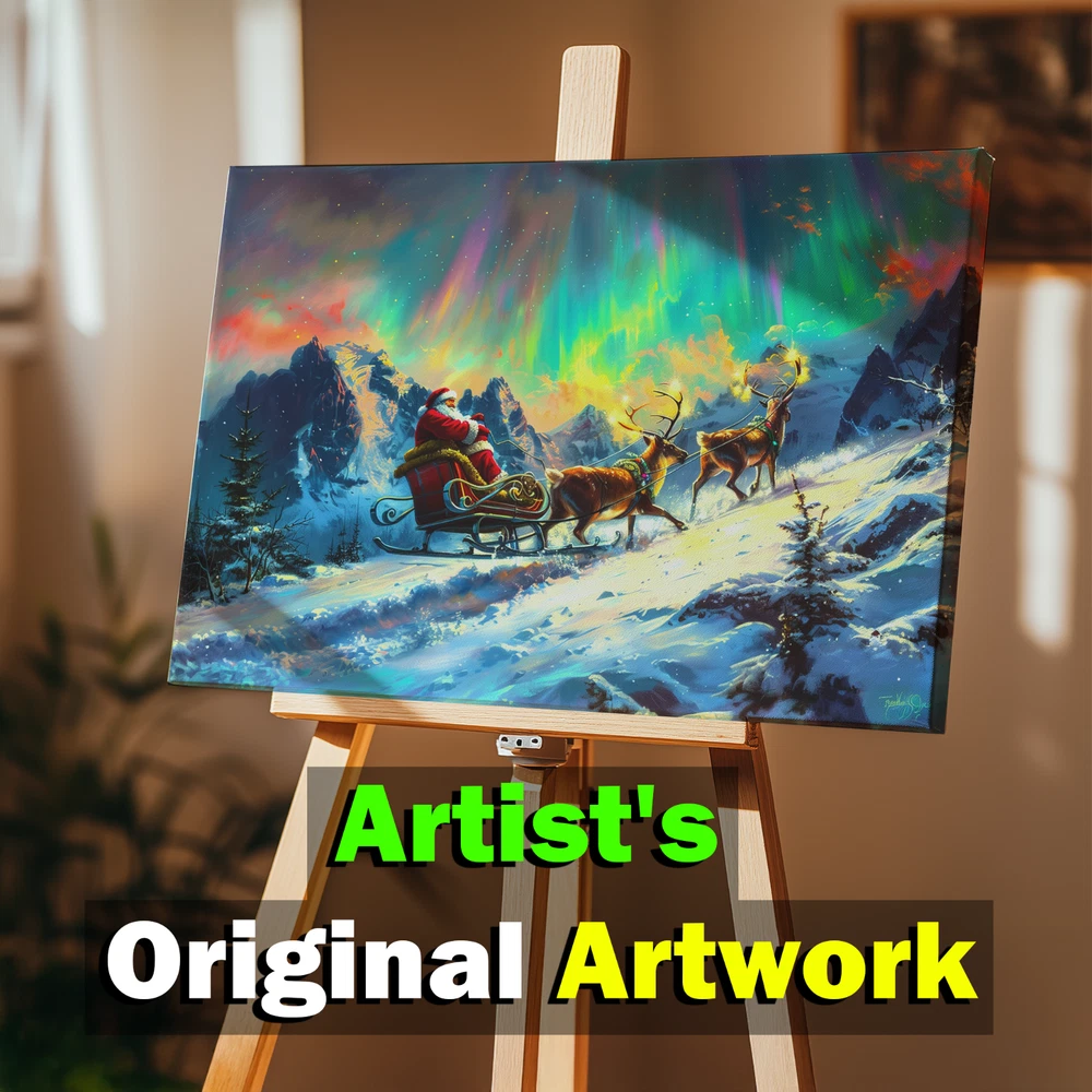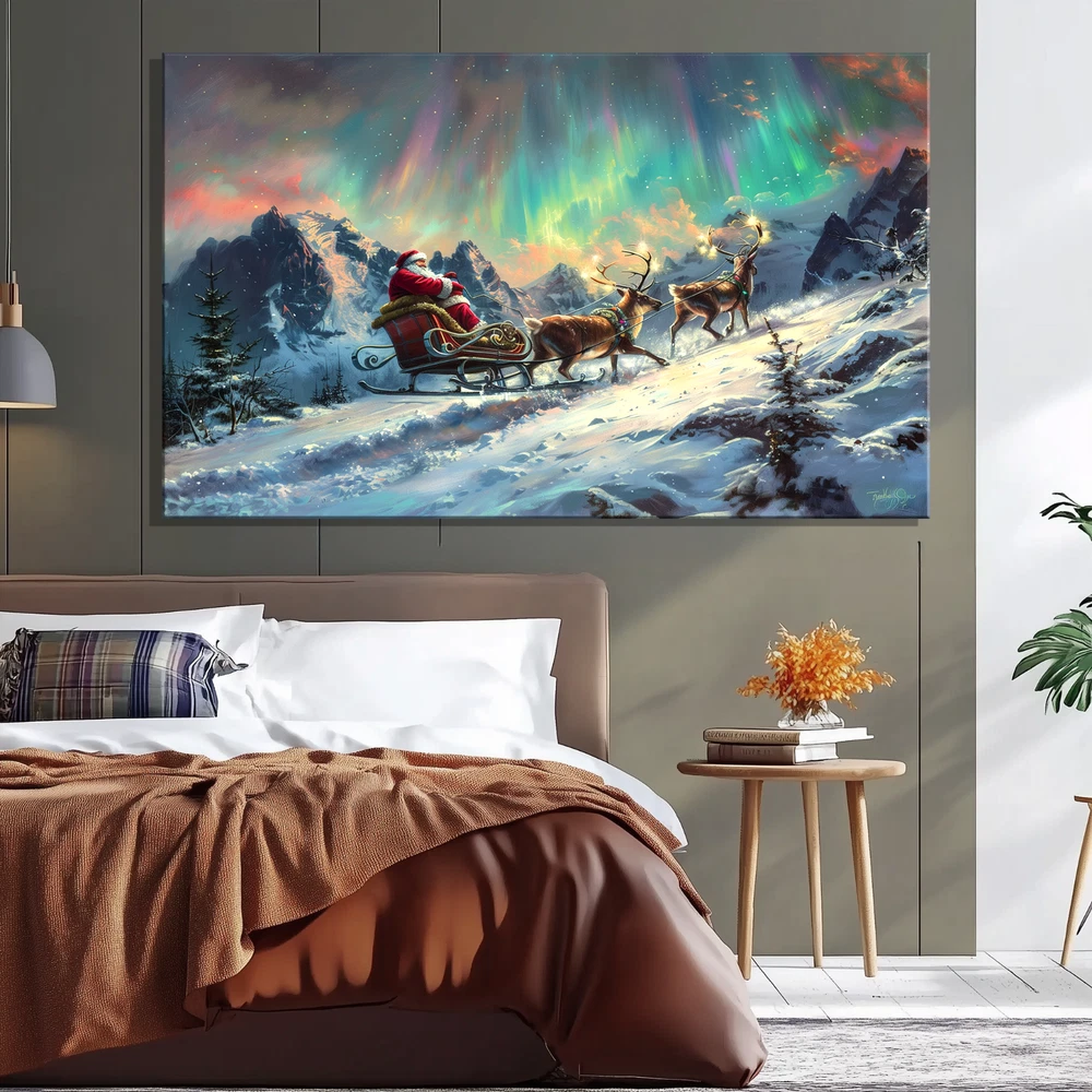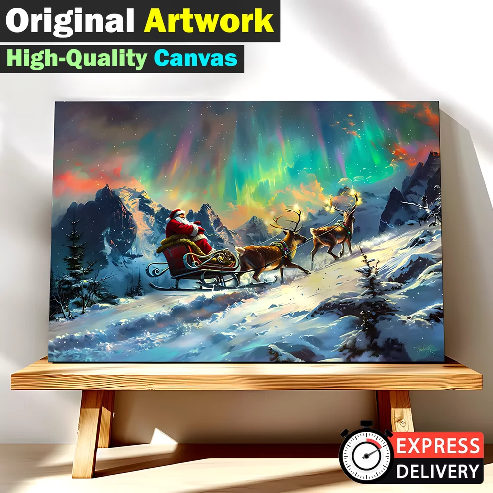 Product Description ❄️ Santa's Sleigh Under the Northern Lights - A Magical Winter Scene ❄️ Original Artwork- Santa Sleigh in Aurora Winter Scene - Framed Canvas Print Bring the enchantment of the holidays to your home with this original artwork depicting Santa Claus on his sleigh gliding through a breathtaking winter wonderland beneath the mesmerizing Aurora Borealis . 🎅✨ This stunning canvas print captures the spirit of Christmas with rich colors, vivid details, and an immersive festive atmosphere. 🌟 Key Features ✅ Original Artwork : A unique, handcrafted design created to elevate your decor. 🖼️ Premium Canvas Material : Expertly printed on high-quality canvas for vibrant, lasting colors. 🏡 Versatile Sizes for Any Space : Available in 5 size options : 8x12 inches (Horizontal) 12x16 inches (Horizontal) 12x18 inches (Horizontal) 16x24 inches (Horizontal) 24x36 inches (Horizontal) Perfect for cozy nooks, living rooms, bedrooms, or feature walls! 🎨 Elegant Framed Design : Arrives ready to hang with a sleek frame that adds sophistication to any room. 🚚 Global Shipping : We deliver worldwide 🌍 so this magical piece of art can be yours no matter where you live. 🎁 Ideal Gift : The perfect holiday or Christmas gift for loved ones who cherish festive art and stunning winter landscapes. 🏠 Perfect For Living Room 🛋️ Bedroom 🛏️ Office 💼 Hallway 🖼️ Kids' Room 🧸 🎄 Transform your space with this festive masterpiece and immerse yourself in the magic of the season. From the glowing Aurora Borealis to Santa's timeless sleigh ride, this artwork brings warmth, joy, and holiday spirit to your home. 🛒 Order now and celebrate the season with art that tells a story! 🎨