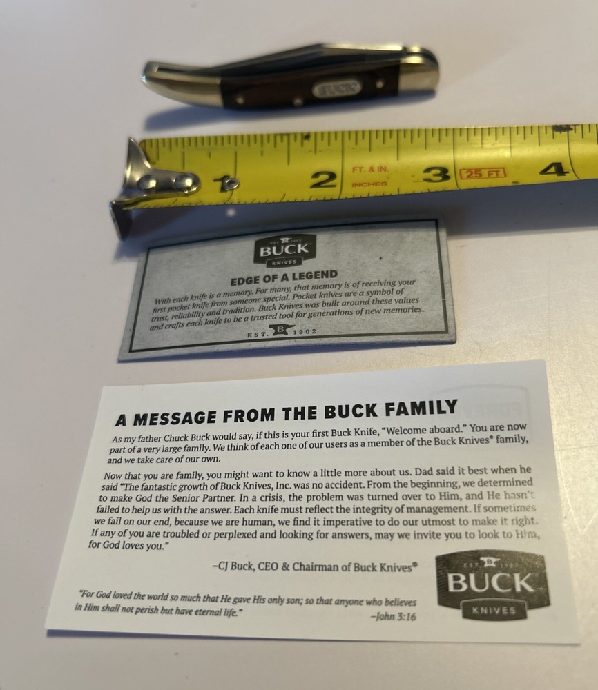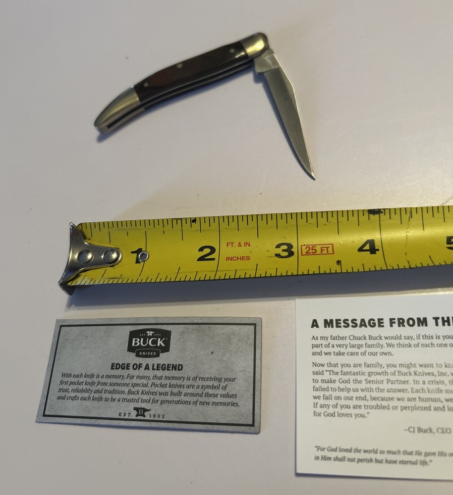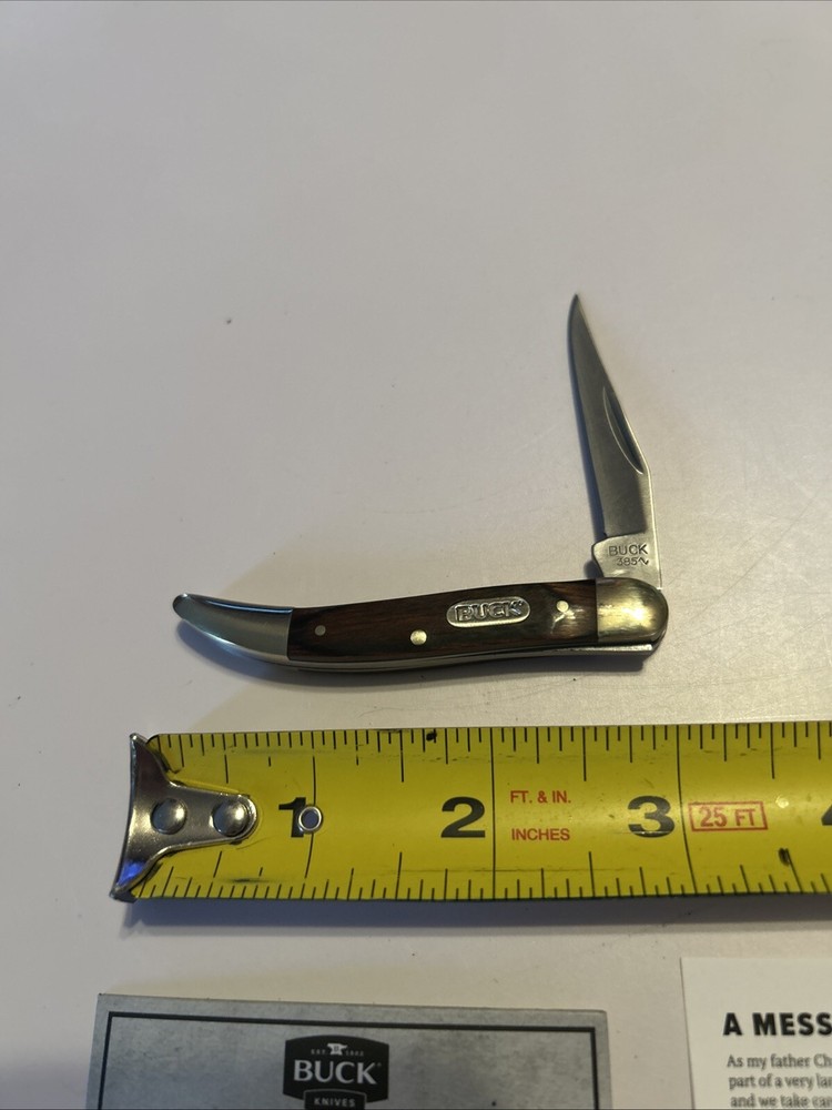 Original Buck Knife 385 Toothpick Folding Pocket Knife. 🔪 SUPER SHARP. It features a brown wood handle and a single blade, specifically a toothpick blade. This is an original!