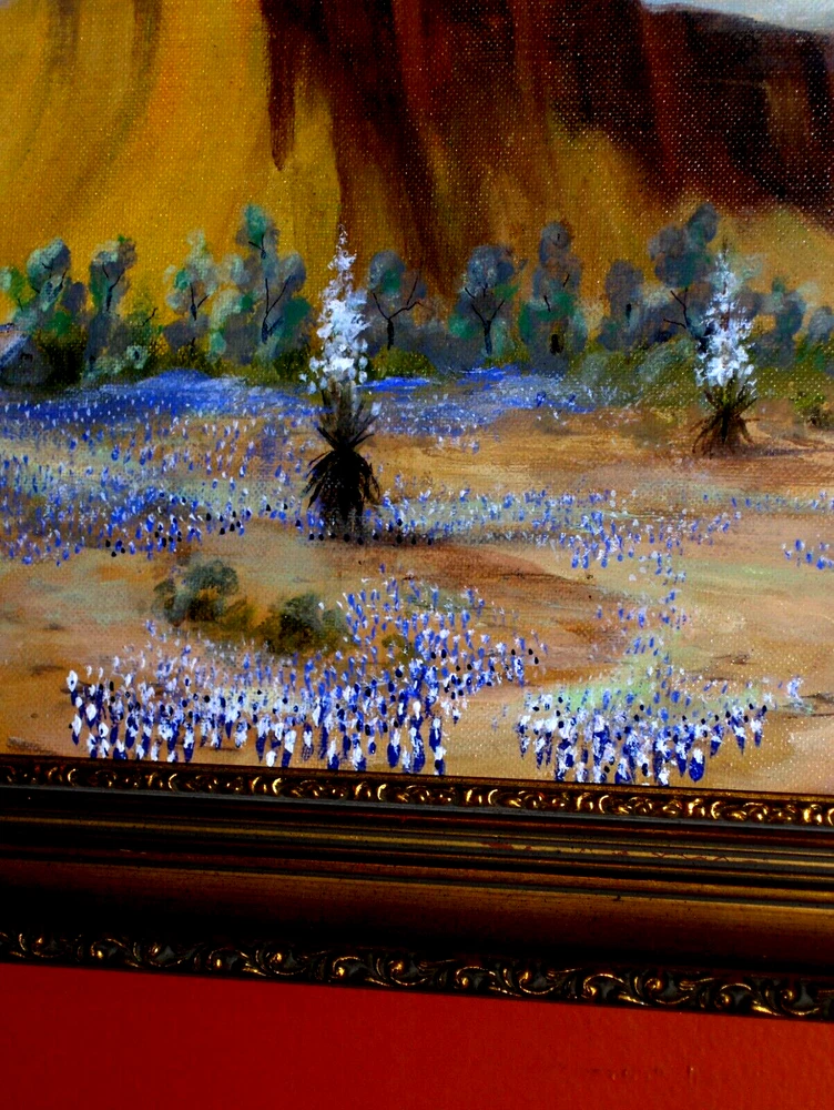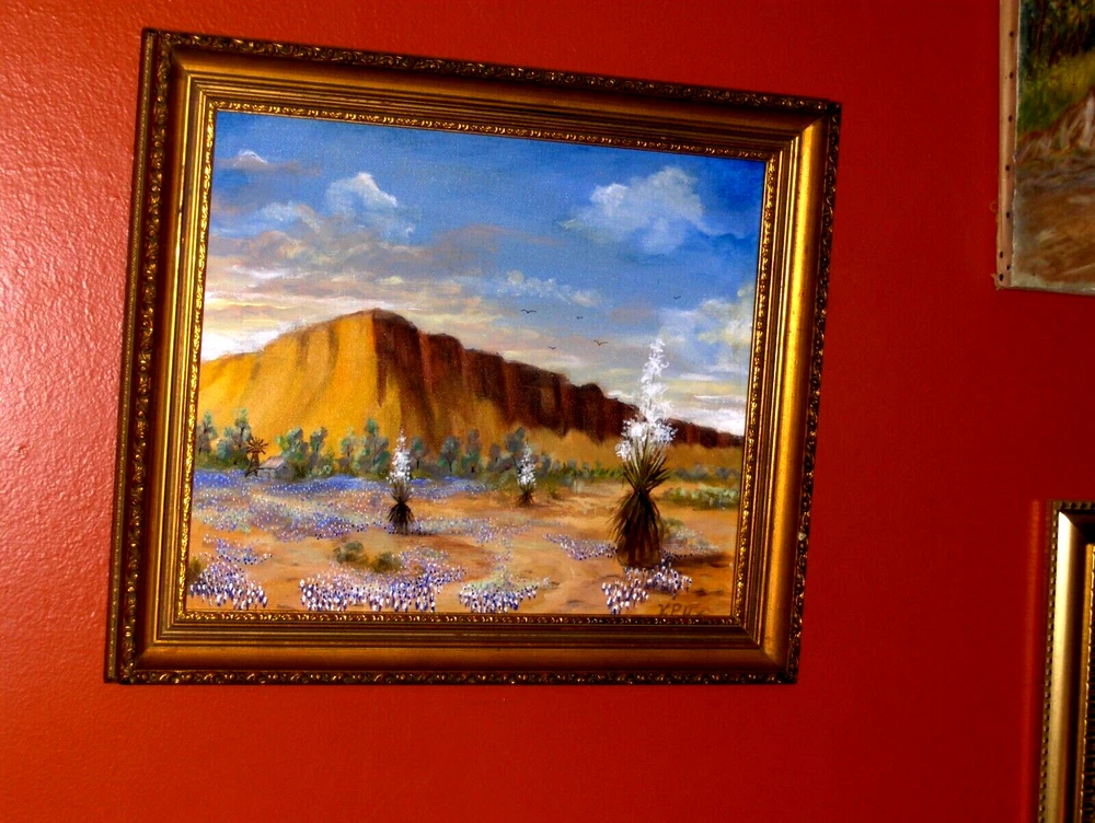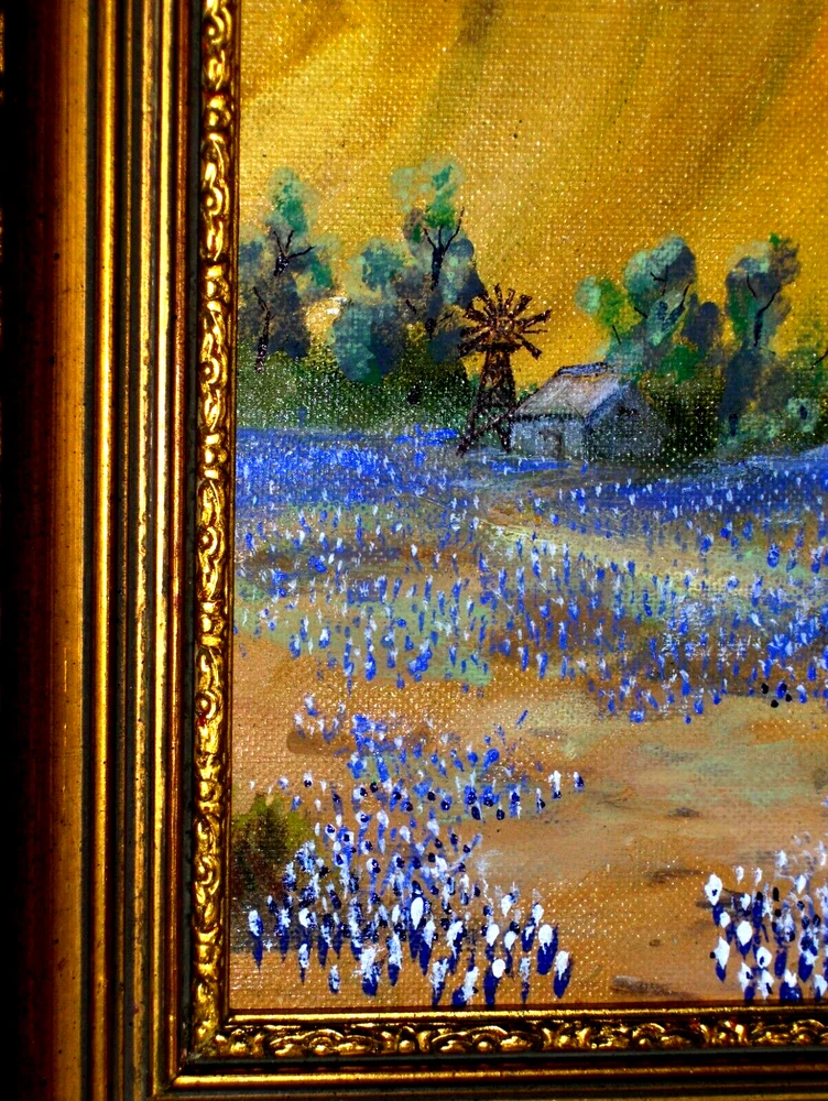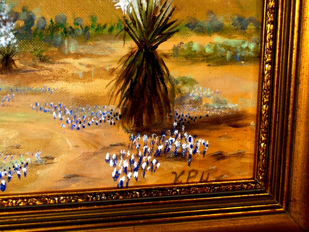 Bl uebonnet Landscape: Rural House, Water Will , Birds, Blooming Yucca, Rocks TX VINTAGE Oil on Canvas panel Excellent for your house!!! Or… Excellent Gift to make somebody happy!!! FAST SHIPPING!! Old Vintage Bluebonnet Landscape! GREAT VISION! Absolutely GORGEOUS ON THE WALL! A CLASSIC STYLE! This is an amazing impressionist painting, framed & ready to hung! Very beautifully done and very decorative. We feel deep emotions captured in this painting and they radiate a mysterious atmosphere. What a harmonious and peaceful landscape! It could remind us about a happy time in life! Signature is on the right side, but is very hard to read:K. P. H. This is an authentic handmade painting, not a giclee, not a reproduction! Medium Size for the frame, circa 20 x 17 Inches, and the painting inside is 17 x 14. Painting is in very good used condition, with minor imperfections, but none noticeable. THE FRAME IS FREE OF CHARGE, as complimentary to the painting! The payment is for the artwork only, not for the frame. We are always offering the frame as a gift, so you will have it at no additional cost, coming with your painting! It is in very good condition, with minor imperfections, tiny scratches and stains, but nothing noticeable. Very Elegant Painting! Just a beautiful piece - don't miss this one. Please enjoy checking on my other items and let me know if you would like any additional information. Thank you!