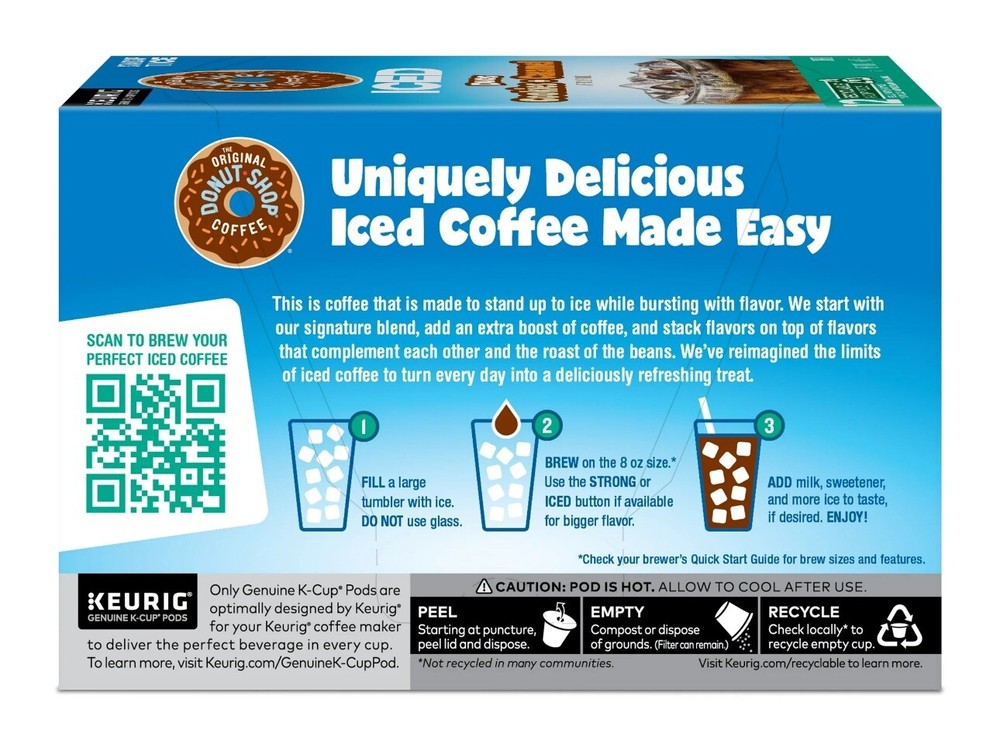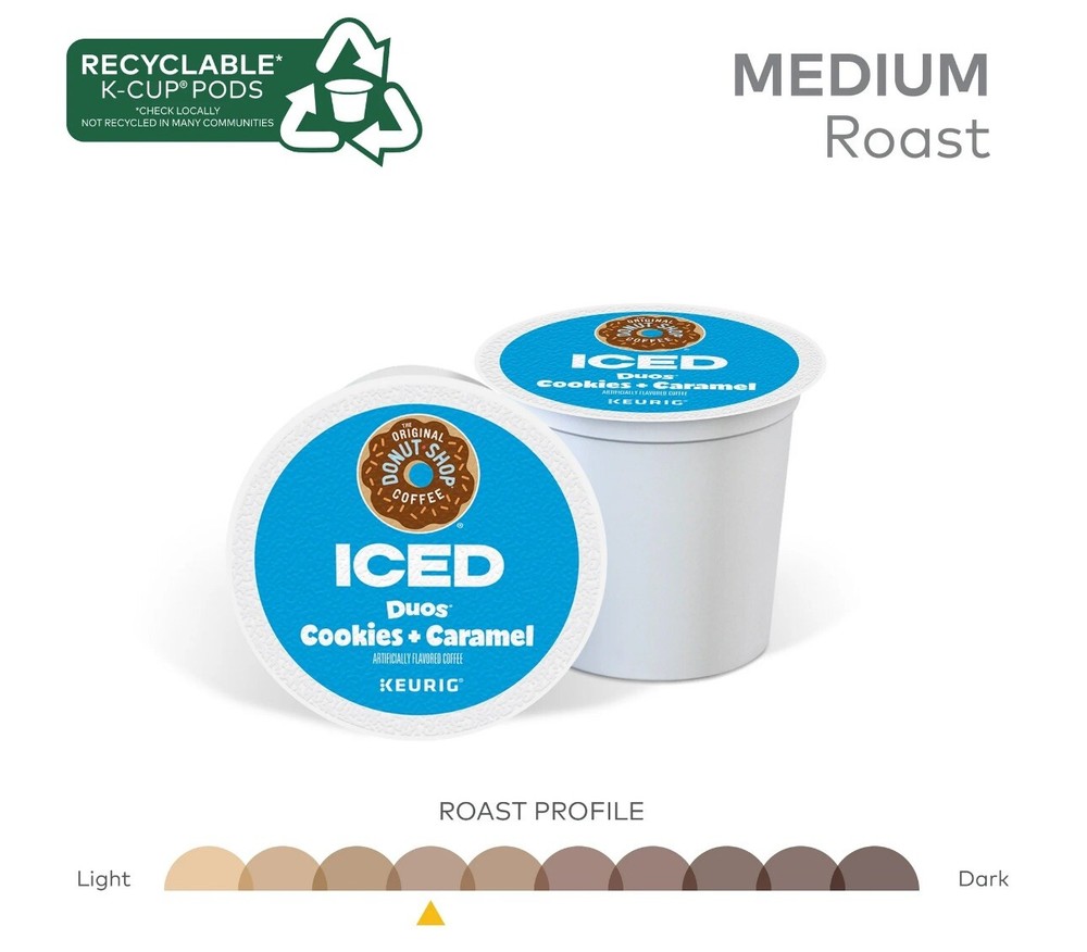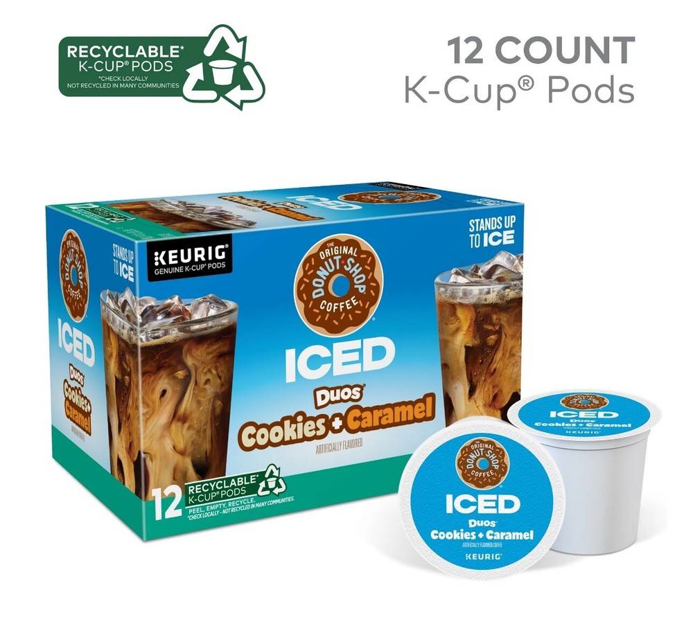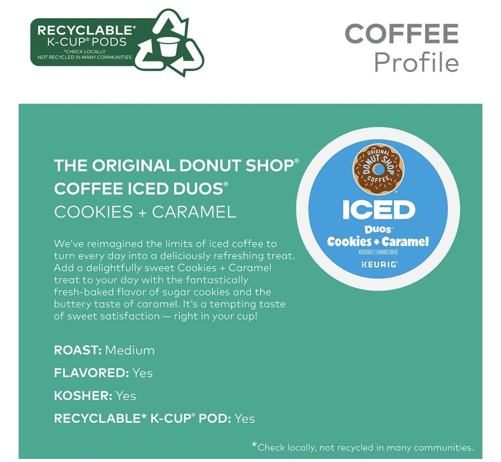 Sweet cookies and gooey caramel flavor are great on their own, but together they’re even better … and a whole lot cooler! The Original Donut Shop® Coffee Iced Duos® Cookies + Caramel coffee blends two flavors that complement each other and the roast of the beans, giving you a uniquely delicious experience in every cup. We blend the fresh-baked flavors of sugar cookies and buttery caramel that come together in a sweet duet of delicious, perfectly roasted harmony that’s chilled to perfection when served over ice. It’s the cookies and “dream” combination come true! These medium roast, caffeinated K-Cup® pods are engineered for guaranteed quality. Each Iced Duos® K-Cup® pod is compatible with any Keurig® single serve coffee maker and designed to stand up to ice. To brew an iced coffee, fill a large tumbler with ice. DO NOT use glass. Brew on the 8 oz size or use the Strong or Iced button, if available, for bigger flavor. Add milk, sweetener, and more ice to taste, if desired, and enjoy! Simple. Delicious. And recyclable*. Enjoy the same great-tasting coffee you know and love, and when you’re done, just peel, empty, and recycle. *Check locally, not recycled in many communities. TASTE: Cookies + Caramel coffee blends the taste of fresh-from-the-oven cookies with smooth, buttery caramel flavors for a duet that’s chilled to perfection when served over ice. ROAST: This medium roast blends the taste of cookies and caramel flavors that come together in a sweet duet of delicious, perfectly roasted harmony. BREW OVER ICE: To brew an iced coffee, fill a large tumbler with ice. DO NOT use glass. Brew on the 8 oz size. Use Strong or Iced button, if available, for bigger flavor. Add milk, sweetener, and more ice to taste, if desired. Enjoy! COMPATIBILITY: Contains genuine K-Cup® pods, engineered for guaranteed quality and compatibility with all Keurig® single serve coffee makers. RECYCLABLE K-CUP® PODS: Simple. Delicious. And recyclable*. Enjoy the same great-tasting coffee you know and love, and when you’re done, just peel, empty, and recycle. *Check locally, not recycled in many communities.