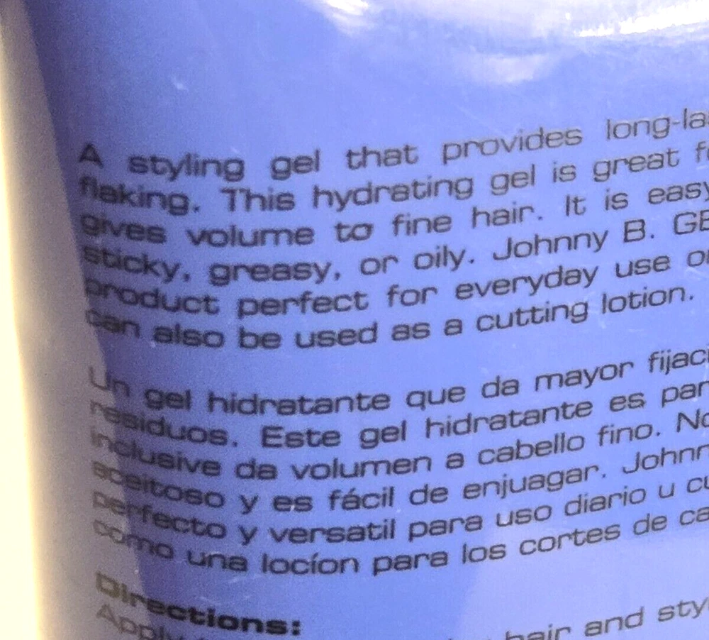 OriginalJohnny B Mode Styling Hair Gel 8 oz Super Hold Gel Coiffant long lasting this product does not come in a box, please see seal in place photo