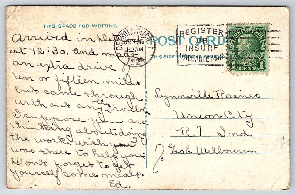Occasion: Postcard Posted: Yes Features: Divided Back, Stamp, Stamped, White Border, Original Genuine Antique Vintage Postcard Brand/Publisher: Unbranded Postage Condition: Posted Subject: Cities & Towns Number of Items in Set: 1 Continent: North America Featured Person: None Theme: Architecture, Cities & Towns, Community Life, Domestic & Family Life, Famous Places, Floral & Gardens, Flowers & Plants, Historical Figures, Landscapes, Nautical, Roadside America, Seasons, Social History, Technology, Transportation, Travel Original/Licensed Reprint: Original Seller Notes: “Good Vintage Condition.” Year Manufactured: 1924 Artist: Postcard Region: Michigan Type: Mail Old Genuine Original Postcard Card Image Picture Antique UPC: DOES NOT APPLY Finish: Matte Character: Postcard Size: Standard (5.5 x 3.5 in) Unit of Sale: Single Unit Vintage: Yes Franchise: Postcard Antique: Yes gtin13: DOES NOT APPLY Stamp: Yes Color: Multicolor Country/Region of Manufacture: United States Era: Divided Back (1907-1915) Signed: Yes Material: Paper Time Period Manufactured: 1920-1929 Orientation: Horizontal Country: United States Signed By: Sender City: Detroit