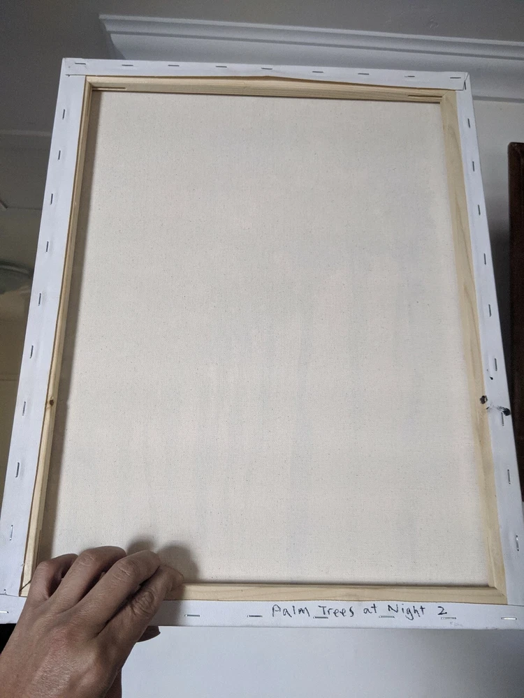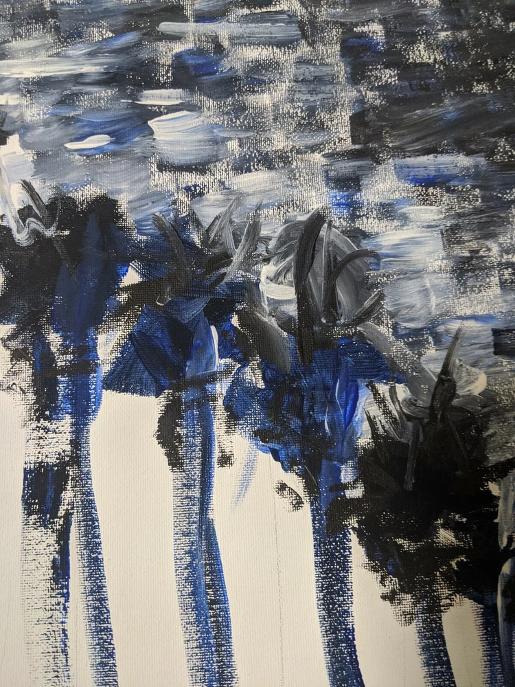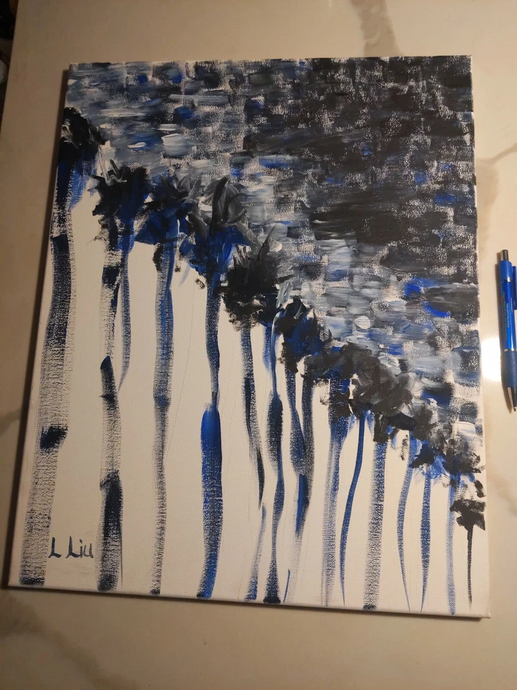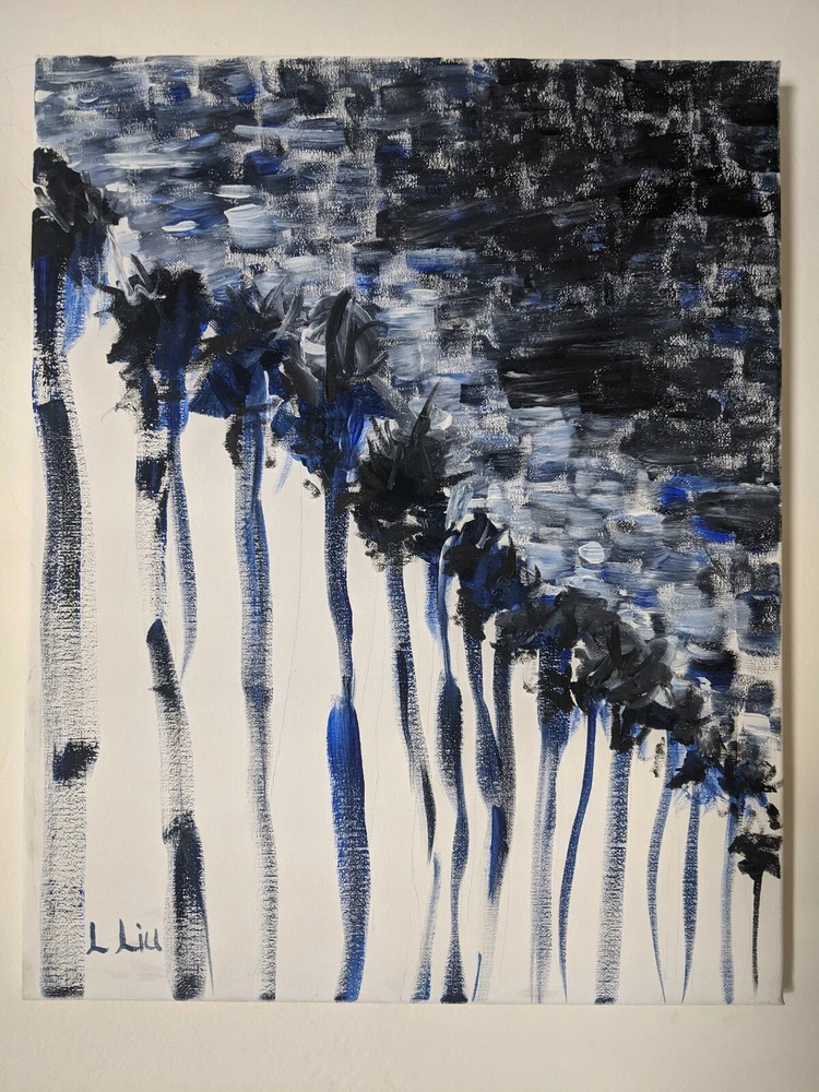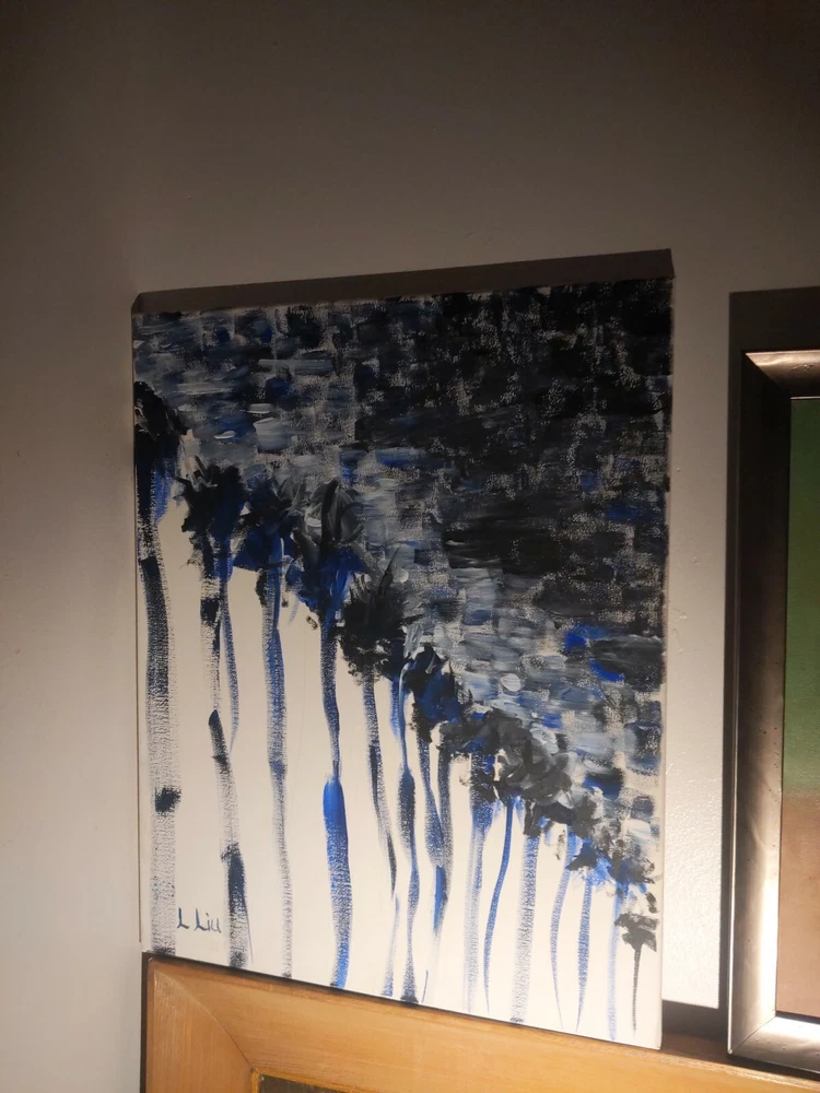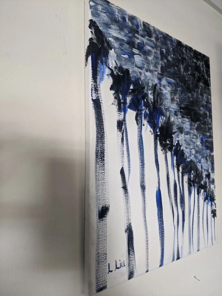 California artist, original painting, Acrylic On Canvas, signed, title written in pen on the back, "Palm Trees at Night II", soothing colors, rhythmic, Elexpressionist modern and abstract painting by Lee Liu.... Shipped with USPS First Class. Wanna see more? Follow on Instagram @cityart_by_mrlee on Instagram