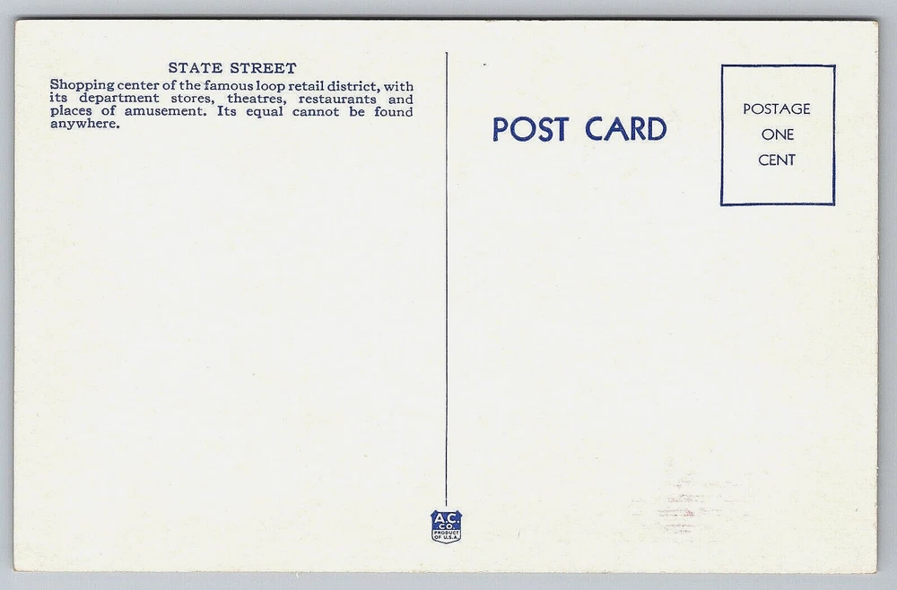 Welcome to People and Places of The Past! Come take a look into generations past of real people and places throughout the world that were photographed by many great people and studios. Here you will find unique antique photographs, real photo postcards, and other vintage postcards that can be used for collecting, genealogy, or crafting. Many of these historic photographs are rare, hard to find, and are one-of-a-kind images that cannot be found any where else. Please contact us if you have any questions about our listed images. Thank You! Chicago IL-Illinois, State Street Shopping Center, Loop Retail District, Vintage Postcard This antique post card is in good, unposted condition. Please see high resolution scans of the front and back of this card closely for detailed cosmetic condition prior to purchase. This post card measures 3.50 inches x 5.50 inches. Vintage post cards can show normal signs of wear associated with an old post card including folds, creases, holes, stains, rips, scratches, worn edges, fading, crackling, handwriting, postage cancellations, postage stamps, being put into or taken out of old postcard albums, or other damage. They will have imperfections from being handled or from being mailed. Please visit our other listings for more unique and one-of-a-kind images of People and Places of The Past! We try our best to represent the item in the images as accurately as we can. However, due to variations in color from image scanners, computer screens, and cell phone displays, the color may be slightly different than the color of the actual product. This post card will be shipped to you packaged well inside of a clear plastic sleeve, inside of a rigid stay flat envelope to keep the card flat and to protect the card during shipping. Shipping within the United States. Your post card will be delivered to the post office the same day or the next business day after receiving payment. Returns are accepted within 30 days. Each item is inspected, packaged, weighed, and sealed individually for FAST SHIPPING! Thank You for visiting People and Places of The Past!