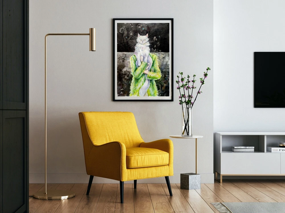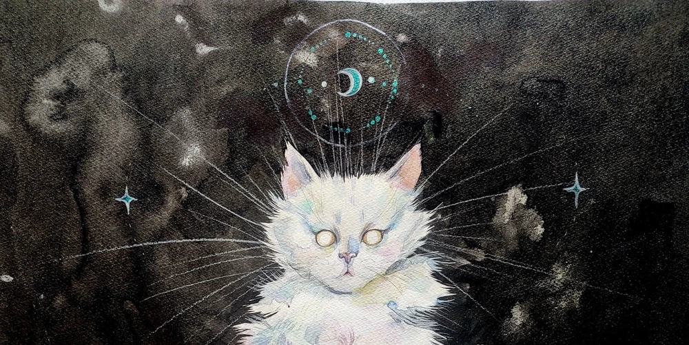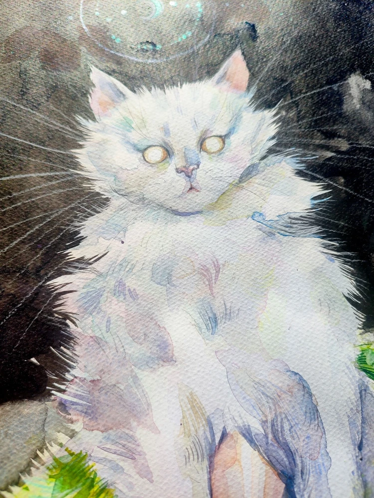 Encounter with a bright flash from the night field. And who is the flash in this picture? -ORIGINAL painting. This is not a copy or print. -Professional quality artists light fast, transparent watercolor paints and paper. -Signature on the front and on the back. -Size: 59*42 cm. / 23x16.5" inches -This painting is not framed. It will need to be framed behind glass. Place on a wall in your home away from direct sunlight. -Free shipping with tracking number cat painting,white cat painting,grunge art,grunge painting,bold watercolor painting,dark watercolor painting,watercolor painting,cat watercolor painting,fashion painting,green fur coat painting,woman art,woman painting,female art,female painting,feminine art,feminine painting,original art,colorful painting,original painting