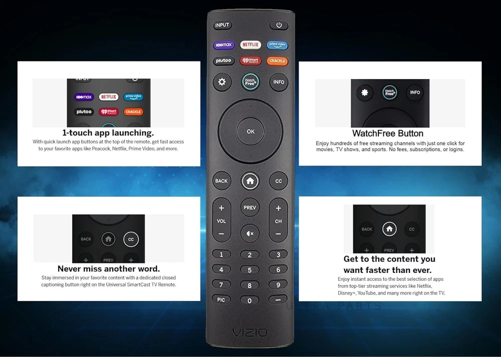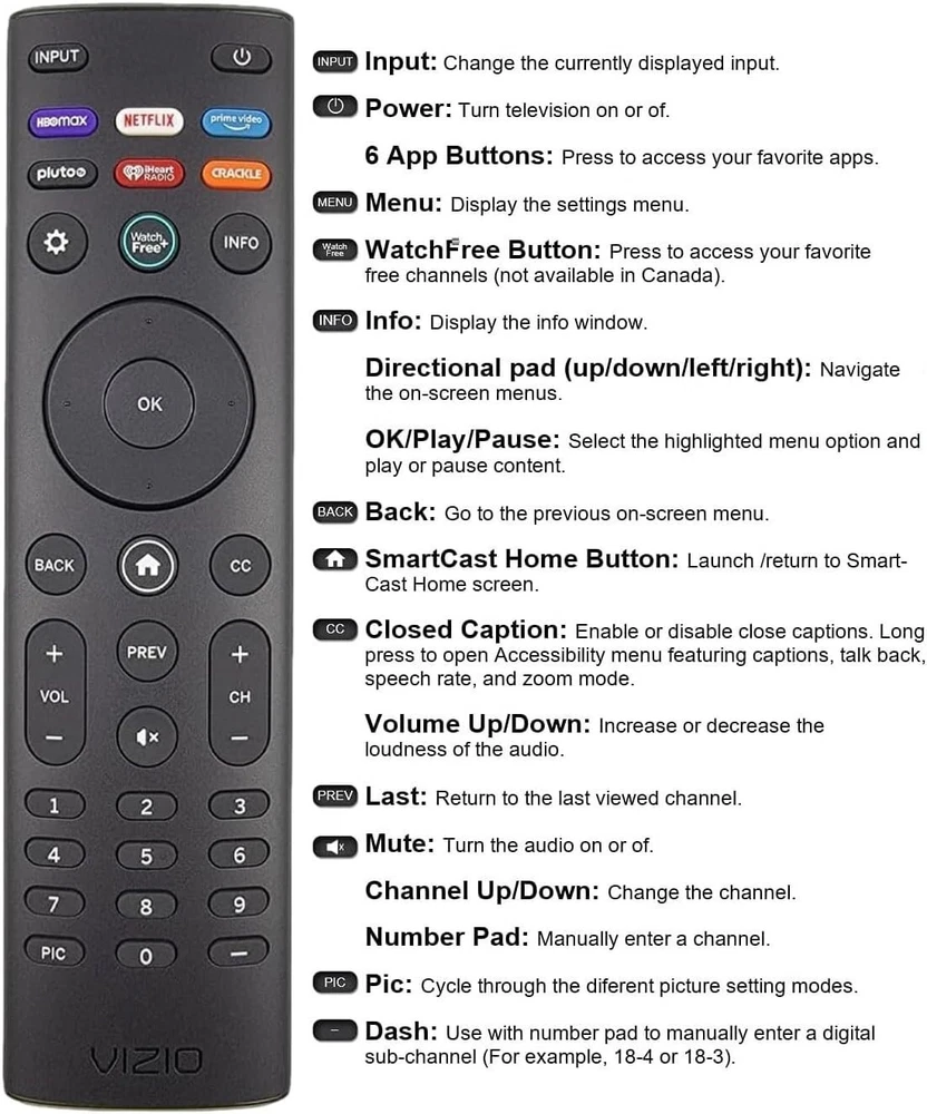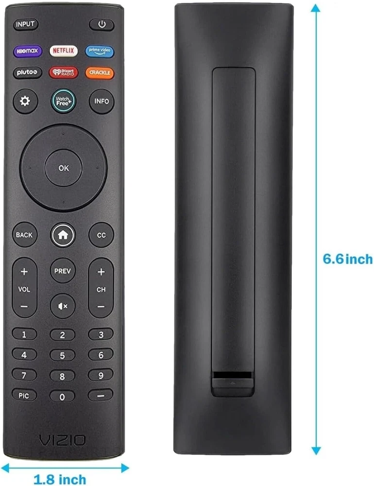 OEM Replacement Remote Control XRT140 fits for All VIZIO LED LCD HD UHD HDR Smartcast 4K 3D Smart TVs, including D-Series, E-Series, M-Series, P-Series, PX-Series, V-Series, OLED-Series with 4 Shortcut APP Keys - HBO Max, Netflix, PrimeVideo, Pluto, iHeart, and Crackle buttons. Compatibility: Full HD 4K-Series: VHD32M-0807 VHD24M-0810 VFD32M-0807 VFD40M-0810 VFD43M-0804 V4K43M-0801 V4K50M-0807 V4K55M-0801 V4K65M-0804 V4K70M-0801 V4K75M-0804 V4K86C-0804 D-Series: D24h-J09 D24F-F1 D24F-G9 D24H-G9 D32h-J09 D32F-F1 D32F-G4 D32H-F0 D32H-F1 D32H-F4 D39F-F0 D39F-F1 D40F-F1 D40F-G9 D43-F1 D43F-F1 D43F-F2 D43FX-F4 D48F-F0 D50-F1 D50-F501 D50F-F1 D50X-G9 D55-F2 D55X-G1 D60-F3 D65-F1 D65X-G4 D70-F3 D24F-G1 D32F-G1 D32H-G9 E-Series: E32-D1 E32H-D1 E40-D0 E43-D2 E43-E2 E43-F1 E43U-D2 E48-D0 E48U-D0 E49U-D1 E50-D1 E50-E1 E50-E3 E50-F2 E50U-D2 E50X-E1 E55-D0 E55-E1 E55-E2 E55-F0 E55-F1 E55U-D0 E55U-D2 E60E-3 E60-E3 E60-F3 E60U-D3 E65-D0 E65-D1 E65-E0 E65-E1 E65-E3 E65-F0 E65-F1 E65U-D1 E65U-D3 E70-D3 E70-E3 E70-F3 E70U-D3 E75-E16 E75-E3 E75-F1 E75-F2 E80-E3 E80-F3 E80U-DE M-Series: M50-D1 M50-E1 M55-D0 M55-E0 M55-F0 M60-D1 M65-D0 M437-G0 M507-G1 M557-G0 M558-G1 M657-G0 M658-G1 M65-E0 M65-F0 M70-D3 M70-E3 M70-F0 M70-F3 M75-E1 M80-D3 M43Q6-J04 M43Q6M-K04 M50Q6-J01 M50QXM-K01 M55Q6-J01 M65Q6-J09 M65Q6M-K04 M75Q6-J03 P/PX-Series: P50-C1 P55-C1 P55-E1 P55-F1 P55RED-F1 P65-C1 P65-C1 P65-E1 P65-F1 P75-C1 P75-E1 P75-F1 P659-G1 P759-G1 PX65-G1 PX75-G1 PQ65-F1 V-Series: V405-G9 V435-G0 V435-G1 V436-G1 V555-G1 V556-G1 V585-G1 V605-G3 V655-G9 V656-G4 V705-G1 V705-G3 V755-G4 V505-G9 V435-J01 V435M-K04 V505-J09 V505M-K09 V555-J01 V585-J01 V655-J09 V655M-K04 V655M-K03 V705-J01 V705-J03 V755-J04 OLED-series: VQD43M-0801 M55Q6-L4 M65Q6-L4 M75Q6-L4 VQP65C-84 VQP75C-84 OLED65-H1 OLED55-H1 Product Description Compatible Brand: VIZIO Smartcast 4K 3D Smart TVs Remote Feature Shortcuts: HBO Max, Netflix, PrimeVideo, Pluto, iHeart, and Crackle buttons. Upgrade Chip, Durable Lifespan, High Quality, and Stable Performance. Designed for easy replacement and operation. Color: Black Material: ABS Material. Stability and Safety: Better viewing experience, Easy to pair, and made from premium quality materials for long-lasting durability. Package Content: 1 x IR Remote Control (Batteries and Instruction Manual are not included).