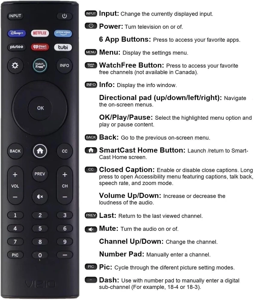 OEM Replacement Remote Control XRT140 fits for All VIZIO LED LCD HD UHD HDR Smartcast 4K 3D Smart TVs, including D-Series, E-Series, M-Series, P-Series, PX-Series, V-Series, OLED-Series with 4 Shortcut APP Keys - Disney+, Netflix, PrimeVideo, Pluto, iHeart and Tubi buttons. Compatibility: Full HD 4K-Series: VHD32M-0807 VHD24M-0810 VFD32M-0807 VFD40M-0810 VFD43M-0804 V4K43M-0801 V4K50M-0807 V4K55M-0801 V4K65M-0804 V4K70M-0801 V4K75M-0804 V4K86C-0804 D-Series: D24h-J09 D24F-F1 D24F-G9 D24H-G9 D32h-J09 D32F-F1 D32F-G4 D32H-F0 D32H-F1 D32H-F4 D39F-F0 D39F-F1 D40F-F1 D40F-G9 D43-F1 D43F-F1 D43F-F2 D43FX-F4 D48F-F0 D50-F1 D50-F501 D50F-F1 D50X-G9 D55-F2 D55X-G1 D60-F3 D65-F1 D65X-G4 D70-F3 D24F-G1 D32F-G1 D32H-G9 E-Series: E32-D1 E32H-D1 E40-D0 E43-D2 E43-E2 E43-F1 E43U-D2 E48-D0 E48U-D0 E49U-D1 E50-D1 E50-E1 E50-E3 E50-F2 E50U-D2 E50X-E1 E55-D0 E55-E1 E55-E2 E55-F0 E55-F1 E55U-D0 E55U-D2 E60E-3 E60-E3 E60-F3 E60U-D3 E65-D0 E65-D1 E65-E0 E65-E1 E65-E3 E65-F0 E65-F1 E65U-D1 E65U-D3 E70-D3 E70-E3 E70-F3 E70U-D3 E75-E16 E75-E3 E75-F1 E75-F2 E80-E3 E80-F3 E80U-DE M-Series: M50-D1 M50-E1 M55-D0 M55-E0 M55-F0 M60-D1 M65-D0 M437-G0 M507-G1 M557-G0 M558-G1 M657-G0 M658-G1 M65-E0 M65-F0 M70-D3 M70-E3 M70-F0 M70-F3 M75-E1 M80-D3 M43Q6-J04 M43Q6M-K04 M50Q6-J01 M50QXM-K01 M55Q6-J01 M65Q6-J09 M65Q6M-K04 M75Q6-J03 P/PX-Series: P50-C1 P55-C1 P55-E1 P55-F1 P55RED-F1 P65-C1 P65-C1 P65-E1 P65-F1 P75-C1 P75-E1 P75-F1 P659-G1 P759-G1 PX65-G1 PX75-G1 PQ65-F1 V-Series: V405-G9 V435-G0 V435-G1 V436-G1 V555-G1 V556-G1 V585-G1 V605-G3 V655-G9 V656-G4 V705-G1 V705-G3 V755-G4 V505-G9 V435-J01 V435M-K04 V505-J09 V505M-K09 V555-J01 V585-J01 V655-J09 V655M-K04 V655M-K03 V705-J01 V705-J03 V755-J04 OLED-series: VQD43M-0801 M55Q6-L4 M65Q6-L4 M75Q6-L4 VQP65C-84 VQP75C-84 OLED65-H1 OLED55-H1 Product Description Compatible Brand: VIZIO Smartcast 4K 3D Smart TVs Remote Feature Shortcuts: Disney+, Netflix, PrimeVideo, Pluto, iHeart and Tubi buttons. Upgrade Chip, Durable Lifespan, High Quality, and Stable Performance. Designed for easy replacement and operation. Color: Black Material: ABS Material. Stability and Safety: Better viewing experience, Easy to pair, and made from premium quality materials for long-lasting durability. Package Content: 1 x IR Remote Control (Batteries and Instruction Manual are not included).