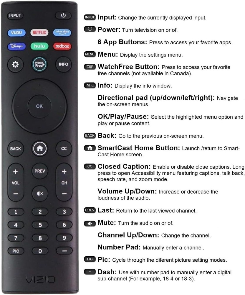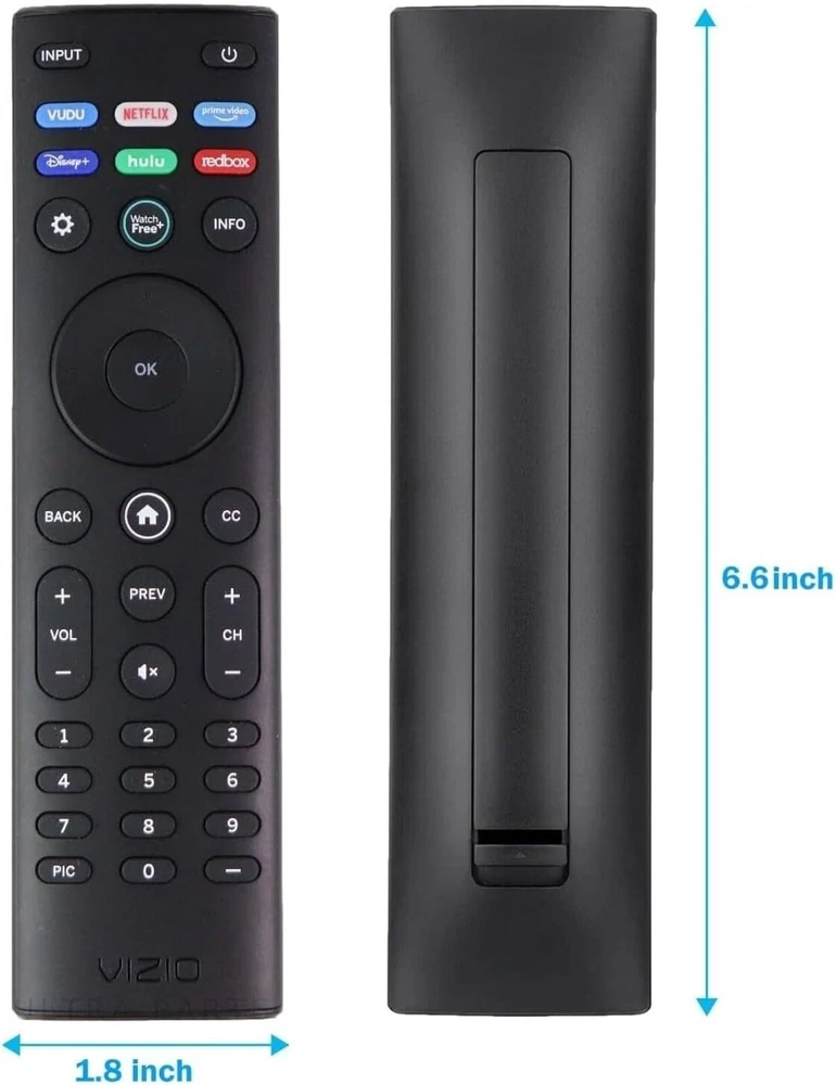 OEM Replacement Remote Control XRT140 fits for All VIZIO LED LCD HD UHD HDR Smartcast 4K 3D Smart TVs, including D-Series, E-Series, M-Series, P-Series, PX-Series, V-Series, OLED-Series with 4 Shortcut APP Keys - Vudu, Netflix, PrimeVideo, Disney+, Hulu, and Redbox buttons. Compatibility: Full HD 4K-Series: VHD32M-0807 VHD24M-0810 VFD32M-0807 VFD40M-0810 VFD43M-0804 V4K43M-0801 V4K50M-0807 V4K55M-0801 V4K65M-0804 V4K70M-0801 V4K75M-0804 V4K86C-0804 D-Series: D24h-J09 D24F-F1 D24F-G9 D24H-G9 D32h-J09 D32F-F1 D32F-G4 D32H-F0 D32H-F1 D32H-F4 D39F-F0 D39F-F1 D40F-F1 D40F-G9 D43-F1 D43F-F1 D43F-F2 D43FX-F4 D48F-F0 D50-F1 D50-F501 D50F-F1 D50X-G9 D55-F2 D55X-G1 D60-F3 D65-F1 D65X-G4 D70-F3 D24F-G1 D32F-G1 D32H-G9 E-Series: E32-D1 E32H-D1 E40-D0 E43-D2 E43-E2 E43-F1 E43U-D2 E48-D0 E48U-D0 E49U-D1 E50-D1 E50-E1 E50-E3 E50-F2 E50U-D2 E50X-E1 E55-D0 E55-E1 E55-E2 E55-F0 E55-F1 E55U-D0 E55U-D2 E60E-3 E60-E3 E60-F3 E60U-D3 E65-D0 E65-D1 E65-E0 E65-E1 E65-E3 E65-F0 E65-F1 E65U-D1 E65U-D3 E70-D3 E70-E3 E70-F3 E70U-D3 E75-E16 E75-E3 E75-F1 E75-F2 E80-E3 E80-F3 E80U-DE M-Series: M50-D1 M50-E1 M55-D0 M55-E0 M55-F0 M60-D1 M65-D0 M437-G0 M507-G1 M557-G0 M558-G1 M657-G0 M658-G1 M65-E0 M65-F0 M70-D3 M70-E3 M70-F0 M70-F3 M75-E1 M80-D3 M43Q6-J04 M43Q6M-K04 M50Q6-J01 M50QXM-K01 M55Q6-J01 M65Q6-J09 M65Q6M-K04 M75Q6-J03 P/PX-Series: P50-C1 P55-C1 P55-E1 P55-F1 P55RED-F1 P65-C1 P65-C1 P65-E1 P65-F1 P75-C1 P75-E1 P75-F1 P659-G1 P759-G1 PX65-G1 PX75-G1 PQ65-F1 V-Series: V405-G9 V435-G0 V435-G1 V436-G1 V555-G1 V556-G1 V585-G1 V605-G3 V655-G9 V656-G4 V705-G1 V705-G3 V755-G4 V505-G9 V435-J01 V435M-K04 V505-J09 V505M-K09 V555-J01 V585-J01 V655-J09 V655M-K04 V655M-K03 V705-J01 V705-J03 V755-J04 OLED-series: VQD43M-0801 M55Q6-L4 M65Q6-L4 M75Q6-L4 VQP65C-84 VQP75C-84 OLED65-H1 OLED55-H1 Product Description Compatible Brand: VIZIO Smartcast 4K 3D Smart TVs Remote Feature Shortcuts:Vudu, Netflix, PrimeVideo, Disney+, Hulu, and Redbox buttons. Upgrade Chip, Durable Lifespan, High Quality, and Stable Performance. Designed for easy replacement and operation. Color: Black Material: ABS Material. Stability and Safety: Better viewing experience, Easy to pair, and made from premium quality materials for long-lasting durability. Package Content: 1 x IR Remote Control (Batteries and Instruction Manual are not included).