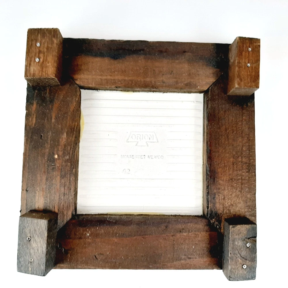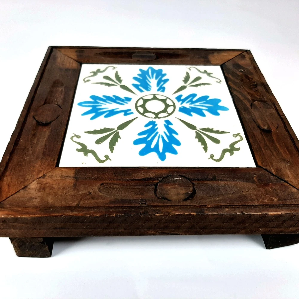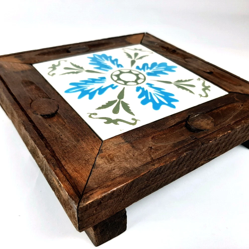 Square Blue White & Olive Green Ceramic Orion Trivet Wood Frame Monterey Mexico Measures approximately 6.75" x 6.75" x 1.5" tall Great condition with only minor discoloration/weathering of wood frame which just adds to its bcharacter