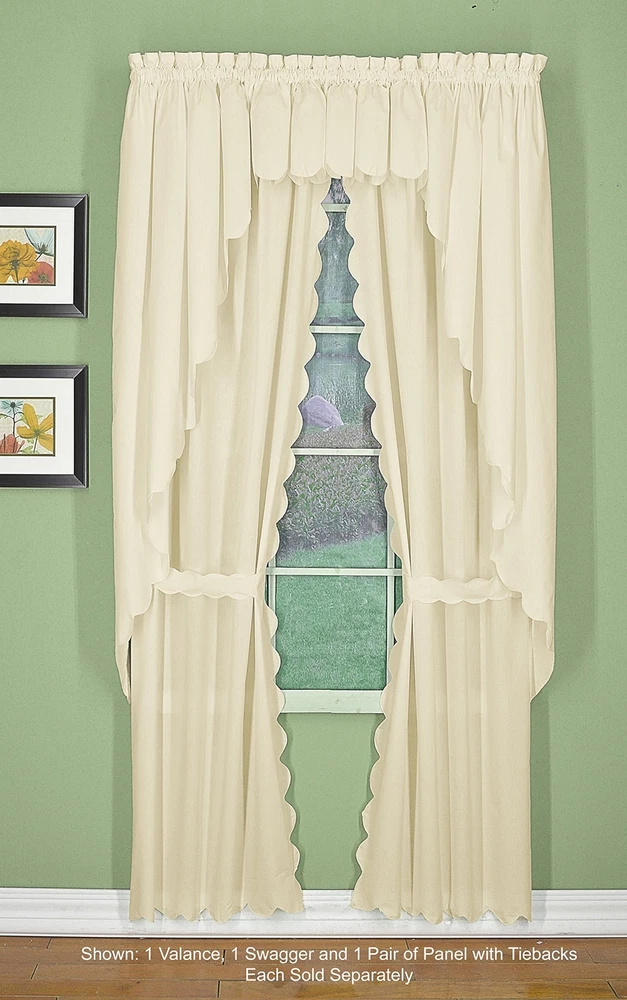 Orleans: tambour scallop edge curtain a classic look reminiscent of the Cape Cod curtain in style but with an updated design. This 50percent cotton 50percent polyester tambour scallop edge curtain will bring grace and elegance to any room. Every piece is beautifully embellished with scalloped edge bottom and/or side. Swags, valances and fan inserts are available to create your own favorite combinations of window toppers. Tiers in 30 inch and 36 inch come with pair of tiebacks. Panel pairs comes with pair of coordinated tiebacks! each piece hangs with a rod pocket and fit a rod up to 1 inch in diameter. Available in colors: white, ecru, sage, Buttercup, brick red and linen. Machine washable, easy care. Panel pair with tiebacks, valances, swag pair, Tier pair and fan insert are sold separately. 65Percent polyester; 35Percent cotton Engineered Tambour Scallop Edges Solid color, poly-cotton blend, Easy care-machine washable Engineered tambour scallop edges in L shaped panel pair, 2 tiebacks included, 4-piece-set