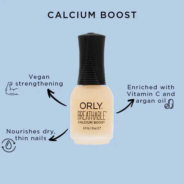 Thin, weak nails? Build strength with ORLY Breathable Calcium Boost. This nail strengthener is enriched with vegan calcium and Vitamin B5. Vitamin C and Argan Oil combine to nourish dry, damaged, and thin nails. Apply one coat to all nails once a day for a minimum of one week. Repeat for stronger, thicker nail growth. Use with ORLY Breathable Cuticle Oil to promote healthier nails.