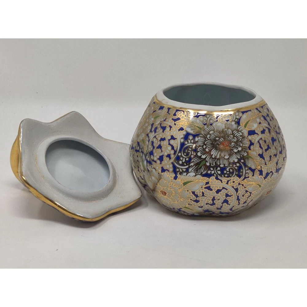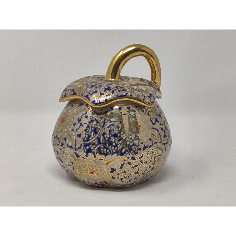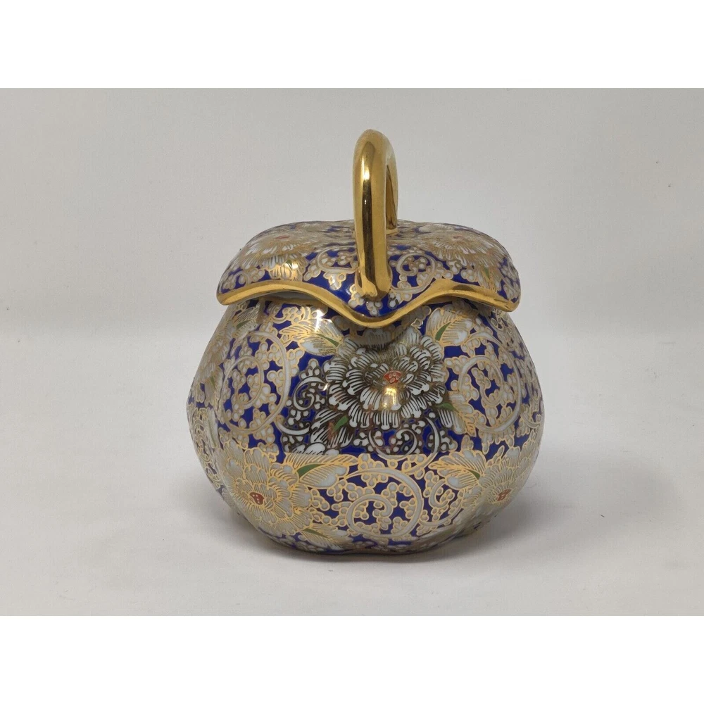 This is a hand painted pumpkin shaped trinket box. The colors are blue, gold, and red in a floral design. The trinket box is in immaculate condition as pictured. Hand painted in Thailand. The box measures 3 3/4" tall, 5" diameter. 5 1/2" tall with lid. CROSSPOSTED THANKS FOR VIEWING!