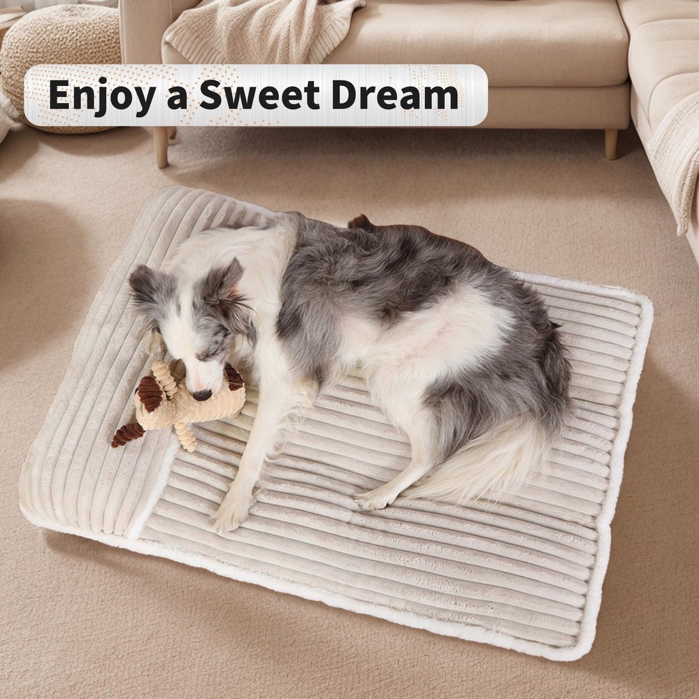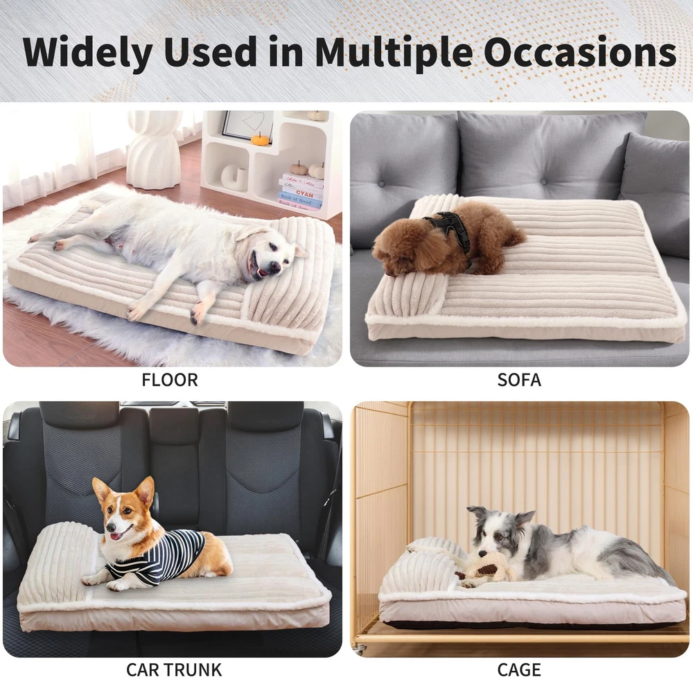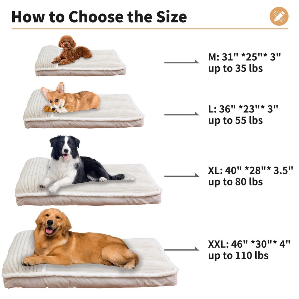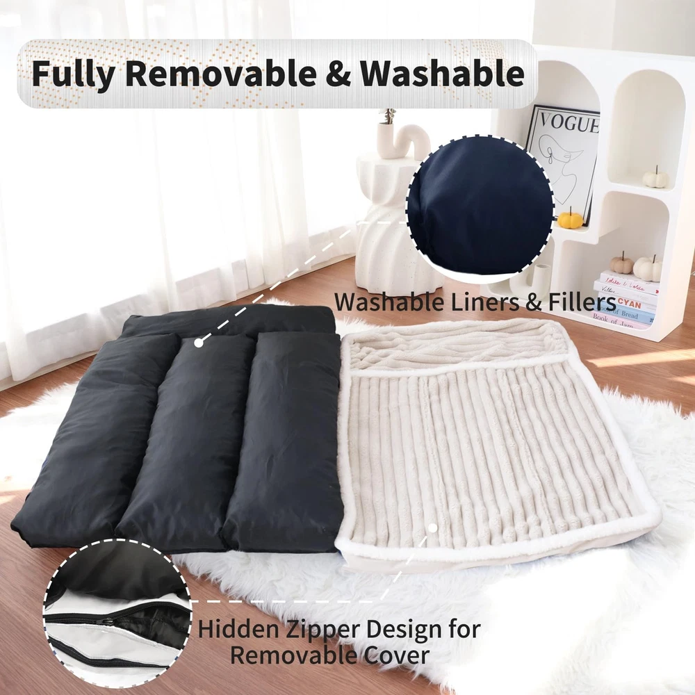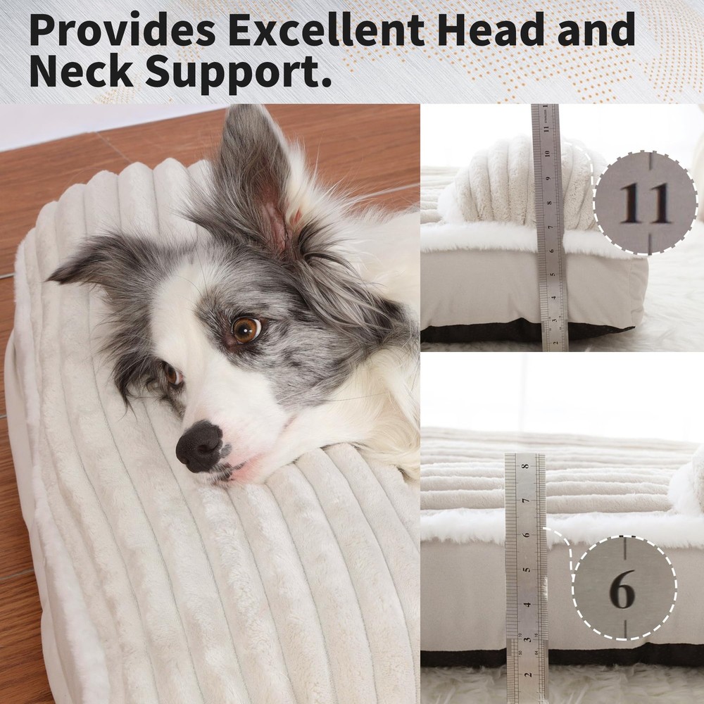 Why Pet Parents Obsess Over This Bed: ZERO Morning-After Regrets Spilled kibble? Muddy paws? Just unzip and toss components in the wash - no more wrestling a queen-sized mattress into your machine 【Orthopedic Memory Foam Dog Bed】 Packed with high-density shredded memory foam, this bed offers 30% more filling than traditional options. It conforms to your dog’s shape, resists flattening, and delivers long-lasting orthopedic comfort—ideal for seniors or joint care needed dogs 【Removable &Washable Dog Bed 】 Simplify cleaning with 2 hidden zippers for effortless removal of the plush cover. Machine-wash it alone—no bulky washing or risk of torn fabric—while the inner foam stays protected. It helps save 60% laundry time & energy VS. non-removable beds 【Comfortable Dog Bed Pillow】End Couch-Stealing. Our exclusive neck bolster elevates your pup's head for sound sleep — ideal for senior and arthritic dogs. Channel-stitched bolsters deliver human-sofa-level comfort. 【Luxury Meets Practicality】 The Cream cover with white fur trim elevates your home décor. while the non-slip bottom ensures stability on any surface—perfect for energetic pups! Psst... guests will beg to know where you got this stylish dog bed! 【Risk-Free Choice】Vacuum-packed when arrival, allow 72 hours to expand, then insert the foam into the cover (watch our 1-minute video!). 30 Days warranty + free replacement if needed—we stand by your pup's comfort! Size XL dog bed for 40 inch dog crates or extra large sized dogs up to 75 lbs.
