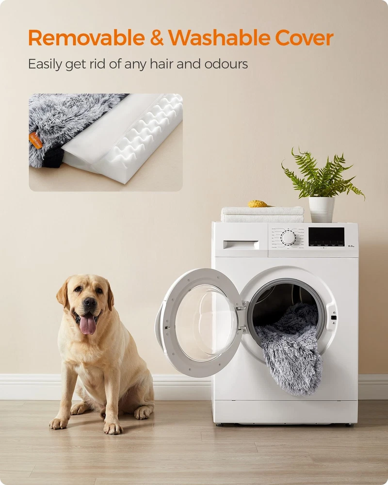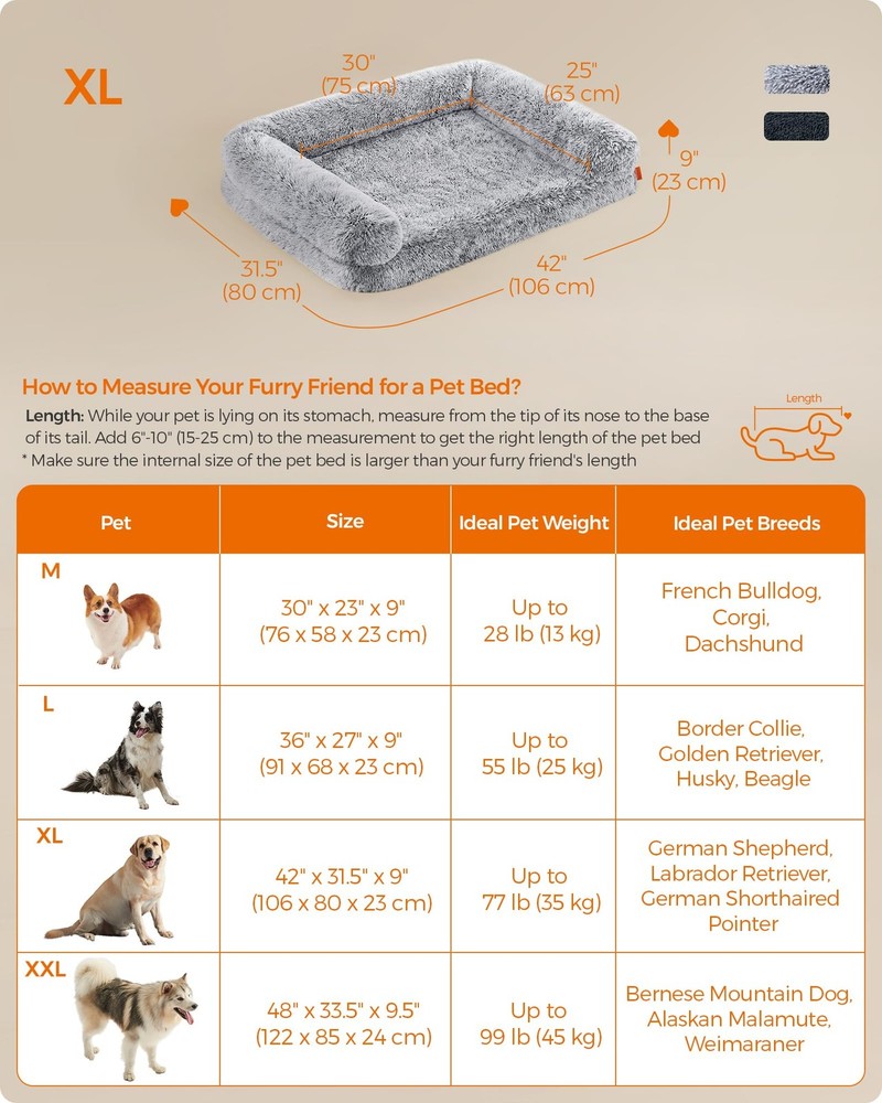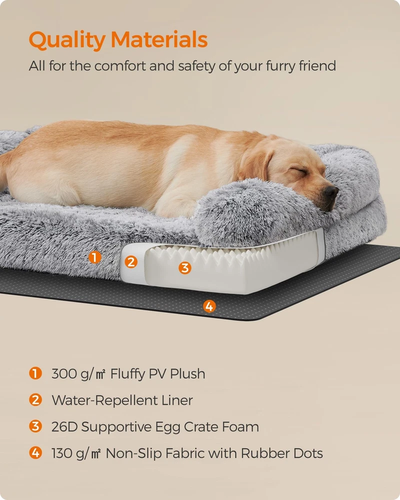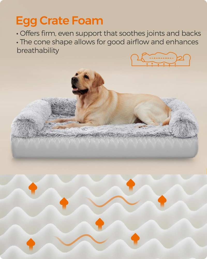 Specifications: - Color: Gray Ombré - Material: PV Plush, Egg Crate Foam - Product Size: 42"L x 31.5"W x 9"H (106 x 80 x 23 cm) - Product Weight: 6.8 lb (3.1 kg) Package Contents: - 1 x Dog Bed Notes: - Sewn products can have a 0.8”-1.2” (2-3 cm) size deviation. Please measure your furry friend to ensure this dog bed fits its size. - This dog bed is delivered in a vacuum pack. You can shake and fluff it for instant use, but it will be even fluffier when letting it sit out for 48 hours to reach its full size. - After cleaning, shake the dog bed to help restore its original condition. - Keep the dog bed away from heat sources of 40℃ and above, such as radiators. If you use underfloor heating, please use the dog bed on the carpet. - Wash the cover in warm water, no more than 40°C. The inner fillers are not washable. [Raised Edges, Comfy Support] The thick, raised edges around the dog sofa bed offer a comfy spot for your dog to rest their head and neck while adding a sense of security. Let your furry friend fully relax after long walks or all-day play [Supportive Padding, Soothing Joints] Padded with egg crate foam, the dog bed provides firm, even support and enhances airflow and breathability. It effectively relieves pressure on the spine and joints, making it great for elderly dogs with aching joints [Cloud-Like Plush, Instant Calm] Covered with fluffy long plush, this calming dog bed offers cloud-like comfort the moment your dog lies down, soothing their nerves. The long plush ensures they stay warm and snug, promoting deeper, more restful sleep [Removable Cover, Easy Cleaning] Unzip the cover, remove the inner fillers, and then wash the cover to get rid of dirt, fur, and smells. Easy work for you, and a more hygienic place for your pet! [Versatile Uses] Make a cozy place your furry friend can call its own beside your sofa, bed, or by a window, or place it in the dog crate or dog house for next-level comfort. This dog bed brings comfort wherever your dog needs it! [Non-Slip ] With anti-slip rubber dots on the bottom to prevent sliding, your dog feels safe when getting in. The liner temporarily prevents liquids from seeping into the padding, giving you time to handle small accidents [Choose the Right Size] This dog bed measures 42" x 31.5" x 9" and is ideal for medium and large dogs up to 77 lb, such as Huskies, Beagles, and Border Collies