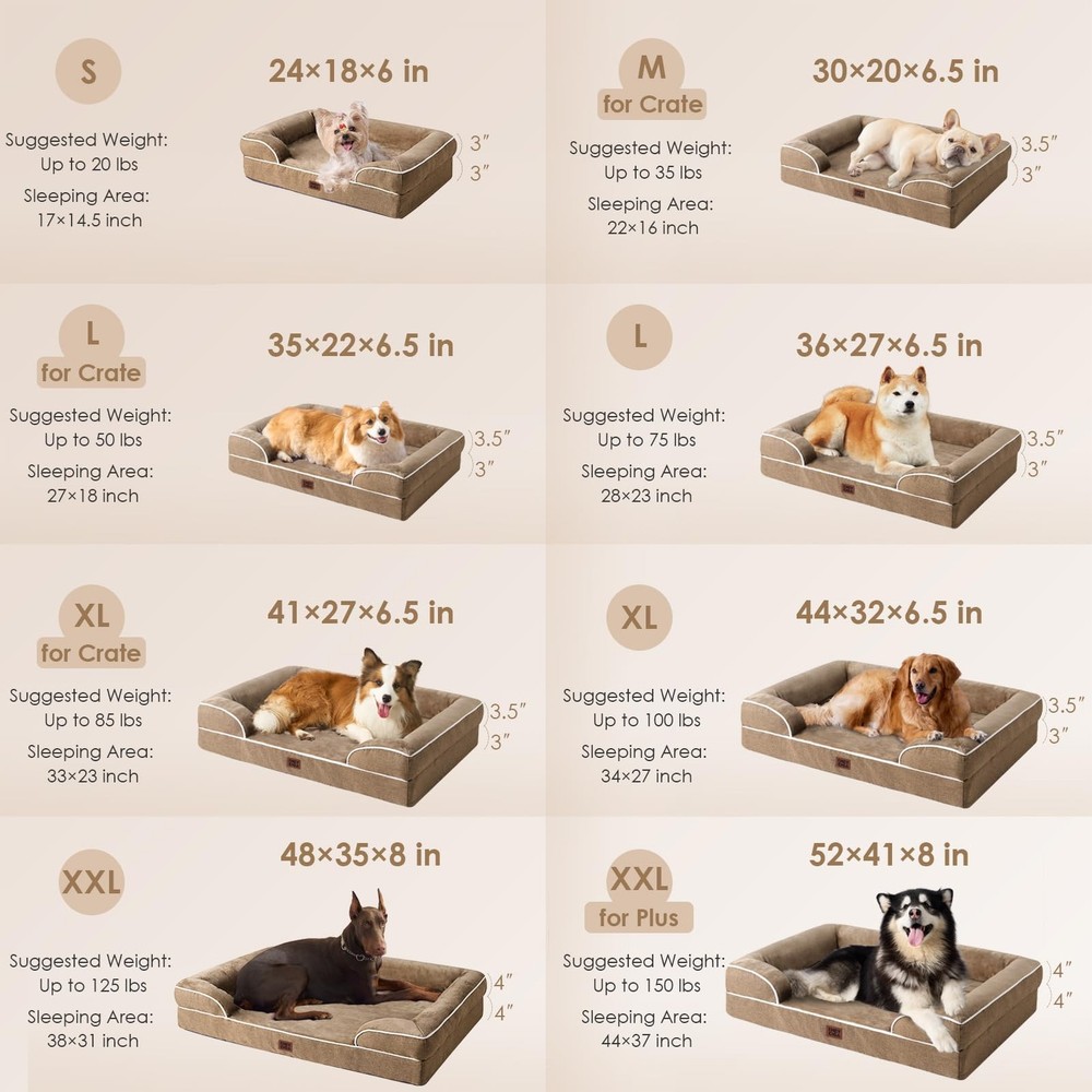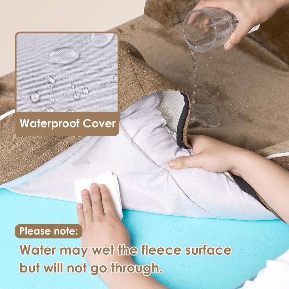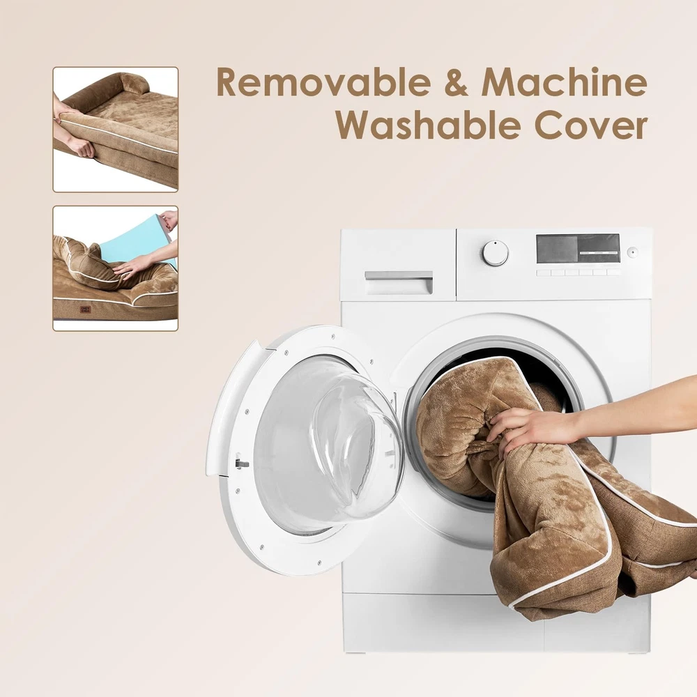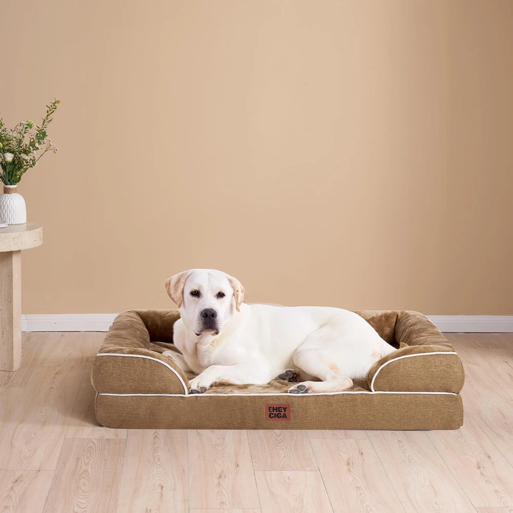 Provide your beloved furry friend with the ultimate comfort and support they deserve with the Orthopedic Dog Bed for Large Dogs. This premium bed is designed to cater specifically to the needs of your large dog, offering a combination of orthopedic support, waterproof durability, and luxurious comfort. Featuring a memory foam base, this dog bed contours to your dog's body shape, providing optimal joint relief and support. The egg-crate foam design further enhances comfort and promotes airflow, keeping your dog cool and cozy. It ensures a restful and rejuvenating sleep, crucial for your dog's overall well-being. The sides of the bed provide a sense of security and coziness, making it the perfect spot for your pooch to curl up and relax. The non-slip bottom ensures stability, preventing the bed from sliding or shifting, even during your dog's playful movements. Cleaning and maintenance are a breeze with the washable and removable cover. Simply unzip the cover and toss it in the washing machine for a fresh and clean bed. The stylish grey color adds a touch of modern elegance to any room, seamlessly blending with your home decor. Whether it's in a crate, kennel, or used as a standalone bed, your dog will appreciate the comfort and support it provides. It is specifically designed for large dogs of all ages, making it an ideal choice for both senior dogs in need of orthopedic support and energetic pups that love to play. MEMORY FOAM: orthopedic dog bed uses memory foam and egg crate foam that can evenly support to relieve pressure, and provides a good amount of softness and support. The memory foam dog bed especially suits elderly dogs to relieve pressure on joints. SOFA BED DESIGN: This bolster dog bed has 3-sided bolster to add additional support for the pet's neck and head, and let them have a restful sleep. Dog bed with sides help your dogs snuggle up and enjoy sleeping. WATERPROOF FILM and NON-SLIP BOTTOM: There is a waterproof film between the fleece surface and the bottom fabric that makes the dog bed waterproof. However, the faux linen on the side is not waterproof. A non-slip point on the bottom is not easy to slide, and keeps your dog bed steady. EXTREME COMFORT and MULTIPLE SIZES: The sleeping surface is covered with flannel, providing a soft and comfortable sleeping area for your pet. No matter how big your pet is, it's a dog bed for medium, large and extra large dogs. MACHINE WASH and CARE INSTRUCTION: Our washable dog bed with removable cover has zipper closure and can be easily cleaned. Just get the foam off and it can be machine washed directly with the sides. Please note that the inner foam is not washable. After receiving it, leave it for 24-48h for rebound.